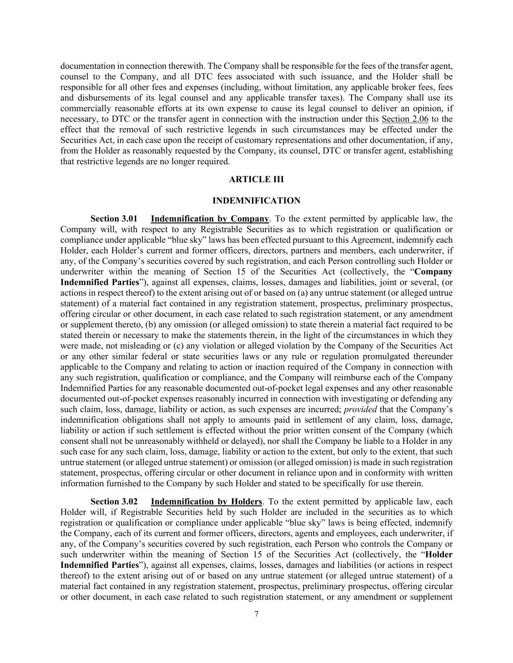 7 documentation in connection therewith. The Company shall be responsible for the fees of the transfer agent, counsel to the Company, and all DTC fees associated with such issuance, and the Holder shall be responsible for all other fees and expenses (including, without limitation, any applicable broker fees, fees and disbursements of its legal counsel and any applicable transfer taxes). The Company shall use its commercially reasonable efforts at its own expense to cause its legal counsel to deliver an opinion, if necessary, to DTC or the transfer agent in connection with the instruction under this Section 2.06 to the effect that the removal of such restrictive legends in such circumstances may be effected under the Securities Act, in each case upon the receipt of customary representations and other documentation, if any, from the Holder as reasonably requested by the Company, its counsel, DTC or transfer agent, establishing that restrictive legends are no longer required. ARTICLE III INDEMNIFICATION Section 3.01 Indemnification by Company. To the extent permitted by applicable law, the Company will, with respect to any Registrable Securities as to which registration or qualification or compliance under applicable “blue sky” laws has been effected pursuant to this Agreement, indemnify each Holder, each Holder’s current and former officers, directors, partners and members, each underwriter, if any, of the Company’s securities covered by such registration, and each Person controlling such Holder or underwriter within the meaning of Section 15 of the Securities Act (collectively, the “Company Indemnified Parties”), against all expenses, claims, losses, damages and liabilities, joint or several, (or actions in respect thereof) to the extent arising out of or based on (a) any untrue statement (or alleged untrue statement) of a material fact contained in any registration statement, prospectus, preliminary prospectus, offering circular or other document, in each case related to such registration statement, or any amendment or supplement thereto, (b) any omission (or alleged omission) to state therein a material fact required to be stated therein or necessary to make the statements therein, in the light of the circumstances in which they were made, not misleading or (c) any violation or alleged violation by the Company of the Securities Act or any other similar federal or state securities laws or any rule or regulation promulgated thereunder applicable to the Company and relating to action or inaction required of the Company in connection with any such registration, qualification or compliance, and the Company will reimburse each of the Company Indemnified Parties for any reasonable documented out-of-pocket legal expenses and any other reasonable documented out-of-pocket expenses reasonably incurred in connection with investigating or defending any such claim, loss, damage, liability or action, as such expenses are incurred; provided that the Company’s indemnification obligations shall not apply to amounts paid in settlement of any claim, loss, damage, liability or action if such settlement is effected without the prior written consent of the Company (which consent shall not be unreasonably withheld or delayed), nor shall the Company be liable to a Holder in any such case for any such claim, loss, damage, liability or action to the extent, but only to the extent, that such untrue statement (or alleged untrue statement) or omission (or alleged omission) is made in such registration statement, prospectus, offering circular or other document in reliance upon and in conformity with written information furnished to the Company by such Holder and stated to be specifically for use therein. Section 3.02 Indemnification by Holders. To the extent permitted by applicable law, each Holder will, if Registrable Securities held by such Holder are included in the securities as to which registration or qualification or compliance under applicable “blue sky” laws is being effected, indemnify the Company, each of its current and former officers, directors, agents and employees, each underwriter, if any, of the Company’s securities covered by such registration, each Person who controls the Company or such underwriter within the meaning of Section 15 of the Securities Act (collectively, the “Holder Indemnified Parties”), against all expenses, claims, losses, damages and liabilities (or actions in respect thereof) to the extent arising out of or based on any untrue statement (or alleged untrue statement) of a material fact contained in any registration statement, prospectus, preliminary prospectus, offering circular or other document, in each case related to such registration statement, or any amendment or supplement