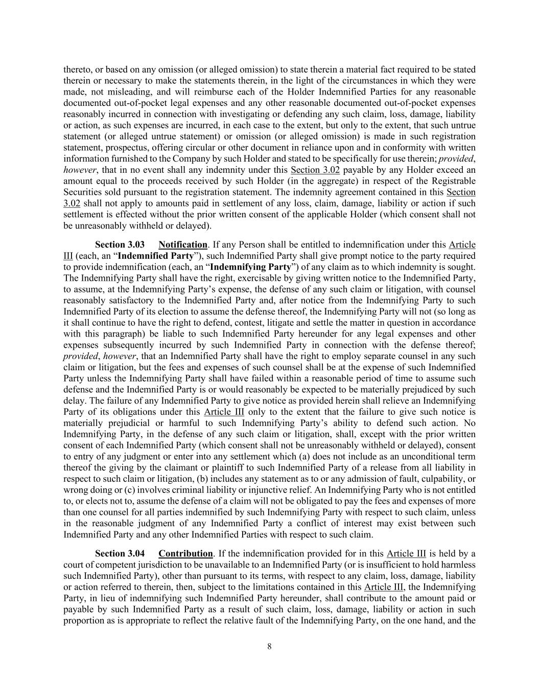 8 thereto, or based on any omission (or alleged omission) to state therein a material fact required to be stated therein or necessary to make the statements therein, in the light of the circumstances in which they were made, not misleading, and will reimburse each of the Holder Indemnified Parties for any reasonable documented out-of-pocket legal expenses and any other reasonable documented out-of-pocket expenses reasonably incurred in connection with investigating or defending any such claim, loss, damage, liability or action, as such expenses are incurred, in each case to the extent, but only to the extent, that such untrue statement (or alleged untrue statement) or omission (or alleged omission) is made in such registration statement, prospectus, offering circular or other document in reliance upon and in conformity with written information furnished to the Company by such Holder and stated to be specifically for use therein; provided, however, that in no event shall any indemnity under this Section 3.02 payable by any Holder exceed an amount equal to the proceeds received by such Holder (in the aggregate) in respect of the Registrable Securities sold pursuant to the registration statement. The indemnity agreement contained in this Section 3.02 shall not apply to amounts paid in settlement of any loss, claim, damage, liability or action if such settlement is effected without the prior written consent of the applicable Holder (which consent shall not be unreasonably withheld or delayed). Section 3.03 Notification. If any Person shall be entitled to indemnification under this Article III (each, an “Indemnified Party”), such Indemnified Party shall give prompt notice to the party required to provide indemnification (each, an “Indemnifying Party”) of any claim as to which indemnity is sought. The Indemnifying Party shall have the right, exercisable by giving written notice to the Indemnified Party, to assume, at the Indemnifying Party’s expense, the defense of any such claim or litigation, with counsel reasonably satisfactory to the Indemnified Party and, after notice from the Indemnifying Party to such Indemnified Party of its election to assume the defense thereof, the Indemnifying Party will not (so long as it shall continue to have the right to defend, contest, litigate and settle the matter in question in accordance with this paragraph) be liable to such Indemnified Party hereunder for any legal expenses and other expenses subsequently incurred by such Indemnified Party in connection with the defense thereof; provided, however, that an Indemnified Party shall have the right to employ separate counsel in any such claim or litigation, but the fees and expenses of such counsel shall be at the expense of such Indemnified Party unless the Indemnifying Party shall have failed within a reasonable period of time to assume such defense and the Indemnified Party is or would reasonably be expected to be materially prejudiced by such delay. The failure of any Indemnified Party to give notice as provided herein shall relieve an Indemnifying Party of its obligations under this Article III only to the extent that the failure to give such notice is materially prejudicial or harmful to such Indemnifying Party’s ability to defend such action. No Indemnifying Party, in the defense of any such claim or litigation, shall, except with the prior written consent of each Indemnified Party (which consent shall not be unreasonably withheld or delayed), consent to entry of any judgment or enter into any settlement which (a) does not include as an unconditional term thereof the giving by the claimant or plaintiff to such Indemnified Party of a release from all liability in respect to such claim or litigation, (b) includes any statement as to or any admission of fault, culpability, or wrong doing or (c) involves criminal liability or injunctive relief. An Indemnifying Party who is not entitled to, or elects not to, assume the defense of a claim will not be obligated to pay the fees and expenses of more than one counsel for all parties indemnified by such Indemnifying Party with respect to such claim, unless in the reasonable judgment of any Indemnified Party a conflict of interest may exist between such Indemnified Party and any other Indemnified Parties with respect to such claim. Section 3.04 Contribution. If the indemnification provided for in this Article III is held by a court of competent jurisdiction to be unavailable to an Indemnified Party (or is insufficient to hold harmless such Indemnified Party), other than pursuant to its terms, with respect to any claim, loss, damage, liability or action referred to therein, then, subject to the limitations contained in this Article III, the Indemnifying Party, in lieu of indemnifying such Indemnified Party hereunder, shall contribute to the amount paid or payable by such Indemnified Party as a result of such claim, loss, damage, liability or action in such proportion as is appropriate to reflect the relative fault of the Indemnifying Party, on the one hand, and the