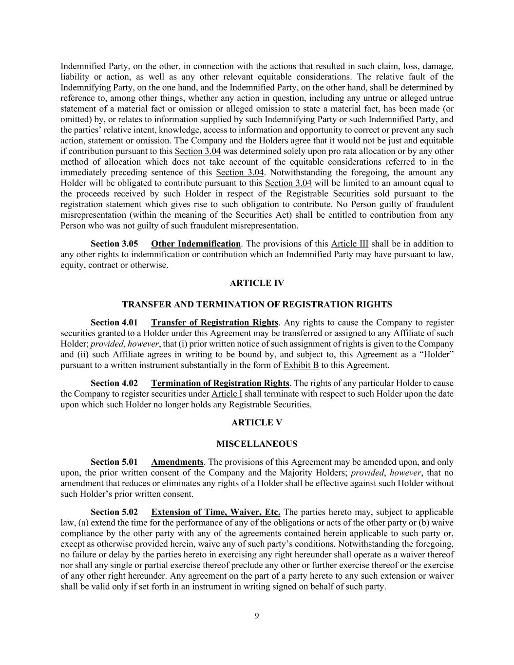 9 Indemnified Party, on the other, in connection with the actions that resulted in such claim, loss, damage, liability or action, as well as any other relevant equitable considerations. The relative fault of the Indemnifying Party, on the one hand, and the Indemnified Party, on the other hand, shall be determined by reference to, among other things, whether any action in question, including any untrue or alleged untrue statement of a material fact or omission or alleged omission to state a material fact, has been made (or omitted) by, or relates to information supplied by such Indemnifying Party or such Indemnified Party, and the parties’ relative intent, knowledge, access to information and opportunity to correct or prevent any such action, statement or omission. The Company and the Holders agree that it would not be just and equitable if contribution pursuant to this Section 3.04 was determined solely upon pro rata allocation or by any other method of allocation which does not take account of the equitable considerations referred to in the immediately preceding sentence of this Section 3.04. Notwithstanding the foregoing, the amount any Holder will be obligated to contribute pursuant to this Section 3.04 will be limited to an amount equal to the proceeds received by such Holder in respect of the Registrable Securities sold pursuant to the registration statement which gives rise to such obligation to contribute. No Person guilty of fraudulent misrepresentation (within the meaning of the Securities Act) shall be entitled to contribution from any Person who was not guilty of such fraudulent misrepresentation. Section 3.05 Other Indemnification. The provisions of this Article III shall be in addition to any other rights to indemnification or contribution which an Indemnified Party may have pursuant to law, equity, contract or otherwise. ARTICLE IV TRANSFER AND TERMINATION OF REGISTRATION RIGHTS Section 4.01 Transfer of Registration Rights. Any rights to cause the Company to register securities granted to a Holder under this Agreement may be transferred or assigned to any Affiliate of such Holder; provided, however, that (i) prior written notice of such assignment of rights is given to the Company and (ii) such Affiliate agrees in writing to be bound by, and subject to, this Agreement as a “Holder” pursuant to a written instrument substantially in the form of Exhibit B to this Agreement. Section 4.02 Termination of Registration Rights. The rights of any particular Holder to cause the Company to register securities under Article I shall terminate with respect to such Holder upon the date upon which such Holder no longer holds any Registrable Securities. ARTICLE V MISCELLANEOUS Section 5.01 Amendments. The provisions of this Agreement may be amended upon, and only upon, the prior written consent of the Company and the Majority Holders; provided, however, that no amendment that reduces or eliminates any rights of a Holder shall be effective against such Holder without such Holder’s prior written consent. Section 5.02 Extension of Time, Waiver, Etc. The parties hereto may, subject to applicable law, (a) extend the time for the performance of any of the obligations or acts of the other party or (b) waive compliance by the other party with any of the agreements contained herein applicable to such party or, except as otherwise provided herein, waive any of such party’s conditions. Notwithstanding the foregoing, no failure or delay by the parties hereto in exercising any right hereunder shall operate as a waiver thereof nor shall any single or partial exercise thereof preclude any other or further exercise thereof or the exercise of any other right hereunder. Any agreement on the part of a party hereto to any such extension or waiver shall be valid only if set forth in an instrument in writing signed on behalf of such party.