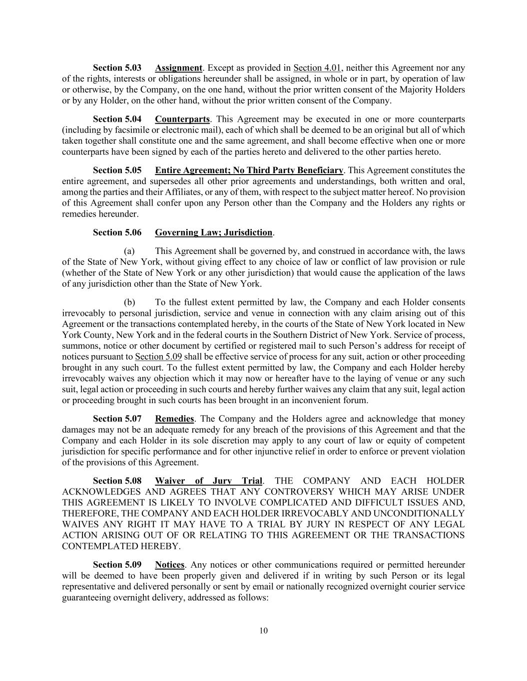 10 Section 5.03 Assignment. Except as provided in Section 4.01, neither this Agreement nor any of the rights, interests or obligations hereunder shall be assigned, in whole or in part, by operation of law or otherwise, by the Company, on the one hand, without the prior written consent of the Majority Holders or by any Holder, on the other hand, without the prior written consent of the Company. Section 5.04 Counterparts. This Agreement may be executed in one or more counterparts (including by facsimile or electronic mail), each of which shall be deemed to be an original but all of which taken together shall constitute one and the same agreement, and shall become effective when one or more counterparts have been signed by each of the parties hereto and delivered to the other parties hereto. Section 5.05 Entire Agreement; No Third Party Beneficiary. This Agreement constitutes the entire agreement, and supersedes all other prior agreements and understandings, both written and oral, among the parties and their Affiliates, or any of them, with respect to the subject matter hereof. No provision of this Agreement shall confer upon any Person other than the Company and the Holders any rights or remedies hereunder. Section 5.06 Governing Law; Jurisdiction. (a) This Agreement shall be governed by, and construed in accordance with, the laws of the State of New York, without giving effect to any choice of law or conflict of law provision or rule (whether of the State of New York or any other jurisdiction) that would cause the application of the laws of any jurisdiction other than the State of New York. (b) To the fullest extent permitted by law, the Company and each Holder consents irrevocably to personal jurisdiction, service and venue in connection with any claim arising out of this Agreement or the transactions contemplated hereby, in the courts of the State of New York located in New York County, New York and in the federal courts in the Southern District of New York. Service of process, summons, notice or other document by certified or registered mail to such Person’s address for receipt of notices pursuant to Section 5.09 shall be effective service of process for any suit, action or other proceeding brought in any such court. To the fullest extent permitted by law, the Company and each Holder hereby irrevocably waives any objection which it may now or hereafter have to the laying of venue or any such suit, legal action or proceeding in such courts and hereby further waives any claim that any suit, legal action or proceeding brought in such courts has been brought in an inconvenient forum. Section 5.07 Remedies. The Company and the Holders agree and acknowledge that money damages may not be an adequate remedy for any breach of the provisions of this Agreement and that the Company and each Holder in its sole discretion may apply to any court of law or equity of competent jurisdiction for specific performance and for other injunctive relief in order to enforce or prevent violation of the provisions of this Agreement. Section 5.08 Waiver of Jury Trial. THE COMPANY AND EACH HOLDER ACKNOWLEDGES AND AGREES THAT ANY CONTROVERSY WHICH MAY ARISE UNDER THIS AGREEMENT IS LIKELY TO INVOLVE COMPLICATED AND DIFFICULT ISSUES AND, THEREFORE, THE COMPANY AND EACH HOLDER IRREVOCABLY AND UNCONDITIONALLY WAIVES ANY RIGHT IT MAY HAVE TO A TRIAL BY JURY IN RESPECT OF ANY LEGAL ACTION ARISING OUT OF OR RELATING TO THIS AGREEMENT OR THE TRANSACTIONS CONTEMPLATED HEREBY. Section 5.09 Notices. Any notices or other communications required or permitted hereunder will be deemed to have been properly given and delivered if in writing by such Person or its legal representative and delivered personally or sent by email or nationally recognized overnight courier service guaranteeing overnight delivery, addressed as follows: