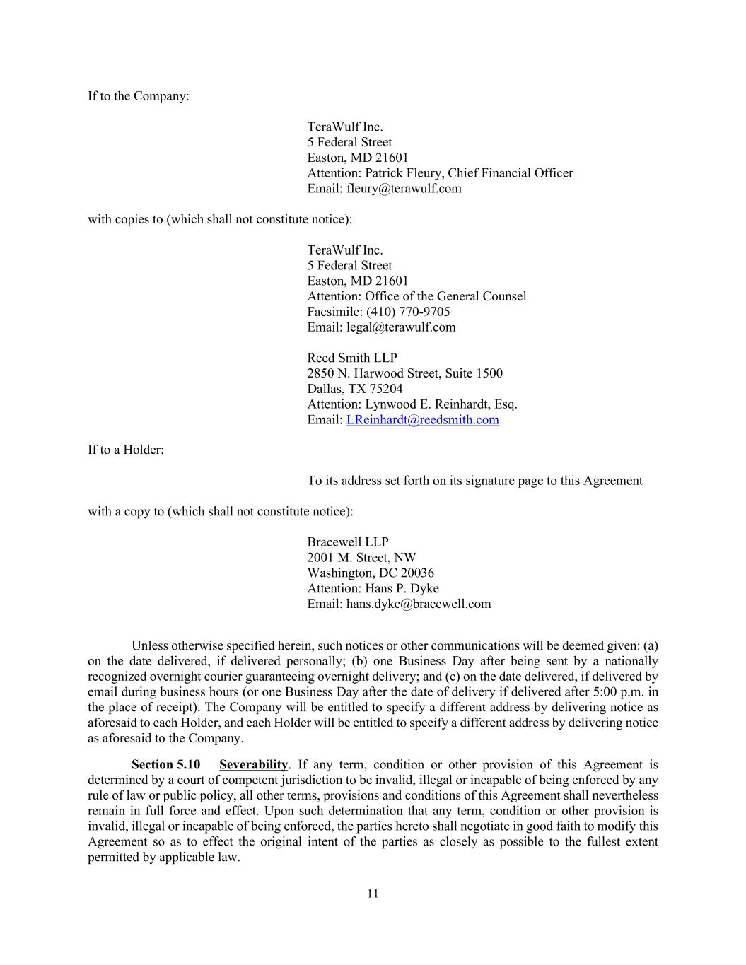 11 If to the Company: TeraWulf Inc. 5 Federal Street Easton, MD 21601 Attention: Patrick Fleury, Chief Financial Officer Email: fleury@terawulf.com with copies to (which shall not constitute notice): TeraWulf Inc. 5 Federal Street Easton, MD 21601 Attention: Office of the General Counsel Facsimile: (410) 770-9705 Email: legal@terawulf.com Reed Smith LLP 2850 N. Harwood Street, Suite 1500 Dallas, TX 75204 Attention: Lynwood E. Reinhardt, Esq. Email: LReinhardt@reedsmith.com If to a Holder: To its address set forth on its signature page to this Agreement with a copy to (which shall not constitute notice): Bracewell LLP 2001 M. Street, NW Washington, DC 20036 Attention: Hans P. Dyke Email: hans.dyke@bracewell.com Unless otherwise specified herein, such notices or other communications will be deemed given: (a) on the date delivered, if delivered personally; (b) one Business Day after being sent by a nationally recognized overnight courier guaranteeing overnight delivery; and (c) on the date delivered, if delivered by email during business hours (or one Business Day after the date of delivery if delivered after 5:00 p.m. in the place of receipt). The Company will be entitled to specify a different address by delivering notice as aforesaid to each Holder, and each Holder will be entitled to specify a different address by delivering notice as aforesaid to the Company. Section 5.10 Severability. If any term, condition or other provision of this Agreement is determined by a court of competent jurisdiction to be invalid, illegal or incapable of being enforced by any rule of law or public policy, all other terms, provisions and conditions of this Agreement shall nevertheless remain in full force and effect. Upon such determination that any term, condition or other provision is invalid, illegal or incapable of being enforced, the parties hereto shall negotiate in good faith to modify this Agreement so as to effect the original intent of the parties as closely as possible to the fullest extent permitted by applicable law.