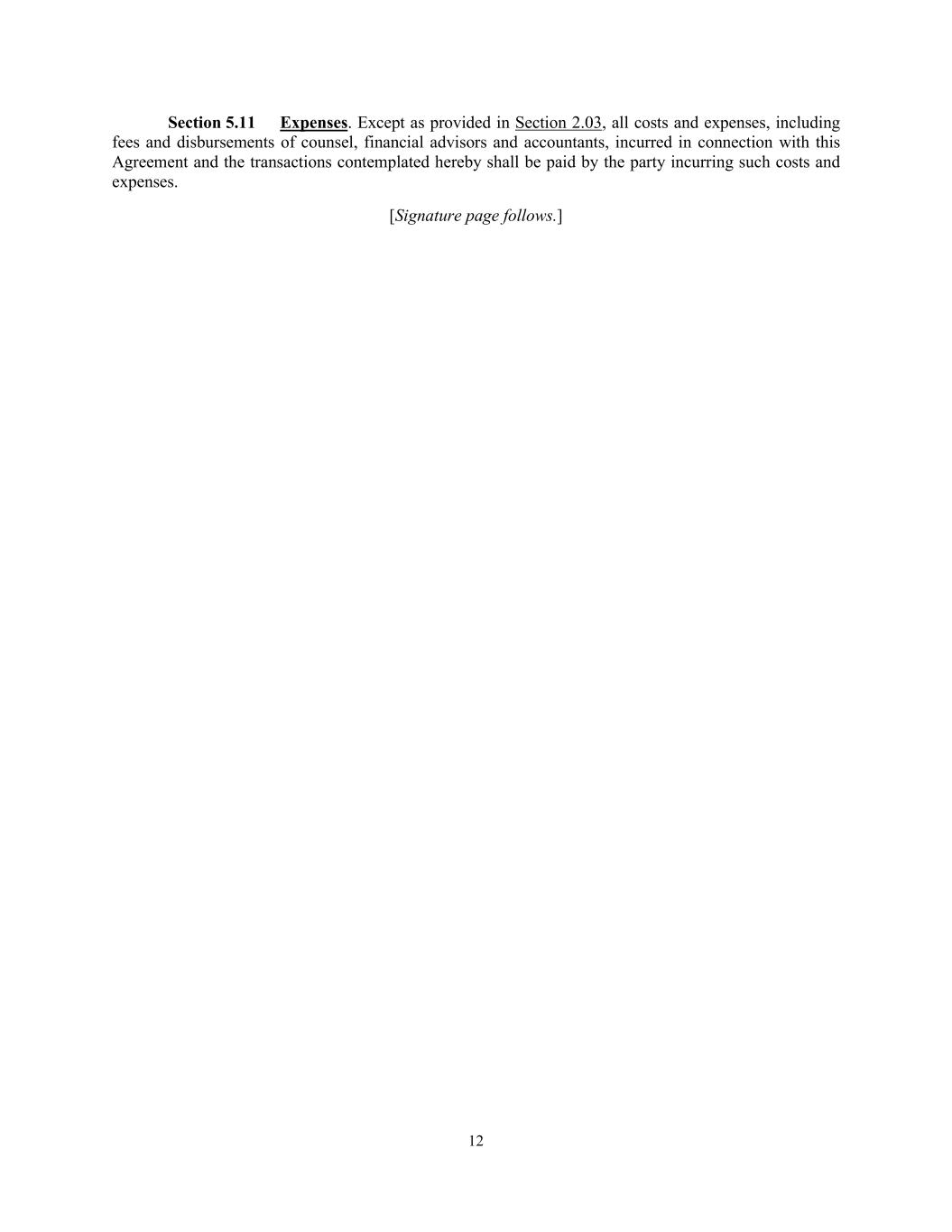 12 Section 5.11 Expenses. Except as provided in Section 2.03, all costs and expenses, including fees and disbursements of counsel, financial advisors and accountants, incurred in connection with this Agreement and the transactions contemplated hereby shall be paid by the party incurring such costs and expenses. [Signature page follows.]
