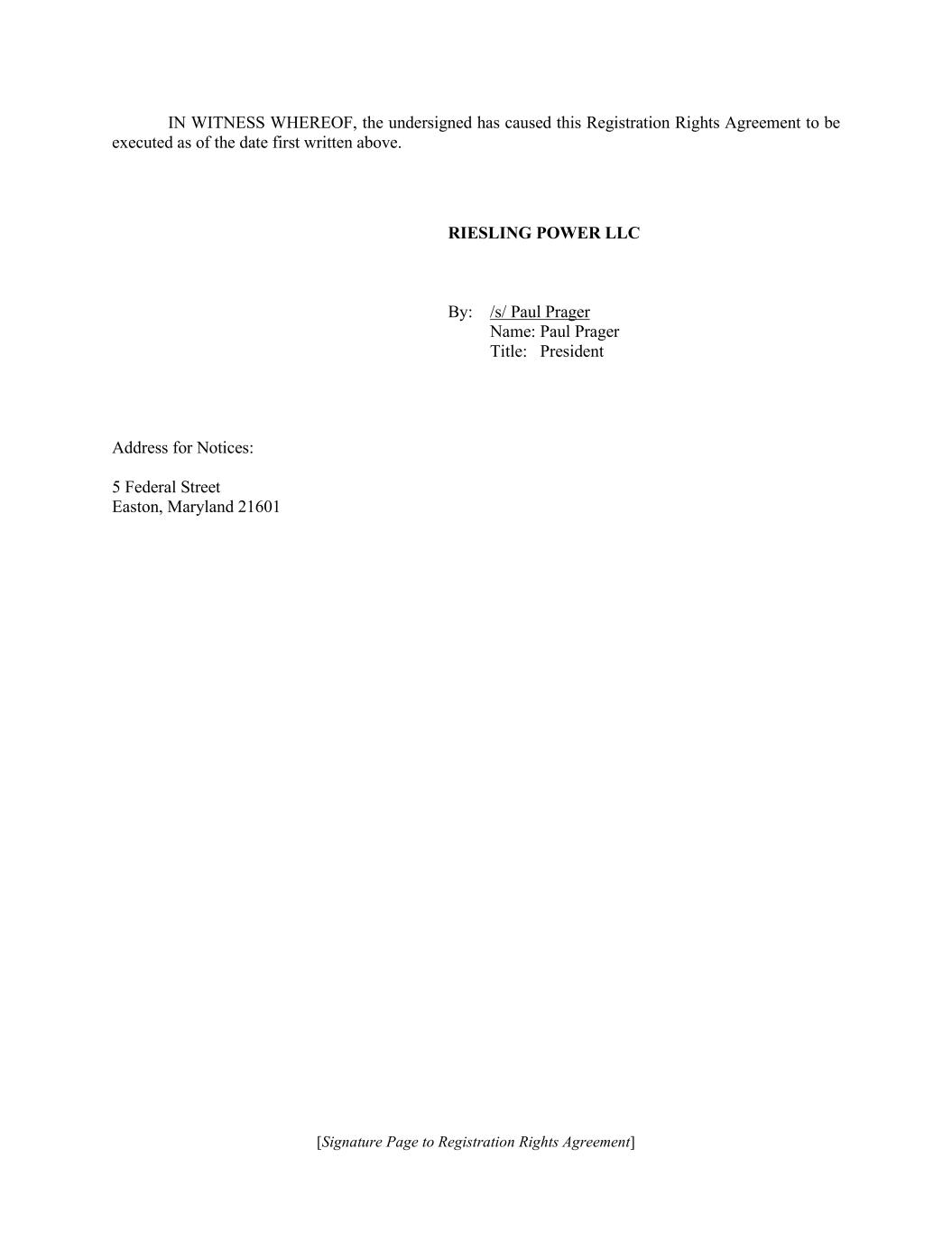 [Signature Page to Registration Rights Agreement] IN WITNESS WHEREOF, the undersigned has caused this Registration Rights Agreement to be executed as of the date first written above. RIESLING POWER LLC By: /s/ Paul Prager Name: Paul Prager Title: President Address for Notices: 5 Federal Street Easton, Maryland 21601