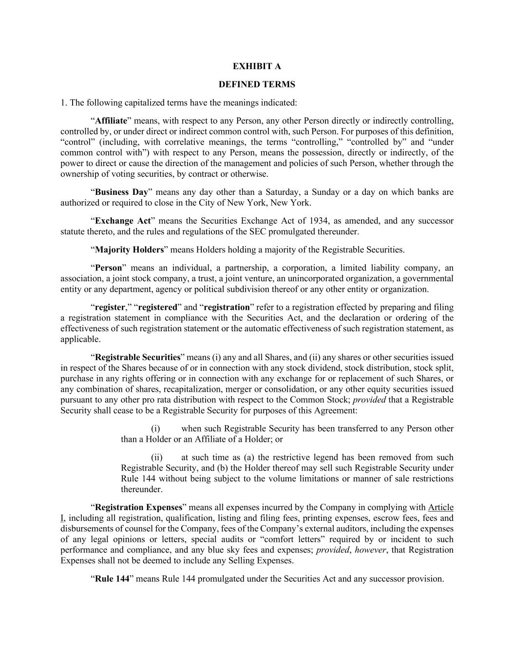 EXHIBIT A DEFINED TERMS 1. The following capitalized terms have the meanings indicated: “Affiliate” means, with respect to any Person, any other Person directly or indirectly controlling, controlled by, or under direct or indirect common control with, such Person. For purposes of this definition, “control” (including, with correlative meanings, the terms “controlling,” “controlled by” and “under common control with”) with respect to any Person, means the possession, directly or indirectly, of the power to direct or cause the direction of the management and policies of such Person, whether through the ownership of voting securities, by contract or otherwise. “Business Day” means any day other than a Saturday, a Sunday or a day on which banks are authorized or required to close in the City of New York, New York. “Exchange Act” means the Securities Exchange Act of 1934, as amended, and any successor statute thereto, and the rules and regulations of the SEC promulgated thereunder. “Majority Holders” means Holders holding a majority of the Registrable Securities. “Person” means an individual, a partnership, a corporation, a limited liability company, an association, a joint stock company, a trust, a joint venture, an unincorporated organization, a governmental entity or any department, agency or political subdivision thereof or any other entity or organization. “register,” “registered” and “registration” refer to a registration effected by preparing and filing a registration statement in compliance with the Securities Act, and the declaration or ordering of the effectiveness of such registration statement or the automatic effectiveness of such registration statement, as applicable. “Registrable Securities” means (i) any and all Shares, and (ii) any shares or other securities issued in respect of the Shares because of or in connection with any stock dividend, stock distribution, stock split, purchase in any rights offering or in connection with any exchange for or replacement of such Shares, or any combination of shares, recapitalization, merger or consolidation, or any other equity securities issued pursuant to any other pro rata distribution with respect to the Common Stock; provided that a Registrable Security shall cease to be a Registrable Security for purposes of this Agreement: (i) when such Registrable Security has been transferred to any Person other than a Holder or an Affiliate of a Holder; or (ii) at such time as (a) the restrictive legend has been removed from such Registrable Security, and (b) the Holder thereof may sell such Registrable Security under Rule 144 without being subject to the volume limitations or manner of sale restrictions thereunder. “Registration Expenses” means all expenses incurred by the Company in complying with Article I, including all registration, qualification, listing and filing fees, printing expenses, escrow fees, fees and disbursements of counsel for the Company, fees of the Company’s external auditors, including the expenses of any legal opinions or letters, special audits or “comfort letters” required by or incident to such performance and compliance, and any blue sky fees and expenses; provided, however, that Registration Expenses shall not be deemed to include any Selling Expenses. “Rule 144” means Rule 144 promulgated under the Securities Act and any successor provision.