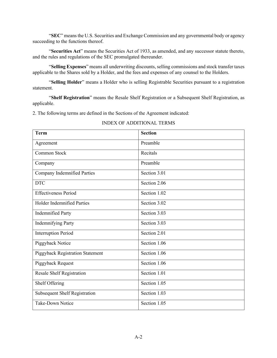 A-2 “SEC” means the U.S. Securities and Exchange Commission and any governmental body or agency succeeding to the functions thereof. “Securities Act” means the Securities Act of 1933, as amended, and any successor statute thereto, and the rules and regulations of the SEC promulgated thereunder. “Selling Expenses” means all underwriting discounts, selling commissions and stock transfer taxes applicable to the Shares sold by a Holder, and the fees and expenses of any counsel to the Holders. “Selling Holder” means a Holder who is selling Registrable Securities pursuant to a registration statement. “Shelf Registration” means the Resale Shelf Registration or a Subsequent Shelf Registration, as applicable. 2. The following terms are defined in the Sections of the Agreement indicated: INDEX OF ADDITIONAL TERMS Term Section Agreement Preamble Common Stock Recitals Company Preamble Company Indemnified Parties Section 3.01 DTC Section 2.06 Effectiveness Period Section 1.02 Holder Indemnified Parties Section 3.02 Indemnified Party Section 3.03 Indemnifying Party Section 3.03 Interruption Period Section 2.01 Piggyback Notice Section 1.06 Piggyback Registration Statement Section 1.06 Piggyback Request Section 1.06 Resale Shelf Registration Section 1.01 Shelf Offering Section 1.05 Subsequent Shelf Registration Section 1.03 Take-Down Notice Section 1.05