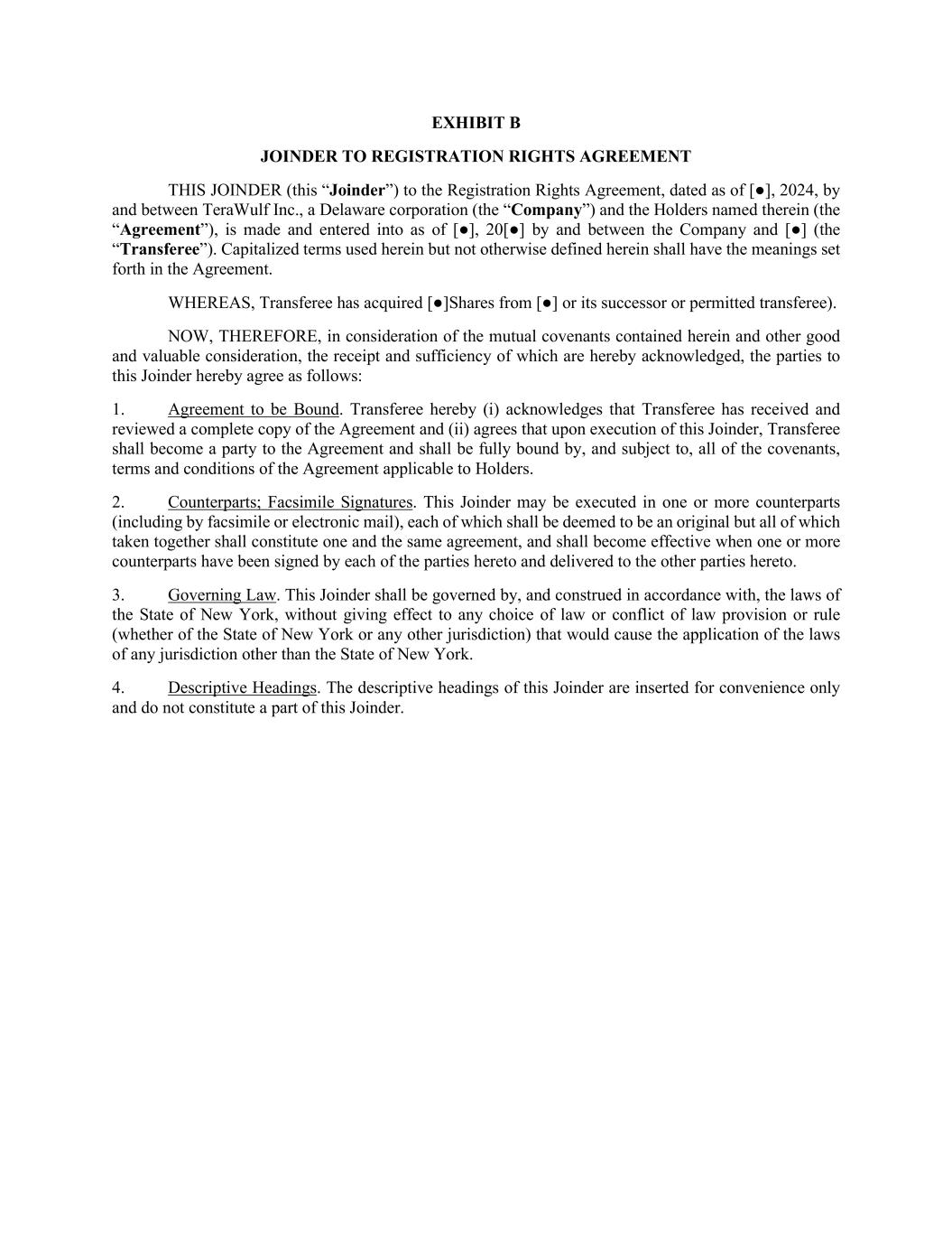 EXHIBIT B JOINDER TO REGISTRATION RIGHTS AGREEMENT THIS JOINDER (this “Joinder”) to the Registration Rights Agreement, dated as of [●], 2024, by and between TeraWulf Inc., a Delaware corporation (the “Company”) and the Holders named therein (the “Agreement”), is made and entered into as of [●], 20[●] by and between the Company and [●] (the “Transferee”). Capitalized terms used herein but not otherwise defined herein shall have the meanings set forth in the Agreement. WHEREAS, Transferee has acquired [●]Shares from [●] or its successor or permitted transferee). NOW, THEREFORE, in consideration of the mutual covenants contained herein and other good and valuable consideration, the receipt and sufficiency of which are hereby acknowledged, the parties to this Joinder hereby agree as follows: 1. Agreement to be Bound. Transferee hereby (i) acknowledges that Transferee has received and reviewed a complete copy of the Agreement and (ii) agrees that upon execution of this Joinder, Transferee shall become a party to the Agreement and shall be fully bound by, and subject to, all of the covenants, terms and conditions of the Agreement applicable to Holders. 2. Counterparts; Facsimile Signatures. This Joinder may be executed in one or more counterparts (including by facsimile or electronic mail), each of which shall be deemed to be an original but all of which taken together shall constitute one and the same agreement, and shall become effective when one or more counterparts have been signed by each of the parties hereto and delivered to the other parties hereto. 3. Governing Law. This Joinder shall be governed by, and construed in accordance with, the laws of the State of New York, without giving effect to any choice of law or conflict of law provision or rule (whether of the State of New York or any other jurisdiction) that would cause the application of the laws of any jurisdiction other than the State of New York. 4. Descriptive Headings. The descriptive headings of this Joinder are inserted for convenience only and do not constitute a part of this Joinder.