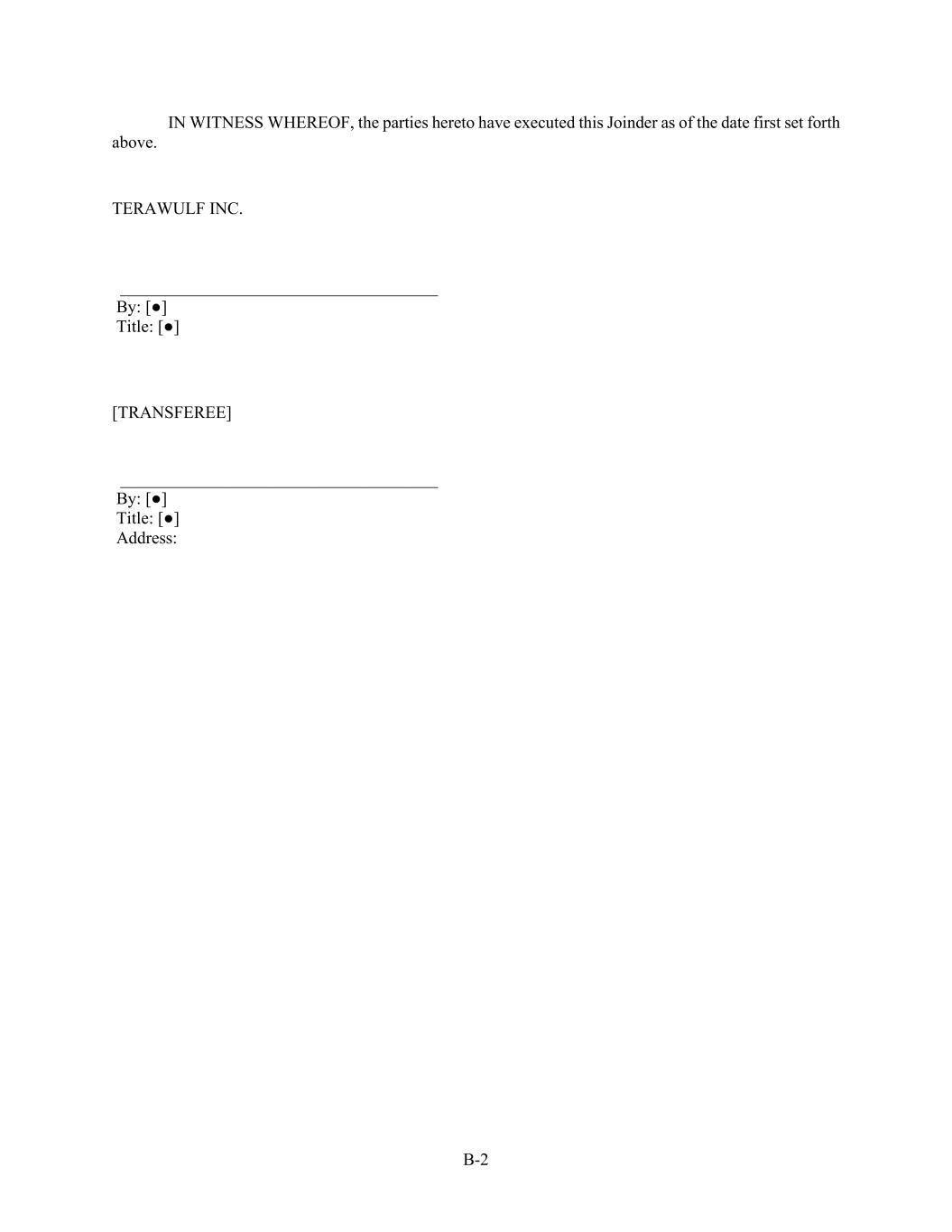 B-2 IN WITNESS WHEREOF, the parties hereto have executed this Joinder as of the date first set forth above. TERAWULF INC. _____________________________________ By: [●] Title: [●] [TRANSFEREE] _____________________________________ By: [●] Title: [●] Address: