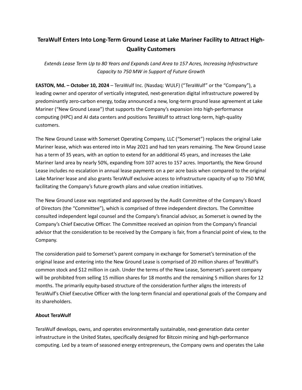 TeraWulf Enters Into Long-Term Ground Lease at Lake Mariner Facility to Attract High- Quality Customers Extends Lease Term Up to 80 Years and Expands Land Area to 157 Acres, Increasing Infrastructure Capacity to 750 MW in Support of Future Growth EASTON, Md. – October 10, 2024 – TeraWulf Inc. (Nasdaq: WULF) (“TeraWulf” or the “Company”), a leading owner and operator of vertically integrated, next-generation digital infrastructure powered by predominantly zero-carbon energy, today announced a new, long-term ground lease agreement at Lake Mariner (“New Ground Lease”) that supports the Company’s expansion into high-performance computing (HPC) and AI data centers and positions TeraWulf to attract long-term, high-quality customers. The New Ground Lease with Somerset Operating Company, LLC (“Somerset”) replaces the original Lake Mariner lease, which was entered into in May 2021 and had ten years remaining. The New Ground Lease has a term of 35 years, with an option to extend for an additional 45 years, and increases the Lake Mariner land area by nearly 50%, expanding from 107 acres to 157 acres. Importantly, the New Ground Lease includes no escalation in annual lease payments on a per acre basis when compared to the original Lake Mariner lease and also grants TeraWulf exclusive access to infrastructure capacity of up to 750 MW, facilitating the Company’s future growth plans and value creation initiatives. The New Ground Lease was negotiated and approved by the Audit Committee of the Company’s Board of Directors (the “Committee”), which is comprised of three independent directors. The Committee consulted independent legal counsel and the Company’s financial advisor, as Somerset is owned by the Company’s Chief Executive Officer. The Committee received an opinion from the Company’s financial advisor that the consideration to be received by the Company is fair, from a financial point of view, to the Company. The consideration paid to Somerset’s parent company in exchange for Somerset’s termination of the original lease and entering into the New Ground Lease is comprised of 20 million shares of TeraWulf’s common stock and $12 million in cash. Under the terms of the New Lease, Somerset’s parent company will be prohibited from selling 15 million shares for 18 months and the remaining 5 million shares for 12 months. The primarily equity-based structure of the consideration further aligns the interests of TeraWulf's Chief Executive Officer with the long-term financial and operational goals of the Company and its shareholders. About TeraWulf TeraWulf develops, owns, and operates environmentally sustainable, next-generation data center infrastructure in the United States, specifically designed for Bitcoin mining and high-performance computing. Led by a team of seasoned energy entrepreneurs, the Company owns and operates the Lake