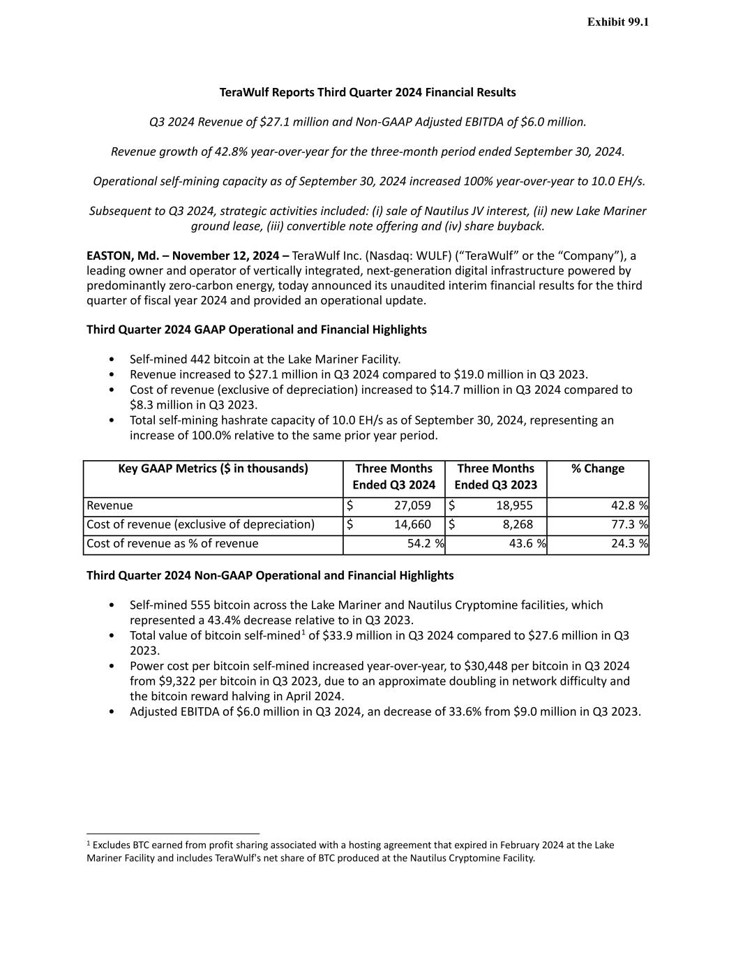Exhibit 99.1 TeraWulf Reports Third Quarter 2024 Financial Results Q3 2024 Revenue of $27.1 million and Non-GAAP Adjusted EBITDA of $6.0 million. Revenue growth of 42.8% year-over-year for the three-month period ended September 30, 2024. Operational self-mining capacity as of September 30, 2024 increased 100% year-over-year to 10.0 EH/s. Subsequent to Q3 2024, strategic activities included: (i) sale of Nautilus JV interest, (ii) new Lake Mariner ground lease, (iii) convertible note offering and (iv) share buyback. EASTON, Md. – November 12, 2024 – TeraWulf Inc. (Nasdaq: WULF) (“TeraWulf” or the “Company”), a leading owner and operator of vertically integrated, next-generation digital infrastructure powered by predominantly zero-carbon energy, today announced its unaudited interim financial results for the third quarter of fiscal year 2024 and provided an operational update. Third Quarter 2024 GAAP Operational and Financial Highlights • Self-mined 442 bitcoin at the Lake Mariner Facility. • Revenue increased to $27.1 million in Q3 2024 compared to $19.0 million in Q3 2023. • Cost of revenue (exclusive of depreciation) increased to $14.7 million in Q3 2024 compared to $8.3 million in Q3 2023. • Total self-mining hashrate capacity of 10.0 EH/s as of September 30, 2024, representing an increase of 100.0% relative to the same prior year period. Key GAAP Metrics ($ in thousands) Three Months Ended Q3 2024 Three Months Ended Q3 2023 % Change Revenue $ 27,059 $ 18,955 42.8 % Cost of revenue (exclusive of depreciation) $ 14,660 $ 8,268 77.3 % Cost of revenue as % of revenue 54.2 % 43.6 % 24.3 % Third Quarter 2024 Non-GAAP Operational and Financial Highlights • Self-mined 555 bitcoin across the Lake Mariner and Nautilus Cryptomine facilities, which represented a 43.4% decrease relative to in Q3 2023. • Total value of bitcoin self-mined1 of $33.9 million in Q3 2024 compared to $27.6 million in Q3 2023. • Power cost per bitcoin self-mined increased year-over-year, to $30,448 per bitcoin in Q3 2024 from $9,322 per bitcoin in Q3 2023, due to an approximate doubling in network difficulty and the bitcoin reward halving in April 2024. • Adjusted EBITDA of $6.0 million in Q3 2024, an decrease of 33.6% from $9.0 million in Q3 2023. 1 Excludes BTC earned from profit sharing associated with a hosting agreement that expired in February 2024 at the Lake Mariner Facility and includes TeraWulf's net share of BTC produced at the Nautilus Cryptomine Facility.