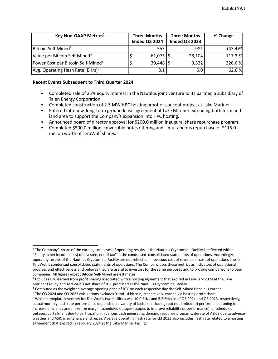 Exhibit 99.1 Key Non-GAAP Metrics2 Three Months Ended Q3 2024 Three Months Ended Q3 2023 % Change Bitcoin Self-Mined3 555 981 (43.4) % Value per Bitcoin Self-Mined4 $ 61,075 $ 28,104 117.3 % Power Cost per Bitcoin Self-Mined5 $ 30,448 $ 9,322 226.6 % Avg. Operating Hash Rate (EH/s)6 8.1 5.0 62.0 % Recent Events Subsequent to Third Quarter 2024 • Completed sale of 25% equity interest in the Nautilus joint venture to its partner, a subsidiary of Talen Energy Corporation. • Completed construction of 2.5 MW HPC hosting proof-of-concept project at Lake Mariner. • Entered into new, long-term ground lease agreement at Lake Mariner extending both term and land area to support the Company’s expansion into HPC hosting. • Announced board of director approval for $200.0 million inaugural share repurchase program. • Completed $500.0 million convertible notes offering and simultaneous repurchase of $115.0 million worth of TeraWulf shares. 2 The Company’s share of the earnings or losses of operating results at the Nautilus Cryptomine Facility is reflected within “Equity in net income (loss) of investee, net of tax” in the condensed consolidated statements of operations. Accordingly, operating results of the Nautilus Cryptomine Facility are not reflected in revenue, cost of revenue or cost of operations lines in TeraWulf’s condensed consolidated statements of operations. The Company uses these metrics as indicators of operational progress and effectiveness and believes they are useful to investors for the same purposes and to provide comparisons to peer companies. All figures except Bitcoin Self-Mined are estimates. 3 Excludes BTC earned from profit sharing associated with a hosting agreement that expired in February 2024 at the Lake Mariner Facility and TeraWulf’s net share of BTC produced at the Nautilus Cryptomine Facility. 4 Computed as the weighted-average opening price of BTC on each respective day the Self-Mined Bitcoin is earned. 5 The Q3 2024 and Q3 2023 calculations excludes 0 and 14 bitcoin, respectively, earned via hosting profit share. 6 While nameplate inventory for TeraWulf’s two facilities was 10.0 EH/s and 5.5 EH/s as of Q3 2024 and Q3 2023, respectively, actual monthly hash rate performance depends on a variety of factors, including (but not limited to) performance tuning to increase efficiency and maximize margin, scheduled outages (scopes to improve reliability or performance), unscheduled outages, curtailment due to participation in various cash generating demand response programs, derate of ASICS due to adverse weather and ASIC maintenance and repair. Average operating hash rate for Q3 2023 also includes hash rate related to a hosting agreement that expired in February 2024 at the Lake Mariner Facility.