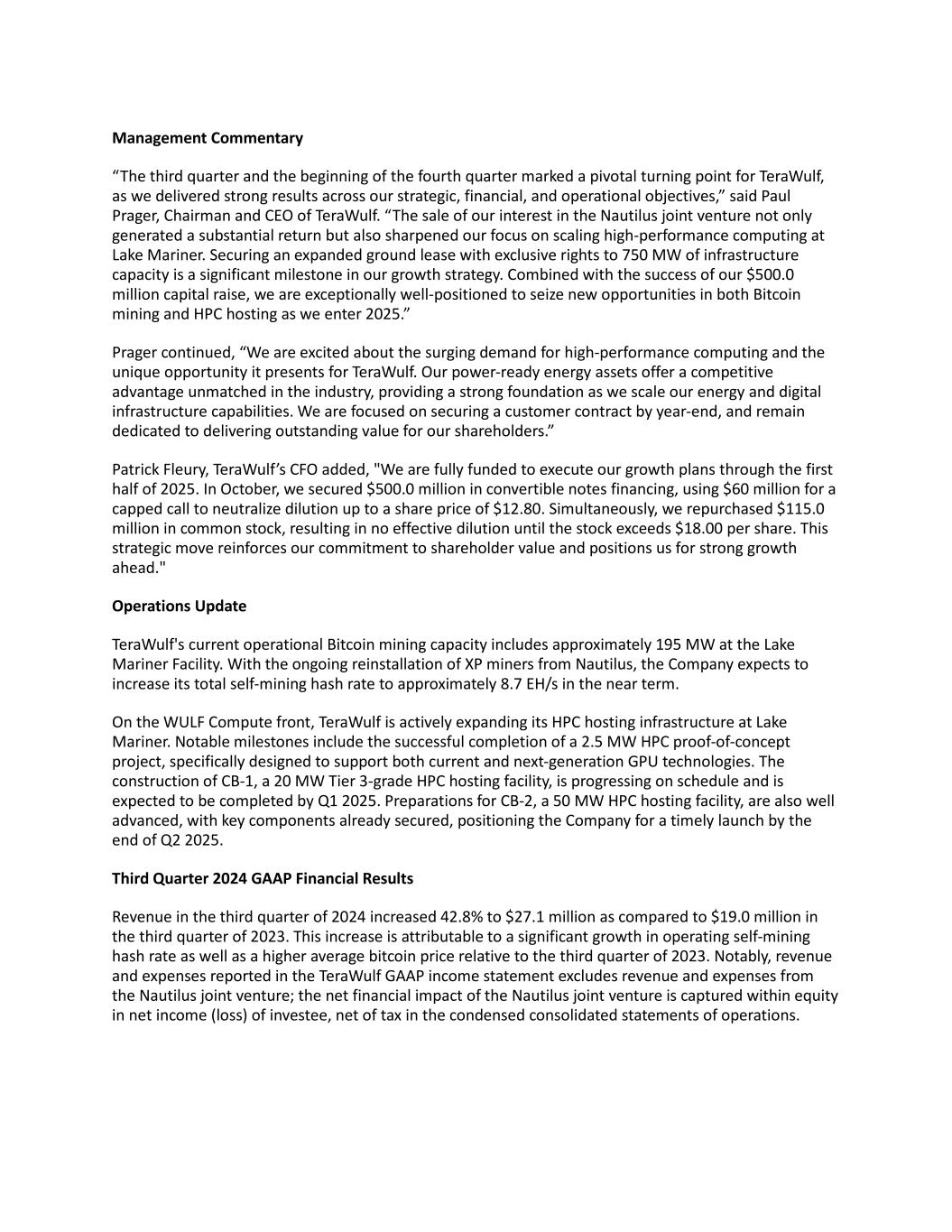 Management Commentary “The third quarter and the beginning of the fourth quarter marked a pivotal turning point for TeraWulf, as we delivered strong results across our strategic, financial, and operational objectives,” said Paul Prager, Chairman and CEO of TeraWulf. “The sale of our interest in the Nautilus joint venture not only generated a substantial return but also sharpened our focus on scaling high-performance computing at Lake Mariner. Securing an expanded ground lease with exclusive rights to 750 MW of infrastructure capacity is a significant milestone in our growth strategy. Combined with the success of our $500.0 million capital raise, we are exceptionally well-positioned to seize new opportunities in both Bitcoin mining and HPC hosting as we enter 2025.” Prager continued, “We are excited about the surging demand for high-performance computing and the unique opportunity it presents for TeraWulf. Our power-ready energy assets offer a competitive advantage unmatched in the industry, providing a strong foundation as we scale our energy and digital infrastructure capabilities. We are focused on securing a customer contract by year-end, and remain dedicated to delivering outstanding value for our shareholders.” Patrick Fleury, TeraWulf’s CFO added, "We are fully funded to execute our growth plans through the first half of 2025. In October, we secured $500.0 million in convertible notes financing, using $60 million for a capped call to neutralize dilution up to a share price of $12.80. Simultaneously, we repurchased $115.0 million in common stock, resulting in no effective dilution until the stock exceeds $18.00 per share. This strategic move reinforces our commitment to shareholder value and positions us for strong growth ahead." Operations Update TeraWulf's current operational Bitcoin mining capacity includes approximately 195 MW at the Lake Mariner Facility. With the ongoing reinstallation of XP miners from Nautilus, the Company expects to increase its total self-mining hash rate to approximately 8.7 EH/s in the near term. On the WULF Compute front, TeraWulf is actively expanding its HPC hosting infrastructure at Lake Mariner. Notable milestones include the successful completion of a 2.5 MW HPC proof-of-concept project, specifically designed to support both current and next-generation GPU technologies. The construction of CB-1, a 20 MW Tier 3-grade HPC hosting facility, is progressing on schedule and is expected to be completed by Q1 2025. Preparations for CB-2, a 50 MW HPC hosting facility, are also well advanced, with key components already secured, positioning the Company for a timely launch by the end of Q2 2025. Third Quarter 2024 GAAP Financial Results Revenue in the third quarter of 2024 increased 42.8% to $27.1 million as compared to $19.0 million in the third quarter of 2023. This increase is attributable to a significant growth in operating self-mining hash rate as well as a higher average bitcoin price relative to the third quarter of 2023. Notably, revenue and expenses reported in the TeraWulf GAAP income statement excludes revenue and expenses from the Nautilus joint venture; the net financial impact of the Nautilus joint venture is captured within equity in net income (loss) of investee, net of tax in the condensed consolidated statements of operations.