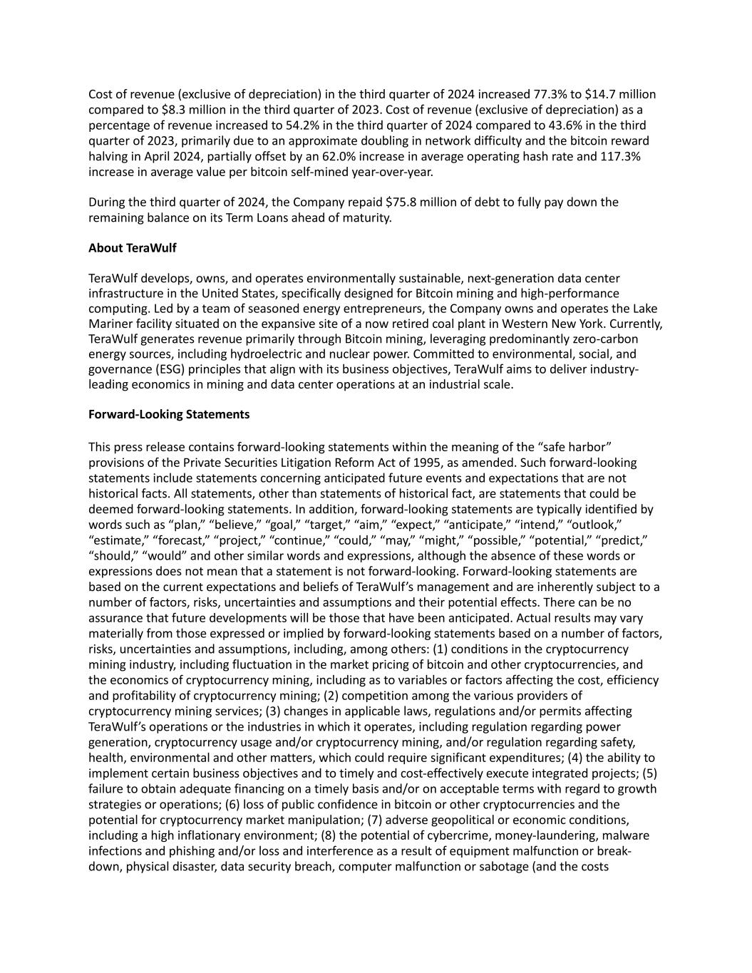 Cost of revenue (exclusive of depreciation) in the third quarter of 2024 increased 77.3% to $14.7 million compared to $8.3 million in the third quarter of 2023. Cost of revenue (exclusive of depreciation) as a percentage of revenue increased to 54.2% in the third quarter of 2024 compared to 43.6% in the third quarter of 2023, primarily due to an approximate doubling in network difficulty and the bitcoin reward halving in April 2024, partially offset by an 62.0% increase in average operating hash rate and 117.3% increase in average value per bitcoin self-mined year-over-year. During the third quarter of 2024, the Company repaid $75.8 million of debt to fully pay down the remaining balance on its Term Loans ahead of maturity. About TeraWulf TeraWulf develops, owns, and operates environmentally sustainable, next-generation data center infrastructure in the United States, specifically designed for Bitcoin mining and high-performance computing. Led by a team of seasoned energy entrepreneurs, the Company owns and operates the Lake Mariner facility situated on the expansive site of a now retired coal plant in Western New York. Currently, TeraWulf generates revenue primarily through Bitcoin mining, leveraging predominantly zero-carbon energy sources, including hydroelectric and nuclear power. Committed to environmental, social, and governance (ESG) principles that align with its business objectives, TeraWulf aims to deliver industry- leading economics in mining and data center operations at an industrial scale. Forward-Looking Statements This press release contains forward-looking statements within the meaning of the “safe harbor” provisions of the Private Securities Litigation Reform Act of 1995, as amended. Such forward-looking statements include statements concerning anticipated future events and expectations that are not historical facts. All statements, other than statements of historical fact, are statements that could be deemed forward-looking statements. In addition, forward-looking statements are typically identified by words such as “plan,” “believe,” “goal,” “target,” “aim,” “expect,” “anticipate,” “intend,” “outlook,” “estimate,” “forecast,” “project,” “continue,” “could,” “may,” “might,” “possible,” “potential,” “predict,” “should,” “would” and other similar words and expressions, although the absence of these words or expressions does not mean that a statement is not forward-looking. Forward-looking statements are based on the current expectations and beliefs of TeraWulf’s management and are inherently subject to a number of factors, risks, uncertainties and assumptions and their potential effects. There can be no assurance that future developments will be those that have been anticipated. Actual results may vary materially from those expressed or implied by forward-looking statements based on a number of factors, risks, uncertainties and assumptions, including, among others: (1) conditions in the cryptocurrency mining industry, including fluctuation in the market pricing of bitcoin and other cryptocurrencies, and the economics of cryptocurrency mining, including as to variables or factors affecting the cost, efficiency and profitability of cryptocurrency mining; (2) competition among the various providers of cryptocurrency mining services; (3) changes in applicable laws, regulations and/or permits affecting TeraWulf’s operations or the industries in which it operates, including regulation regarding power generation, cryptocurrency usage and/or cryptocurrency mining, and/or regulation regarding safety, health, environmental and other matters, which could require significant expenditures; (4) the ability to implement certain business objectives and to timely and cost-effectively execute integrated projects; (5) failure to obtain adequate financing on a timely basis and/or on acceptable terms with regard to growth strategies or operations; (6) loss of public confidence in bitcoin or other cryptocurrencies and the potential for cryptocurrency market manipulation; (7) adverse geopolitical or economic conditions, including a high inflationary environment; (8) the potential of cybercrime, money-laundering, malware infections and phishing and/or loss and interference as a result of equipment malfunction or break- down, physical disaster, data security breach, computer malfunction or sabotage (and the costs