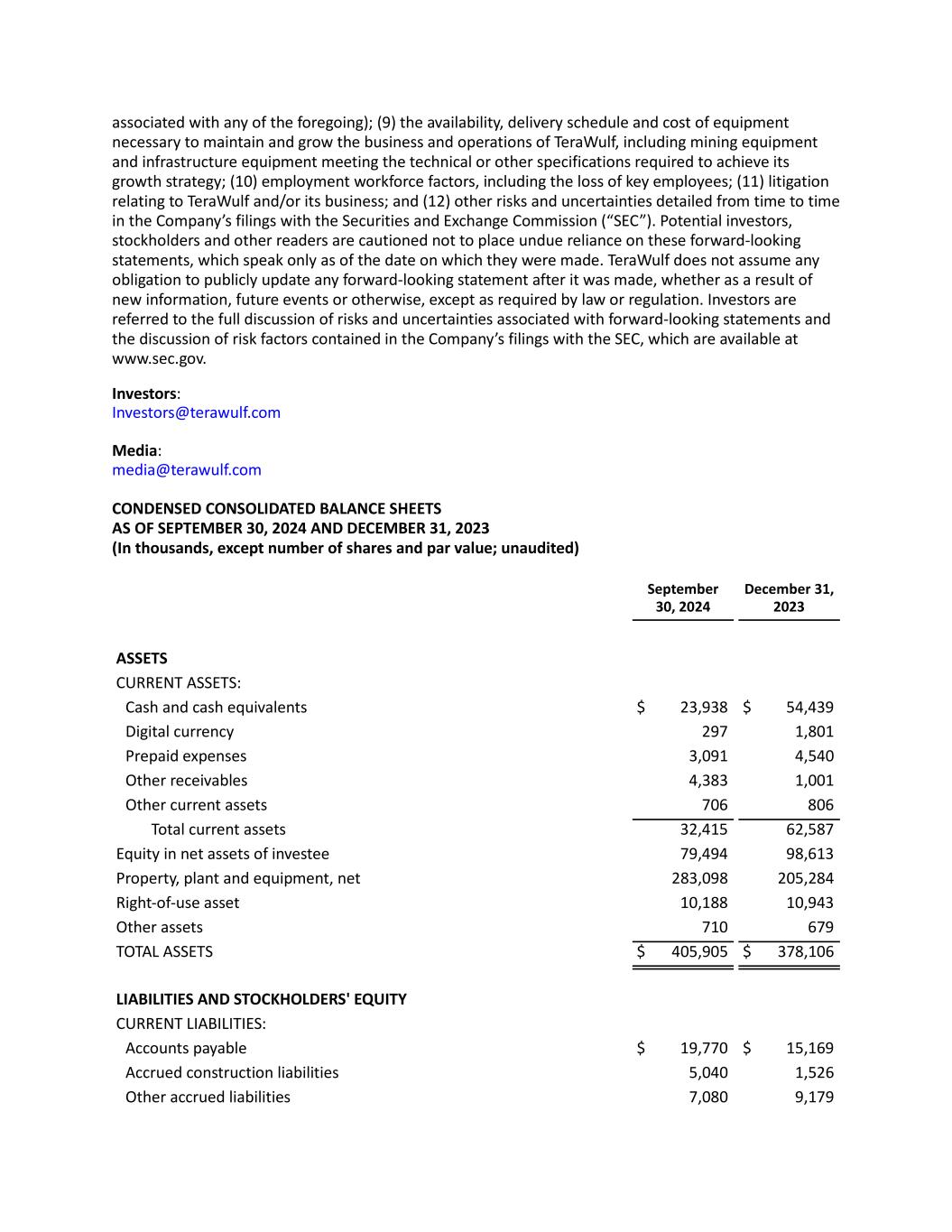 associated with any of the foregoing); (9) the availability, delivery schedule and cost of equipment necessary to maintain and grow the business and operations of TeraWulf, including mining equipment and infrastructure equipment meeting the technical or other specifications required to achieve its growth strategy; (10) employment workforce factors, including the loss of key employees; (11) litigation relating to TeraWulf and/or its business; and (12) other risks and uncertainties detailed from time to time in the Company’s filings with the Securities and Exchange Commission (“SEC”). Potential investors, stockholders and other readers are cautioned not to place undue reliance on these forward-looking statements, which speak only as of the date on which they were made. TeraWulf does not assume any obligation to publicly update any forward-looking statement after it was made, whether as a result of new information, future events or otherwise, except as required by law or regulation. Investors are referred to the full discussion of risks and uncertainties associated with forward-looking statements and the discussion of risk factors contained in the Company’s filings with the SEC, which are available at www.sec.gov. Investors: Investors@terawulf.com Media: media@terawulf.com CONDENSED CONSOLIDATED BALANCE SHEETS AS OF SEPTEMBER 30, 2024 AND DECEMBER 31, 2023 (In thousands, except number of shares and par value; unaudited) September 30, 2024 December 31, 2023 ASSETS CURRENT ASSETS: Cash and cash equivalents $ 23,938 $ 54,439 Digital currency 297 1,801 Prepaid expenses 3,091 4,540 Other receivables 4,383 1,001 Other current assets 706 806 Total current assets 32,415 62,587 Equity in net assets of investee 79,494 98,613 Property, plant and equipment, net 283,098 205,284 Right-of-use asset 10,188 10,943 Other assets 710 679 TOTAL ASSETS $ 405,905 $ 378,106 LIABILITIES AND STOCKHOLDERS' EQUITY CURRENT LIABILITIES: Accounts payable $ 19,770 $ 15,169 Accrued construction liabilities 5,040 1,526 Other accrued liabilities 7,080 9,179