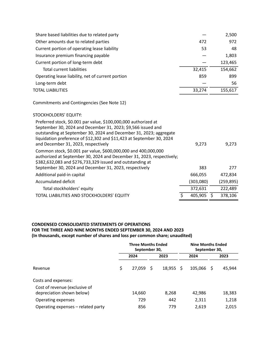 Share based liabilities due to related party — 2,500 Other amounts due to related parties 472 972 Current portion of operating lease liability 53 48 Insurance premium financing payable — 1,803 Current portion of long-term debt — 123,465 Total current liabilities 32,415 154,662 Operating lease liability, net of current portion 859 899 Long-term debt — 56 TOTAL LIABILITIES 33,274 155,617 Commitments and Contingencies (See Note 12) STOCKHOLDERS' EQUITY: Preferred stock, $0.001 par value, $100,000,000 authorized at September 30, 2024 and December 31, 2023; $9,566 issued and outstanding at September 30, 2024 and December 31, 2023; aggregate liquidation preference of $12,302 and $11,423 at September 30, 2024 and December 31, 2023, respectively 9,273 9,273 Common stock, $0.001 par value, $600,000,000 and 400,000,000 authorized at September 30, 2024 and December 31, 2023, respectively; $382,632,083 and $276,733,329 issued and outstanding at September 30, 2024 and December 31, 2023, respectively 383 277 Additional paid-in capital 666,055 472,834 Accumulated deficit (303,080) (259,895) Total stockholders’ equity 372,631 222,489 TOTAL LIABILITIES AND STOCKHOLDERS’ EQUITY $ 405,905 $ 378,106 CONDENSED CONSOLIDATED STATEMENTS OF OPERATIONS FOR THE THREE AND NINE MONTHS ENDED SEPTEMBER 30, 2024 AND 2023 (In thousands, except number of shares and loss per common share; unaudited) Three Months Ended September 30, Nine Months Ended September 30, 2024 2023 2024 2023 Revenue $ 27,059 $ 18,955 $ 105,066 $ 45,944 Costs and expenses: Cost of revenue (exclusive of depreciation shown below) 14,660 8,268 42,986 18,383 Operating expenses 729 442 2,311 1,218 Operating expenses – related party 856 779 2,619 2,015