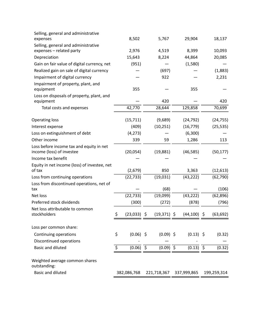 Selling, general and administrative expenses 8,502 5,767 29,904 18,137 Selling, general and administrative expenses – related party 2,976 4,519 8,399 10,093 Depreciation 15,643 8,224 44,864 20,085 Gain on fair value of digital currency, net (951) — (1,580) — Realized gain on sale of digital currency — (697) — (1,883) Impairment of digital currency — 922 — 2,231 Impairment of property, plant, and equipment 355 — 355 — Loss on disposals of property, plant, and equipment — 420 — 420 Total costs and expenses 42,770 28,644 129,858 70,699 Operating loss (15,711) (9,689) (24,792) (24,755) Interest expense (409) (10,251) (16,779) (25,535) Loss on extinguishment of debt (4,273) — (6,300) — Other income 339 59 1,286 113 Loss before income tax and equity in net income (loss) of investee (20,054) (19,881) (46,585) (50,177) Income tax benefit — — — — Equity in net income (loss) of investee, net of tax (2,679) 850 3,363 (12,613) Loss from continuing operations (22,733) (19,031) (43,222) (62,790) Loss from discontinued operations, net of tax — (68) — (106) Net loss (22,733) (19,099) (43,222) (62,896) Preferred stock dividends (300) (272) (878) (796) Net loss attributable to common stockholders $ (23,033) $ (19,371) $ (44,100) $ (63,692) Loss per common share: Continuing operations $ (0.06) $ (0.09) $ (0.13) $ (0.32) Discontinued operations - — - — Basic and diluted $ (0.06) $ (0.09) $ (0.13) $ (0.32) Weighted average common shares outstanding: Basic and diluted 382,086,768 221,718,367 337,999,865 199,259,314
