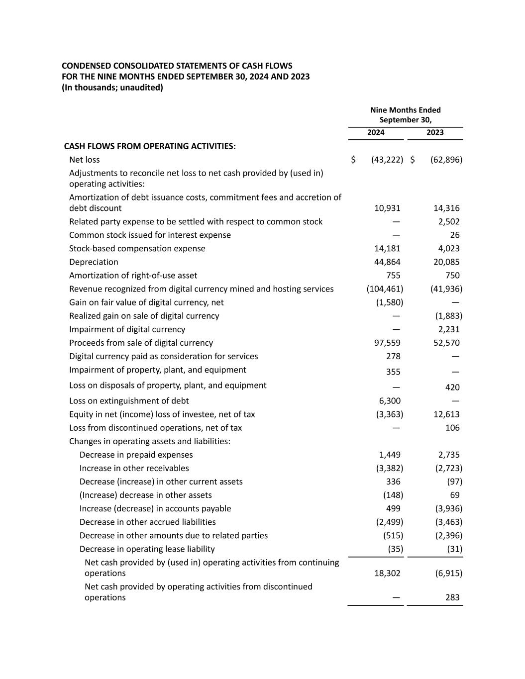 CONDENSED CONSOLIDATED STATEMENTS OF CASH FLOWS FOR THE NINE MONTHS ENDED SEPTEMBER 30, 2024 AND 2023 (In thousands; unaudited) Nine Months Ended September 30, 2024 2023 CASH FLOWS FROM OPERATING ACTIVITIES: Net loss $ (43,222) $ (62,896) Adjustments to reconcile net loss to net cash provided by (used in) operating activities: Amortization of debt issuance costs, commitment fees and accretion of debt discount 10,931 14,316 Related party expense to be settled with respect to common stock — 2,502 Common stock issued for interest expense — 26 Stock-based compensation expense 14,181 4,023 Depreciation 44,864 20,085 Amortization of right-of-use asset 755 750 Revenue recognized from digital currency mined and hosting services (104,461) (41,936) Gain on fair value of digital currency, net (1,580) — Realized gain on sale of digital currency — (1,883) Impairment of digital currency — 2,231 Proceeds from sale of digital currency 97,559 52,570 Digital currency paid as consideration for services 278 — Impairment of property, plant, and equipment 355 — Loss on disposals of property, plant, and equipment — 420 Loss on extinguishment of debt 6,300 — Equity in net (income) loss of investee, net of tax (3,363) 12,613 Loss from discontinued operations, net of tax — 106 Changes in operating assets and liabilities: Decrease in prepaid expenses 1,449 2,735 Increase in other receivables (3,382) (2,723) Decrease (increase) in other current assets 336 (97) (Increase) decrease in other assets (148) 69 Increase (decrease) in accounts payable 499 (3,936) Decrease in other accrued liabilities (2,499) (3,463) Decrease in other amounts due to related parties (515) (2,396) Decrease in operating lease liability (35) (31) Net cash provided by (used in) operating activities from continuing operations 18,302 (6,915) Net cash provided by operating activities from discontinued operations — 283