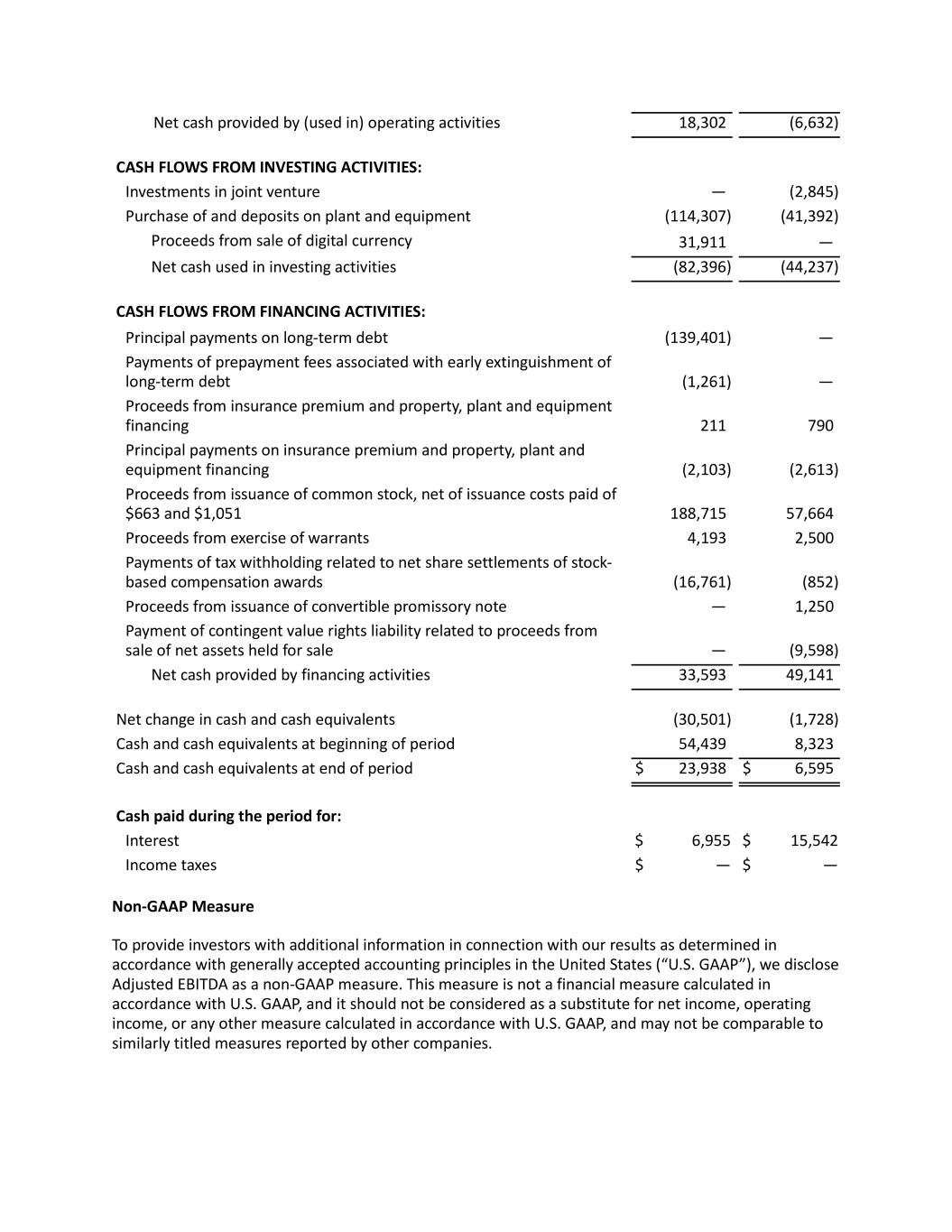 Net cash provided by (used in) operating activities 18,302 (6,632) CASH FLOWS FROM INVESTING ACTIVITIES: Investments in joint venture — (2,845) Purchase of and deposits on plant and equipment (114,307) (41,392) Proceeds from sale of digital currency 31,911 — Net cash used in investing activities (82,396) (44,237) CASH FLOWS FROM FINANCING ACTIVITIES: Principal payments on long-term debt (139,401) — Payments of prepayment fees associated with early extinguishment of long-term debt (1,261) — Proceeds from insurance premium and property, plant and equipment financing 211 790 Principal payments on insurance premium and property, plant and equipment financing (2,103) (2,613) Proceeds from issuance of common stock, net of issuance costs paid of $663 and $1,051 188,715 57,664 Proceeds from exercise of warrants 4,193 2,500 Payments of tax withholding related to net share settlements of stock- based compensation awards (16,761) (852) Proceeds from issuance of convertible promissory note — 1,250 Payment of contingent value rights liability related to proceeds from sale of net assets held for sale — (9,598) Net cash provided by financing activities 33,593 49,141 Net change in cash and cash equivalents (30,501) (1,728) Cash and cash equivalents at beginning of period 54,439 8,323 Cash and cash equivalents at end of period $ 23,938 $ 6,595 Cash paid during the period for: Interest $ 6,955 $ 15,542 Income taxes $ — $ — Non-GAAP Measure To provide investors with additional information in connection with our results as determined in accordance with generally accepted accounting principles in the United States (“U.S. GAAP”), we disclose Adjusted EBITDA as a non-GAAP measure. This measure is not a financial measure calculated in accordance with U.S. GAAP, and it should not be considered as a substitute for net income, operating income, or any other measure calculated in accordance with U.S. GAAP, and may not be comparable to similarly titled measures reported by other companies.