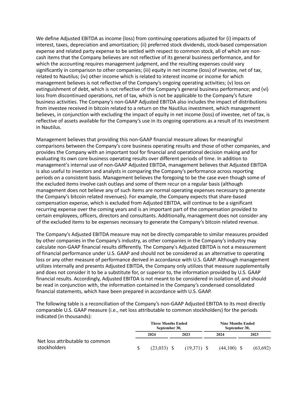 We define Adjusted EBITDA as income (loss) from continuing operations adjusted for (i) impacts of interest, taxes, depreciation and amortization; (ii) preferred stock dividends, stock-based compensation expense and related party expense to be settled with respect to common stock, all of which are non- cash items that the Company believes are not reflective of its general business performance, and for which the accounting requires management judgment, and the resulting expenses could vary significantly in comparison to other companies; (iii) equity in net income (loss) of investee, net of tax, related to Nautilus; (iv) other income which is related to interest income or income for which management believes is not reflective of the Company’s ongoing operating activities; (v) loss on extinguishment of debt, which is not reflective of the Company’s general business performance; and (vi) loss from discontinued operations, net of tax, which is not be applicable to the Company’s future business activities. The Company’s non-GAAP Adjusted EBITDA also includes the impact of distributions from investee received in bitcoin related to a return on the Nautilus investment, which management believes, in conjunction with excluding the impact of equity in net income (loss) of investee, net of tax, is reflective of assets available for the Company’s use in its ongoing operations as a result of its investment in Nautilus. Management believes that providing this non-GAAP financial measure allows for meaningful comparisons between the Company's core business operating results and those of other companies, and provides the Company with an important tool for financial and operational decision making and for evaluating its own core business operating results over different periods of time. In addition to management's internal use of non-GAAP Adjusted EBITDA, management believes that Adjusted EBITDA is also useful to investors and analysts in comparing the Company’s performance across reporting periods on a consistent basis. Management believes the foregoing to be the case even though some of the excluded items involve cash outlays and some of them recur on a regular basis (although management does not believe any of such items are normal operating expenses necessary to generate the Company’s bitcoin related revenues). For example, the Company expects that share-based compensation expense, which is excluded from Adjusted EBITDA, will continue to be a significant recurring expense over the coming years and is an important part of the compensation provided to certain employees, officers, directors and consultants. Additionally, management does not consider any of the excluded items to be expenses necessary to generate the Company’s bitcoin related revenue. The Company's Adjusted EBITDA measure may not be directly comparable to similar measures provided by other companies in the Company’s industry, as other companies in the Company’s industry may calculate non-GAAP financial results differently. The Company's Adjusted EBITDA is not a measurement of financial performance under U.S. GAAP and should not be considered as an alternative to operating loss or any other measure of performance derived in accordance with U.S. GAAP. Although management utilizes internally and presents Adjusted EBITDA, the Company only utilizes that measure supplementally and does not consider it to be a substitute for, or superior to, the information provided by U.S. GAAP financial results. Accordingly, Adjusted EBITDA is not meant to be considered in isolation of, and should be read in conjunction with, the information contained in the Company’s condensed consolidated financial statements, which have been prepared in accordance with U.S. GAAP. The following table is a reconciliation of the Company’s non-GAAP Adjusted EBITDA to its most directly comparable U.S. GAAP measure (i.e., net loss attributable to common stockholders) for the periods indicated (in thousands): Three Months Ended September 30, Nine Months Ended September 30, 2024 2023 2024 2023 Net loss attributable to common stockholders $ (23,033) $ (19,371) $ (44,100) $ (63,692)