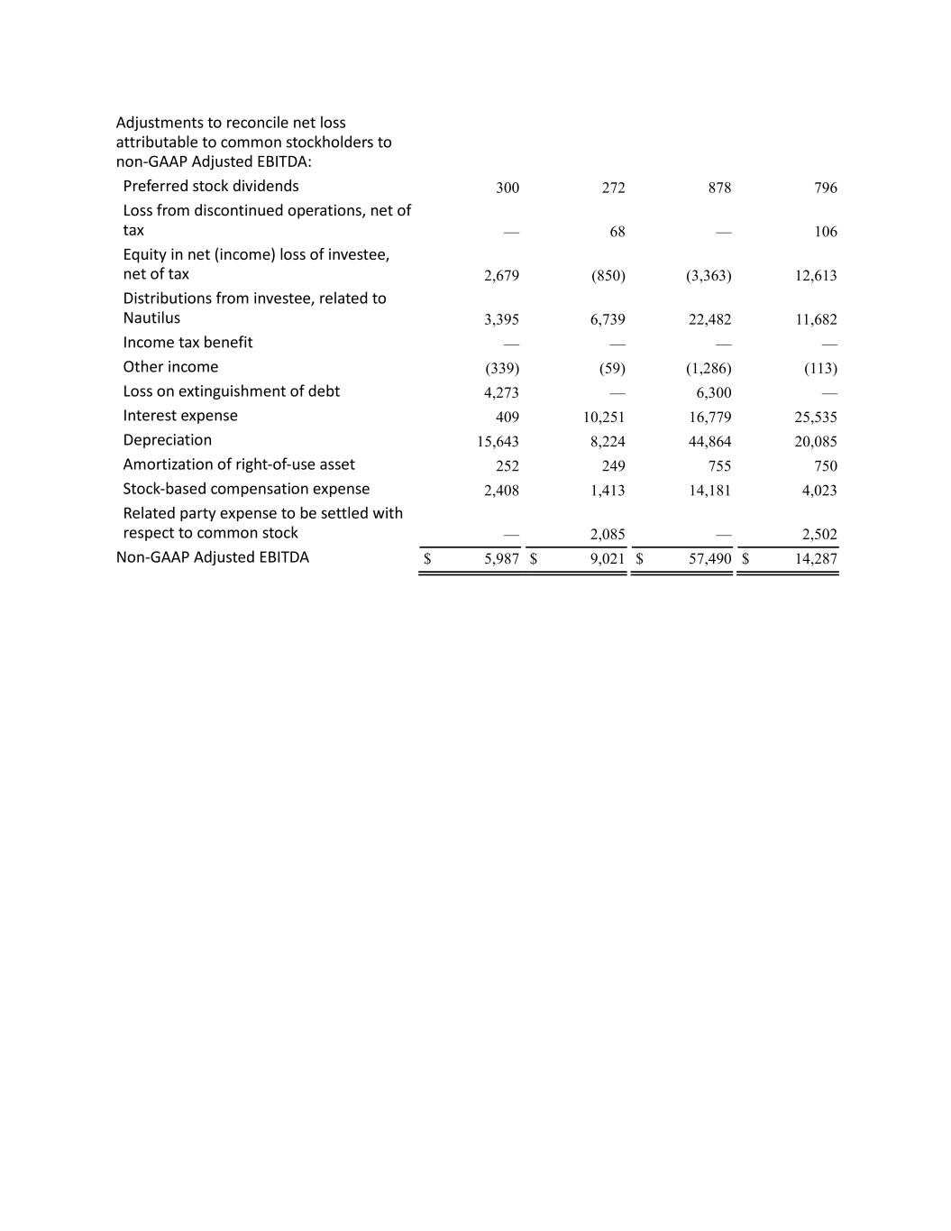 Adjustments to reconcile net loss attributable to common stockholders to non-GAAP Adjusted EBITDA: Preferred stock dividends 300 272 878 796 Loss from discontinued operations, net of tax — 68 — 106 Equity in net (income) loss of investee, net of tax 2,679 (850) (3,363) 12,613 Distributions from investee, related to Nautilus 3,395 6,739 22,482 11,682 Income tax benefit — — — — Other income (339) (59) (1,286) (113) Loss on extinguishment of debt 4,273 — 6,300 — Interest expense 409 10,251 16,779 25,535 Depreciation 15,643 8,224 44,864 20,085 Amortization of right-of-use asset 252 249 755 750 Stock-based compensation expense 2,408 1,413 14,181 4,023 Related party expense to be settled with respect to common stock — 2,085 — 2,502 Non-GAAP Adjusted EBITDA $ 5,987 $ 9,021 $ 57,490 $ 14,287