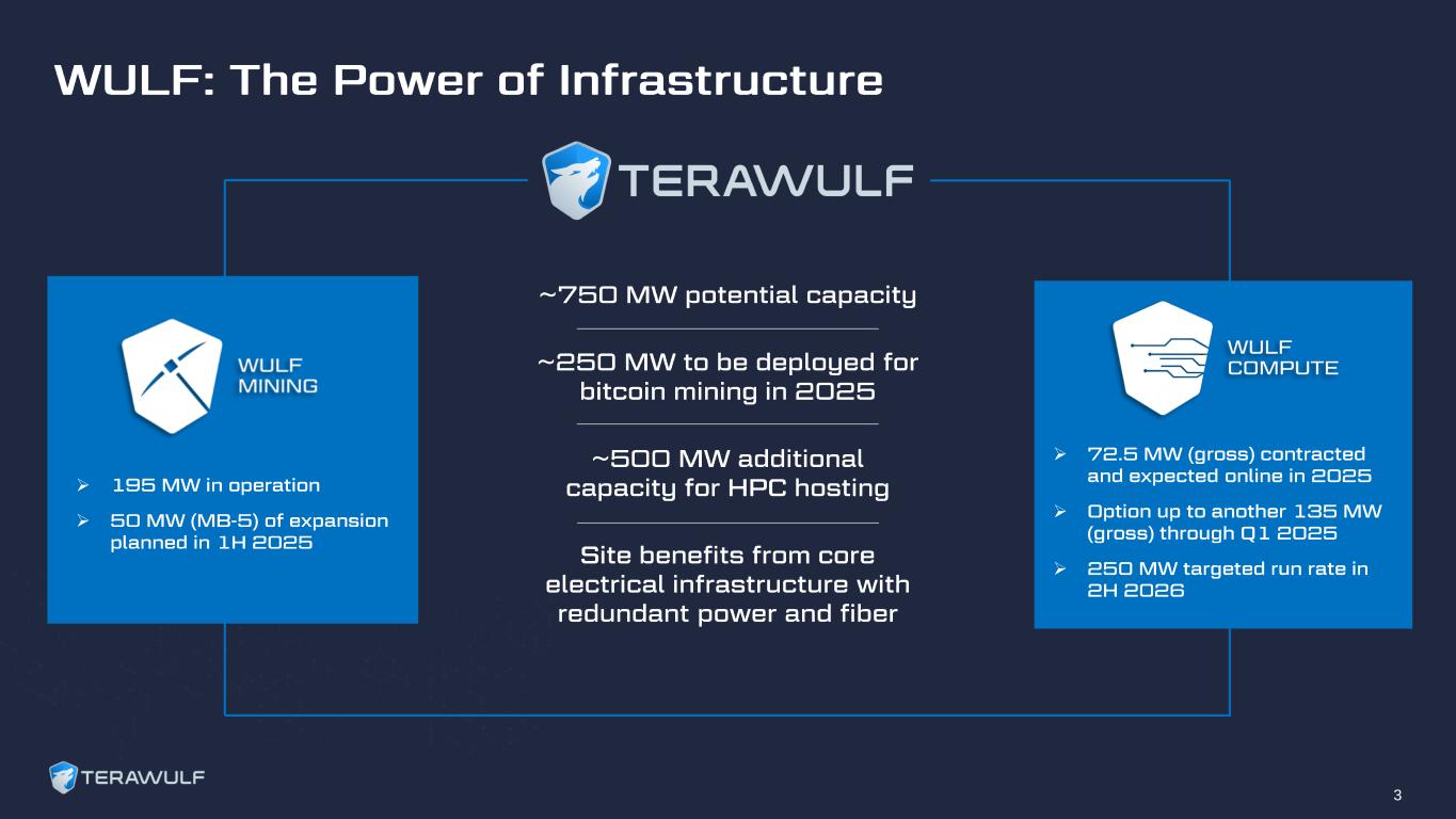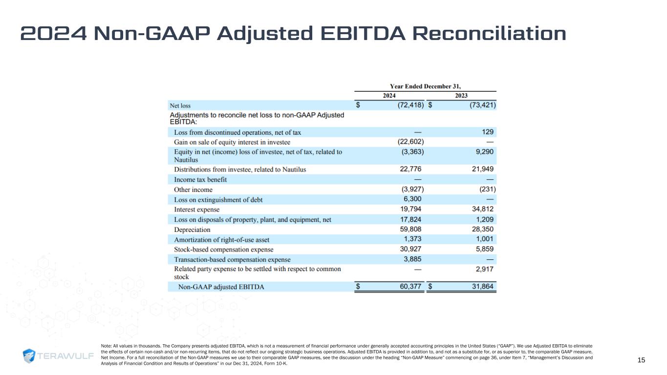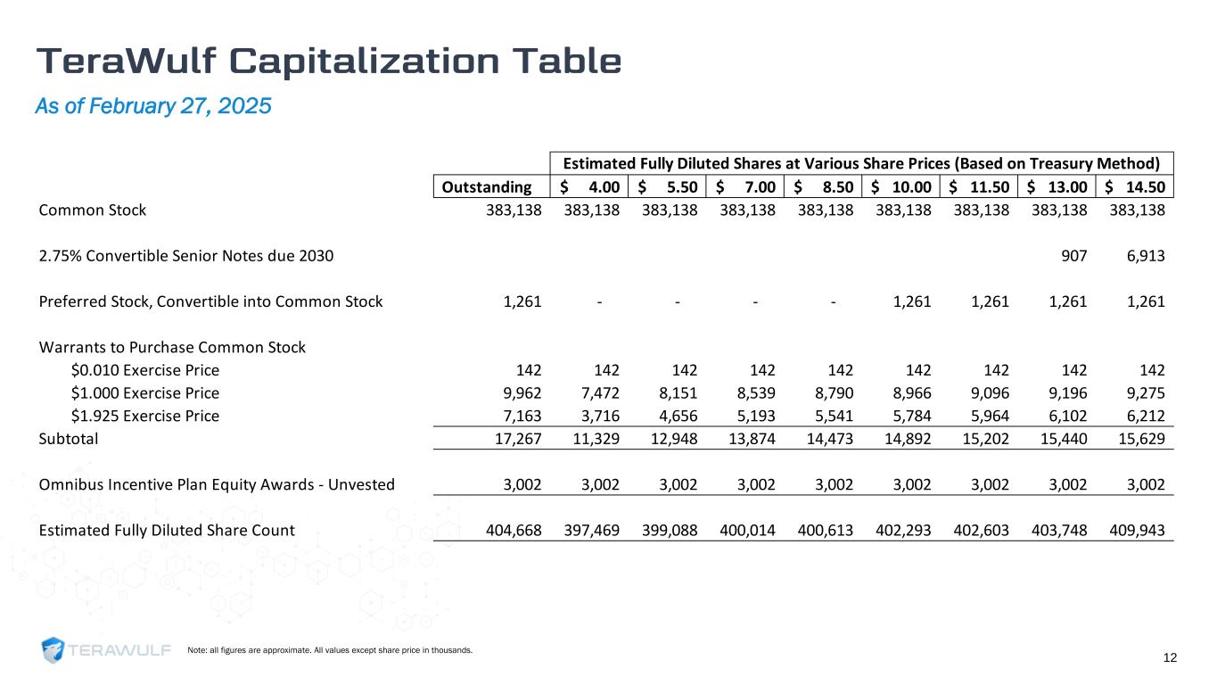 Unit economics anticipated to improve in 2025 upon completion of MB-5 and miner fleet upgrade 10 Q1 2024 Q2 2024 Q3 2024 Q4 2024 Full Year 2024A Realized Average Hash Rate (EH/s) 6.8 7.1 8.1 7.0 7.4 Total Bitcoin Mined 1,051 699 555 423 2,728 $ in 000’s $/BTC $/PH/Day $ in 000’s $/BTC $/PH/Day $ in 000’s $/BTC $/PH/Day $ in 000’s $/BTC $/PH/Day $ in 000’s Power Cost for the Period $16,292 $15,501 $26 $16,035 $22,940 $23 $16,899 $30,448 $23 $19,623 $46,407 $31 $68,849 SG&A for the Period [1] 8,028 7,639 13 7,074 10,120 10 9,070 16,342 12 11,644 27,539 18 $35,816 Other OpEx for the Period [2] 3,113 2,962 5 3,472 4,968 5 3,273 5,897 4 2,101 4,968 3 $11,959 Cash Interest Expense for the Period 3,726 3,545 6 2,488 3,559 4 741 1,335 1 - - - $6,955 Total Cash Cost $31,159 $29,647 $50 $29,069 $41,587 $42 $29,983 $54,022 $40 $33,367 $78,914 $52 $123,578 Note: All expenses are cash cost only and all figures through Q3 2024E include the impact of TeraWulf’s net share of the Nautilus JV. (1) Excludes stock-based compensation and transaction-based compensation expense. (2) Q1 – Q3 2024 includes Nautilus OpEx.