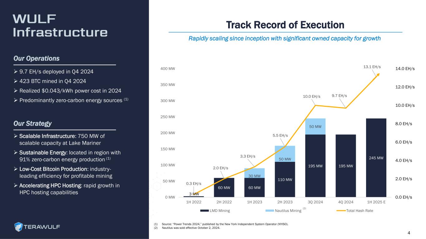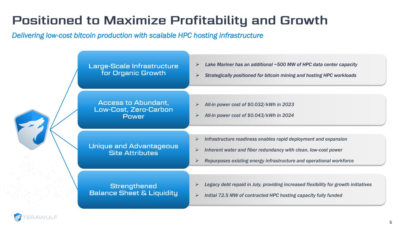 3 MW 60 MW 60 MW 110 MW 195 MW 195 MW 245 MW 30 MW 50 MW 50 MW 0.3 EH/s 2.0 EH/s 3.3 EH/s 5.5 EH/s 10.0 EH/s 9.7 EH/s 13.1 EH/s 0.0 EH/s 2.0 EH/s 4.0 EH/s 6.0 EH/s 8.0 EH/s 10.0 EH/s 12.0 EH/s 14.0 EH/s 0 MW 50 MW 100 MW 150 MW 200 MW 250 MW 300 MW 350 MW 400 MW 1H 2022 2H 2022 1H 2023 2H 2023 3Q 2024 4Q 2024 1H 2025 E LMD Mining Nautilus Mining Total Hash Rate Our Operations ➢ Scalable Infrastructure: 750 MW of scalable capacity at Lake Mariner ➢ Sustainable Energy: located in region with 91% zero-carbon energy production (1) ➢ Low-Cost Bitcoin Production: industry- leading efficiency for profitable mining ➢ Accelerating HPC Hosting: rapid growth in HPC hosting capabilities Our Strategy ➢ 9.7 EH/s deployed in Q4 2024 ➢ 423 BTC mined in Q4 2024 ➢ Realized $0.043/kWh power cost in 2024 ➢ Predominantly zero-carbon energy sources (1) Track Record of Execution Rapidly scaling since inception with significant owned capacity for growth 4 (2) (1) Source: “Power Trends 2024,” published by the New York Independent System Operator (NYISO). (2) Nautilus was sold effective October 2, 2024.