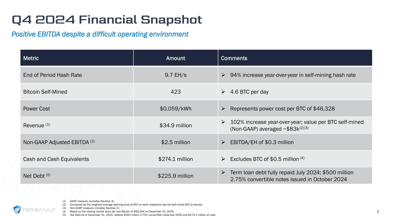 Efficient Mining Fleet (1) Includes WULF’s net share of miners contributed to Nautilus JV. (2) Miner orders to be installed in Q4 2024. (3) Reflects planned sale of S19J/J-Pro and MicroBT M30 miners, and exercise of option to purchase 7.4k and 14.4k of the remaining 30k Bitmain S21 Pro miners under the purchase agreement option in Q4 2024 and Q1 2025, respectively. (4) Weighted average nameplate efficiency, figures exclude 4% ancillary load. Fleet Summary Model Hash Rate Efficiency J/TH Current Fleet (1) Current Capacity (1) + MB-5 PF Fleet PF Capacity S21 Pro (2) 234 15.0 12,500 .5 14,300 26,800 6.3 EH S21 195 17.9 8,100 4.9 5,000 1.0 EH S19 JXP/XP 141 21.5 34,300 1.6 38,000 5.3 EH S19K Pro 117 23.6 4,000 2.9 4,000 0.5 EH Total 58,900 9.7 14,300 73,200 13.1 EH Fleet Efficiency (4) Hash Rate Mix (EH/s) 9.7 EH/s Current: PF Fleet: 13.1 EH/s 6 Pro forma fleet efficiency of 18.0 J/TH expected in 1H 2025 19.0 J/TH 18.0 J/TH Current Pro Forma