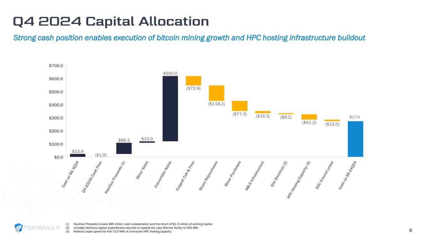 All figures include TeraWulf’s net share of Nautilus JV 8 1,051 699 555 423 Q1 2024 Q2 2024 Q3 2024 Q4 2024 8.0 8.8 10.0 9.7 Q1 2024 Q2 2024 Q3 2024 Q4 2024 $40.5 $32.2 $17.0 $15.3 Q1 2024 Q2 2024 Q3 2024 Q4 2024 $32.0 $19.5 $6.0 $2.5 Q1 2024 Q2 2024 Q3 2024 Q4 2024 (1) Excludes bitcoin earned via hosting profit share. (2) Includes gross total hosted hash rate. (3) Calculated as Revenue less Cost of Revenue (exclusive of depreciation, inclusive of demand response proceeds); includes WULF’s share of Nautilus JV. (4) Includes distributions from Nautilus JV. ➢ 423 BTC mined in Q4 2024 ➢ Completed miner re- allocation from Nautilus plus additional miner refresh ➢ EBITDA per EH of $0.3 million