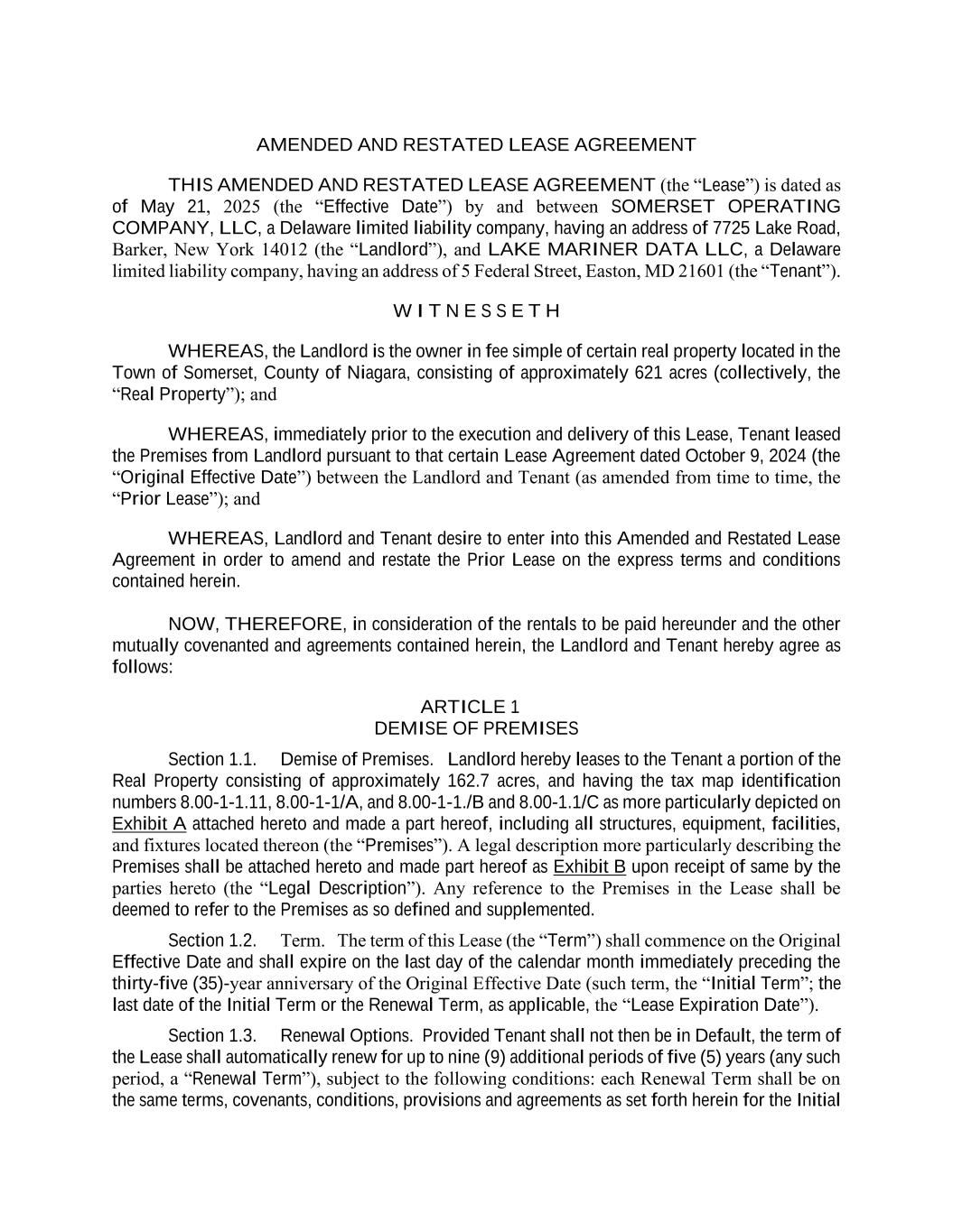 AMENDED AND RESTATED LEASE AGREEMENT THIS AMENDED AND RESTATED LEASE AGREEMENT (the “Lease”) is dated as of May 21, 2025 (the “Effective Date”) by and between SOMERSET OPERATING COMPANY, LLC, a Delaware limited liability company, having an address of 7725 Lake Road, Barker, New York 14012 (the “Landlord”), and LAKE MARINER DATA LLC, a Delaware limited liability company, having an address of 5 Federal Street, Easton, MD 21601 (the “Tenant”). W I T N E S S E T H WHEREAS, the Landlord is the owner in fee simple of certain real property located in the Town of Somerset, County of Niagara, consisting of approximately 621 acres (collectively, the “Real Property”); and WHEREAS, immediately prior to the execution and delivery of this Lease, Tenant leased the Premises from Landlord pursuant to that certain Lease Agreement dated October 9, 2024 (the “Original Effective Date”) between the Landlord and Tenant (as amended from time to time, the “Prior Lease”); and WHEREAS, Landlord and Tenant desire to enter into this Amended and Restated Lease Agreement in order to amend and restate the Prior Lease on the express terms and conditions contained herein. NOW, THEREFORE, in consideration of the rentals to be paid hereunder and the other mutually covenanted and agreements contained herein, the Landlord and Tenant hereby agree as follows: ARTICLE 1 DEMISE OF PREMISES Section 1.1. Demise of Premises. Landlord hereby leases to the Tenant a portion of the Real Property consisting of approximately 162.7 acres, and having the tax map identification numbers 8.00-1-1.11, 8.00-1-1/A, and 8.00-1-1./B and 8.00-1.1/C as more particularly depicted on Exhibit A attached hereto and made a part hereof, including all structures, equipment, facilities, and fixtures located thereon (the “Premises”). A legal description more particularly describing the Premises shall be attached hereto and made part hereof as Exhibit B upon receipt of same by the parties hereto (the “Legal Description”). Any reference to the Premises in the Lease shall be deemed to refer to the Premises as so defined and supplemented. Section 1.2. Term. The term of this Lease (the “Term”) shall commence on the Original Effective Date and shall expire on the last day of the calendar month immediately preceding the thirty-five (35)-year anniversary of the Original Effective Date (such term, the “Initial Term”; the last date of the Initial Term or the Renewal Term, as applicable, the “Lease Expiration Date”). Section 1.3. Renewal Options. Provided Tenant shall not then be in Default, the term of the Lease shall automatically renew for up to nine (9) additional periods of five (5) years (any such period, a “Renewal Term”), subject to the following conditions: each Renewal Term shall be on the same terms, covenants, conditions, provisions and agreements as set forth herein for the Initial