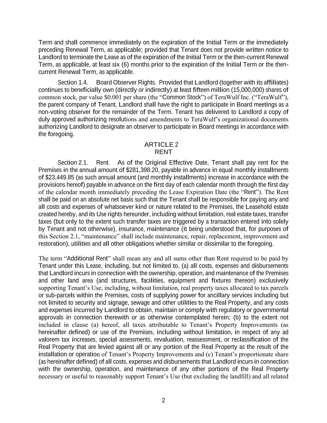 2 Term and shall commence immediately on the expiration of the Initial Term or the immediately preceding Renewal Term, as applicable; provided that Tenant does not provide written notice to Landlord to terminate the Lease as of the expiration of the Initial Term or the then-current Renewal Term, as applicable, at least six (6) months prior to the expiration of the Initial Term or the then- current Renewal Term, as applicable. Section 1.4. Board Observer Rights. Provided that Landlord (together with its affiliates) continues to beneficially own (directly or indirectly) at least fifteen million (15,000,000) shares of common stock, par value $0.001 per share (the “Common Stock”) of TeraWulf Inc. (“TeraWulf”), the parent company of Tenant, Landlord shall have the right to participate in Board meetings as a non-voting observer for the remainder of the Term. Tenant has delivered to Landlord a copy of duly approved authorizing resolutions and amendments to TeraWulf’s organizational documents authorizing Landlord to designate an observer to participate in Board meetings in accordance with the foregoing. ARTICLE 2 RENT Section 2.1. Rent. As of the Original Effective Date, Tenant shall pay rent for the Premises in the annual amount of $281,398.20, payable in advance in equal monthly installments of $23,449.85 (as such annual amount (and monthly installments) increase in accordance with the provisions hereof) payable in advance on the first day of each calendar month through the first day of the calendar month immediately preceding the Lease Expiration Date (the “Rent”). The Rent shall be paid on an absolute net basis such that the Tenant shall be responsible for paying any and all costs and expenses of whatsoever kind or nature related to the Premises, the Leasehold estate created hereby, and its Use rights hereunder, including without limitation, real estate taxes, transfer taxes (but only to the extent such transfer taxes are triggered by a transaction entered into solely by Tenant and not otherwise), insurance, maintenance (it being understood that, for purposes of this Section 2.1, “maintenance” shall include maintenance, repair, replacement, improvement and restoration), utilities and all other obligations whether similar or dissimilar to the foregoing. The term “Additional Rent” shall mean any and all sums other than Rent required to be paid by Tenant under this Lease, including, but not limited to, (a) all costs, expenses and disbursements that Landlord incurs in connection with the ownership, operation, and maintenance of the Premises and other land area (and structures, facilities, equipment and fixtures thereon) exclusively supporting Tenant’s Use, including, without limitation, real property taxes allocated to tax parcels or sub-parcels within the Premises, costs of supplying power for ancillary services including but not limited to security and signage, sewage and other utilities to the Real Property, and any costs and expenses incurred by Landlord to obtain, maintain or comply with regulatory or governmental approvals in connection therewith or as otherwise contemplated herein; (b) to the extent not included in clause (a) hereof, all taxes attributable to Tenant’s Property Improvements (as hereinafter defined) or use of the Premises, including without limitation, in respect of any ad valorem tax increases, special assessments, revaluation, reassessment, or reclassification of the Real Property that are levied against all or any portion of the Real Property as the result of the installation or operation of Tenant’s Property Improvements and (c) Tenant’s proportionate share (as hereinafter defined) of all costs, expenses and disbursements that Landlord incurs in connection with the ownership, operation, and maintenance of any other portions of the Real Property necessary or useful to reasonably support Tenant’s Use (but excluding the landfill) and all related