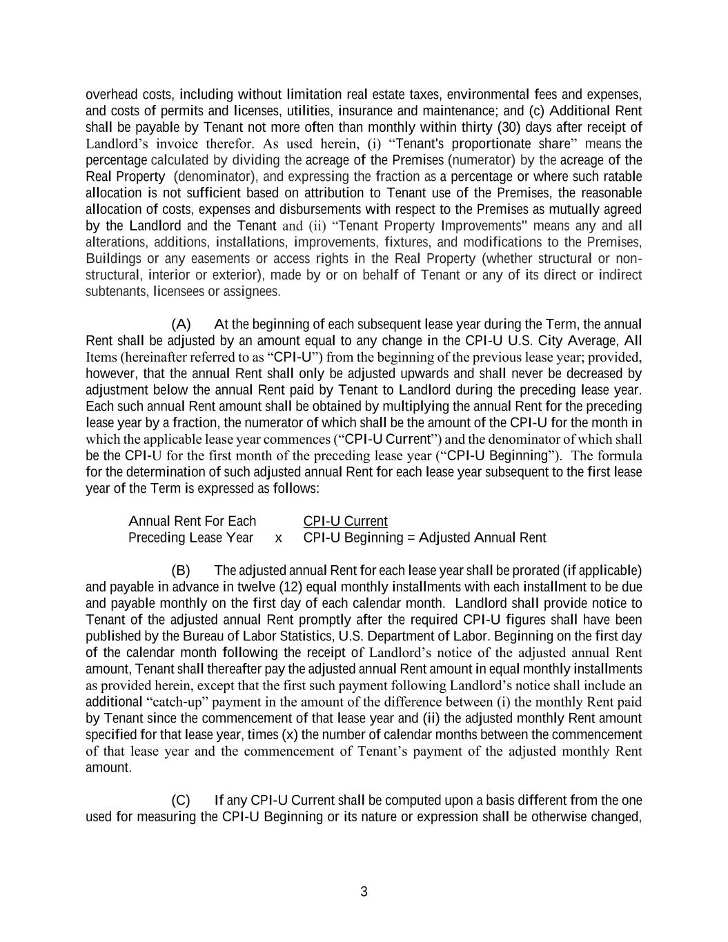 3 overhead costs, including without limitation real estate taxes, environmental fees and expenses, and costs of permits and licenses, utilities, insurance and maintenance; and (c) Additional Rent shall be payable by Tenant not more often than monthly within thirty (30) days after receipt of Landlord’s invoice therefor. As used herein, (i) “Tenant's proportionate share” means the percentage calculated by dividing the acreage of the Premises (numerator) by the acreage of the Real Property (denominator), and expressing the fraction as a percentage or where such ratable allocation is not sufficient based on attribution to Tenant use of the Premises, the reasonable allocation of costs, expenses and disbursements with respect to the Premises as mutually agreed by the Landlord and the Tenant and (ii) “Tenant Property Improvements" means any and all alterations, additions, installations, improvements, fixtures, and modifications to the Premises, Buildings or any easements or access rights in the Real Property (whether structural or non- structural, interior or exterior), made by or on behalf of Tenant or any of its direct or indirect subtenants, licensees or assignees. (A) At the beginning of each subsequent lease year during the Term, the annual Rent shall be adjusted by an amount equal to any change in the CPI-U U.S. City Average, All Items (hereinafter referred to as “CPI-U”) from the beginning of the previous lease year; provided, however, that the annual Rent shall only be adjusted upwards and shall never be decreased by adjustment below the annual Rent paid by Tenant to Landlord during the preceding lease year. Each such annual Rent amount shall be obtained by multiplying the annual Rent for the preceding lease year by a fraction, the numerator of which shall be the amount of the CPI-U for the month in which the applicable lease year commences (“CPI-U Current”) and the denominator of which shall be the CPI-U for the first month of the preceding lease year (“CPI-U Beginning”). The formula for the determination of such adjusted annual Rent for each lease year subsequent to the first lease year of the Term is expressed as follows: Annual Rent For Each CPI-U Current Preceding Lease Year x CPI-U Beginning = Adjusted Annual Rent (B) The adjusted annual Rent for each lease year shall be prorated (if applicable) and payable in advance in twelve (12) equal monthly installments with each installment to be due and payable monthly on the first day of each calendar month. Landlord shall provide notice to Tenant of the adjusted annual Rent promptly after the required CPI-U figures shall have been published by the Bureau of Labor Statistics, U.S. Department of Labor. Beginning on the first day of the calendar month following the receipt of Landlord’s notice of the adjusted annual Rent amount, Tenant shall thereafter pay the adjusted annual Rent amount in equal monthly installments as provided herein, except that the first such payment following Landlord’s notice shall include an additional “catch-up” payment in the amount of the difference between (i) the monthly Rent paid by Tenant since the commencement of that lease year and (ii) the adjusted monthly Rent amount specified for that lease year, times (x) the number of calendar months between the commencement of that lease year and the commencement of Tenant’s payment of the adjusted monthly Rent amount. (C) If any CPI-U Current shall be computed upon a basis different from the one used for measuring the CPI-U Beginning or its nature or expression shall be otherwise changed,