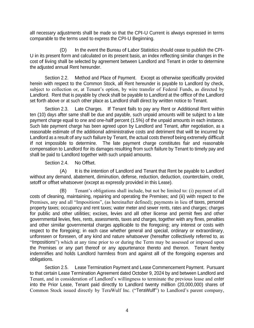 4 all necessary adjustments shall be made so that the CPI-U Current is always expressed in terms comparable to the terms used to express the CPI-U Beginning. (D) In the event the Bureau of Labor Statistics should cease to publish the CPI- U in its present form and calculated on its present basis, an index reflecting similar changes in the cost of living shall be selected by agreement between Landlord and Tenant in order to determine the adjusted annual Rent hereunder. Section 2.2. Method and Place of Payment. Except as otherwise specifically provided herein with respect to the Common Stock, all Rent hereunder is payable to Landlord by check, subject to collection or, at Tenant’s option, by wire transfer of Federal Funds, as directed by Landlord. Rent that is payable by check shall be payable to Landlord at the office of the Landlord set forth above or at such other place as Landlord shall direct by written notice to Tenant. Section 2.3. Late Charges. If Tenant fails to pay any Rent or Additional Rent within ten (10) days after same shall be due and payable, such unpaid amounts will be subject to a late payment charge equal to one and one-half percent (1.5%) of the unpaid amounts in each instance. Such late payment charge has been agreed upon by Landlord and Tenant, after negotiation, as a reasonable estimate of the additional administrative costs and detriment that will be incurred by Landlord as a result of any such failure by Tenant, the actual costs thereof being extremely difficult if not impossible to determine. The late payment charge constitutes fair and reasonable compensation to Landlord for its damages resulting from such failure by Tenant to timely pay and shall be paid to Landlord together with such unpaid amounts. Section 2.4. No Offset. (A) It is the intention of Landlord and Tenant that Rent be payable to Landlord without any demand, abatement, diminution, defense, reduction, deduction, counterclaim, credit, setoff or offset whatsoever (except as expressly provided in this Lease). (B) Tenant’s obligations shall include, but not be limited to: (i) payment of all costs of cleaning, maintaining, repairing and operating the Premises; and (ii) with respect to the Premises, any and all “Impositions”, (as hereinafter defined); payments in lieu of taxes, personal property taxes; occupancy and rent taxes; water meter and sewer rents, rates and charges; charges for public and other utilities; excises, levies and all other license and permit fees and other governmental levies, fees, rents, assessments, taxes and charges, together with any fines, penalties and other similar governmental charges applicable to the foregoing; any interest or costs with respect to the foregoing; in each case whether general and special, ordinary or extraordinary, unforeseen or foreseen, of any kind and nature whatsoever (hereafter collectively referred to, as “Impositions”) which at any time prior to or during the Term may be assessed or imposed upon the Premises or any part thereof or any appurtenance thereto and thereon. Tenant hereby indemnifies and holds Landlord harmless from and against all of the foregoing expenses and obligations. Section 2.5. Lease Termination Payment and Lease Commencement Payment. Pursuant to that certain Lease Termination Agreement dated October 9, 2024 by and between Landlord and Tenant, and in consideration of Landlord’s willingness to terminate the previous lease and enter into the Prior Lease, Tenant paid directly to Landlord twenty million (20,000,000) shares of Common Stock issued directly by TeraWulf Inc. (“TeraWulf”) to Landlord’s parent company,