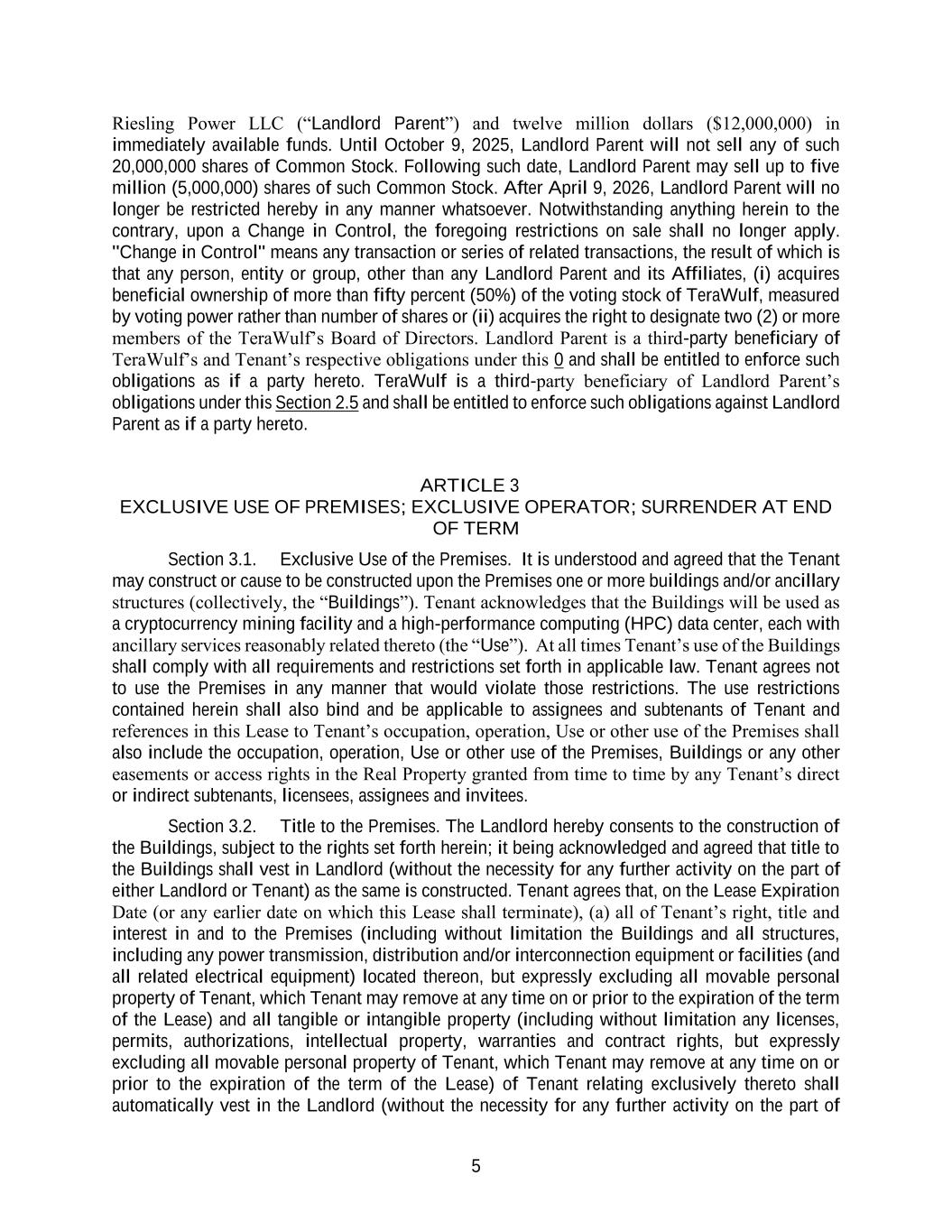 5 Riesling Power LLC (“Landlord Parent”) and twelve million dollars ($12,000,000) in immediately available funds. Until October 9, 2025, Landlord Parent will not sell any of such 20,000,000 shares of Common Stock. Following such date, Landlord Parent may sell up to five million (5,000,000) shares of such Common Stock. After April 9, 2026, Landlord Parent will no longer be restricted hereby in any manner whatsoever. Notwithstanding anything herein to the contrary, upon a Change in Control, the foregoing restrictions on sale shall no longer apply. "Change in Control" means any transaction or series of related transactions, the result of which is that any person, entity or group, other than any Landlord Parent and its Affiliates, (i) acquires beneficial ownership of more than fifty percent (50%) of the voting stock of TeraWulf, measured by voting power rather than number of shares or (ii) acquires the right to designate two (2) or more members of the TeraWulf’s Board of Directors. Landlord Parent is a third-party beneficiary of TeraWulf’s and Tenant’s respective obligations under this 0 and shall be entitled to enforce such obligations as if a party hereto. TeraWulf is a third-party beneficiary of Landlord Parent’s obligations under this Section 2.5 and shall be entitled to enforce such obligations against Landlord Parent as if a party hereto. ARTICLE 3 EXCLUSIVE USE OF PREMISES; EXCLUSIVE OPERATOR; SURRENDER AT END OF TERM Section 3.1. Exclusive Use of the Premises. It is understood and agreed that the Tenant may construct or cause to be constructed upon the Premises one or more buildings and/or ancillary structures (collectively, the “Buildings”). Tenant acknowledges that the Buildings will be used as a cryptocurrency mining facility and a high-performance computing (HPC) data center, each with ancillary services reasonably related thereto (the “Use”). At all times Tenant’s use of the Buildings shall comply with all requirements and restrictions set forth in applicable law. Tenant agrees not to use the Premises in any manner that would violate those restrictions. The use restrictions contained herein shall also bind and be applicable to assignees and subtenants of Tenant and references in this Lease to Tenant’s occupation, operation, Use or other use of the Premises shall also include the occupation, operation, Use or other use of the Premises, Buildings or any other easements or access rights in the Real Property granted from time to time by any Tenant’s direct or indirect subtenants, licensees, assignees and invitees. Section 3.2. Title to the Premises. The Landlord hereby consents to the construction of the Buildings, subject to the rights set forth herein; it being acknowledged and agreed that title to the Buildings shall vest in Landlord (without the necessity for any further activity on the part of either Landlord or Tenant) as the same is constructed. Tenant agrees that, on the Lease Expiration Date (or any earlier date on which this Lease shall terminate), (a) all of Tenant’s right, title and interest in and to the Premises (including without limitation the Buildings and all structures, including any power transmission, distribution and/or interconnection equipment or facilities (and all related electrical equipment) located thereon, but expressly excluding all movable personal property of Tenant, which Tenant may remove at any time on or prior to the expiration of the term of the Lease) and all tangible or intangible property (including without limitation any licenses, permits, authorizations, intellectual property, warranties and contract rights, but expressly excluding all movable personal property of Tenant, which Tenant may remove at any time on or prior to the expiration of the term of the Lease) of Tenant relating exclusively thereto shall automatically vest in the Landlord (without the necessity for any further activity on the part of