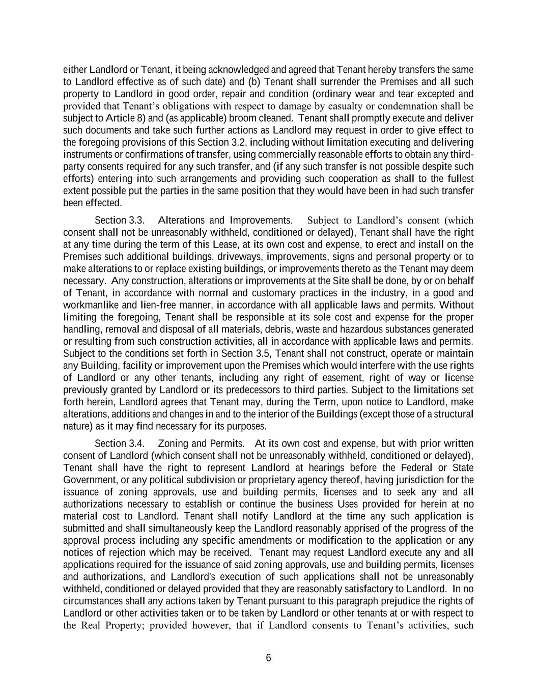 6 either Landlord or Tenant, it being acknowledged and agreed that Tenant hereby transfers the same to Landlord effective as of such date) and (b) Tenant shall surrender the Premises and all such property to Landlord in good order, repair and condition (ordinary wear and tear excepted and provided that Tenant’s obligations with respect to damage by casualty or condemnation shall be subject to Article 8) and (as applicable) broom cleaned. Tenant shall promptly execute and deliver such documents and take such further actions as Landlord may request in order to give effect to the foregoing provisions of this Section 3.2, including without limitation executing and delivering instruments or confirmations of transfer, using commercially reasonable efforts to obtain any third- party consents required for any such transfer, and (if any such transfer is not possible despite such efforts) entering into such arrangements and providing such cooperation as shall to the fullest extent possible put the parties in the same position that they would have been in had such transfer been effected. Section 3.3. Alterations and Improvements. Subject to Landlord’s consent (which consent shall not be unreasonably withheld, conditioned or delayed), Tenant shall have the right at any time during the term of this Lease, at its own cost and expense, to erect and install on the Premises such additional buildings, driveways, improvements, signs and personal property or to make alterations to or replace existing buildings, or improvements thereto as the Tenant may deem necessary. Any construction, alterations or improvements at the Site shall be done, by or on behalf of Tenant, in accordance with normal and customary practices in the industry, in a good and workmanlike and lien-free manner, in accordance with all applicable laws and permits. Without limiting the foregoing, Tenant shall be responsible at its sole cost and expense for the proper handling, removal and disposal of all materials, debris, waste and hazardous substances generated or resulting from such construction activities, all in accordance with applicable laws and permits. Subject to the conditions set forth in Section 3.5, Tenant shall not construct, operate or maintain any Building, facility or improvement upon the Premises which would interfere with the use rights of Landlord or any other tenants, including any right of easement, right of way or license previously granted by Landlord or its predecessors to third parties. Subject to the limitations set forth herein, Landlord agrees that Tenant may, during the Term, upon notice to Landlord, make alterations, additions and changes in and to the interior of the Buildings (except those of a structural nature) as it may find necessary for its purposes. Section 3.4. Zoning and Permits. At its own cost and expense, but with prior written consent of Landlord (which consent shall not be unreasonably withheld, conditioned or delayed), Tenant shall have the right to represent Landlord at hearings before the Federal or State Government, or any political subdivision or proprietary agency thereof, having jurisdiction for the issuance of zoning approvals, use and building permits, licenses and to seek any and all authorizations necessary to establish or continue the business Uses provided for herein at no material cost to Landlord. Tenant shall notify Landlord at the time any such application is submitted and shall simultaneously keep the Landlord reasonably apprised of the progress of the approval process including any specific amendments or modification to the application or any notices of rejection which may be received. Tenant may request Landlord execute any and all applications required for the issuance of said zoning approvals, use and building permits, licenses and authorizations, and Landlord's execution of such applications shall not be unreasonably withheld, conditioned or delayed provided that they are reasonably satisfactory to Landlord. In no circumstances shall any actions taken by Tenant pursuant to this paragraph prejudice the rights of Landlord or other activities taken or to be taken by Landlord or other tenants at or with respect to the Real Property; provided however, that if Landlord consents to Tenant’s activities, such