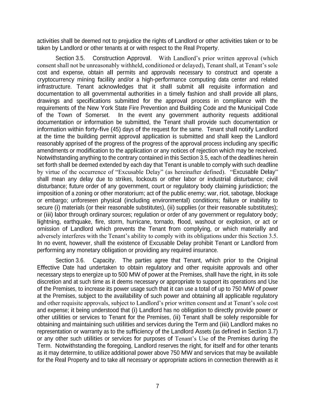 7 activities shall be deemed not to prejudice the rights of Landlord or other activities taken or to be taken by Landlord or other tenants at or with respect to the Real Property. Section 3.5. Construction Approval. With Landlord’s prior written approval (which consent shall not be unreasonably withheld, conditioned or delayed), Tenant shall, at Tenant’s sole cost and expense, obtain all permits and approvals necessary to construct and operate a cryptocurrency mining facility and/or a high-performance computing data center and related infrastructure. Tenant acknowledges that it shall submit all requisite information and documentation to all governmental authorities in a timely fashion and shall provide all plans, drawings and specifications submitted for the approval process in compliance with the requirements of the New York State Fire Prevention and Building Code and the Municipal Code of the Town of Somerset. In the event any government authority requests additional documentation or information be submitted, the Tenant shall provide such documentation or information within forty-five (45) days of the request for the same. Tenant shall notify Landlord at the time the building permit approval application is submitted and shall keep the Landlord reasonably apprised of the progress of the progress of the approval process including any specific amendments or modification to the application or any notices of rejection which may be received. Notwithstanding anything to the contrary contained in this Section 3.5, each of the deadlines herein set forth shall be deemed extended by each day that Tenant is unable to comply with such deadline by virtue of the occurrence of “Excusable Delay” (as hereinafter defined). “Excusable Delay” shall mean any delay due to strikes, lockouts or other labor or industrial disturbance; civil disturbance; future order of any government, court or regulatory body claiming jurisdiction; the imposition of a zoning or other moratorium; act of the public enemy; war, riot, sabotage, blockage or embargo; unforeseen physical (including environmental) conditions; failure or inability to secure (i) materials (or their reasonable substitutes), (ii) supplies (or their reasonable substitutes); or (iii) labor through ordinary sources; regulation or order of any government or regulatory body; lightning, earthquake, fire, storm, hurricane, tornado, flood, washout or explosion, or act or omission of Landlord which prevents the Tenant from complying, or which materially and adversely interferes with the Tenant’s ability to comply with its obligations under this Section 3.5. In no event, however, shall the existence of Excusable Delay prohibit Tenant or Landlord from performing any monetary obligation or providing any required insurance. Section 3.6. Capacity. The parties agree that Tenant, which prior to the Original Effective Date had undertaken to obtain regulatory and other requisite approvals and other necessary steps to energize up to 500 MW of power at the Premises, shall have the right, in its sole discretion and at such time as it deems necessary or appropriate to support its operations and Use of the Premises, to increase its power usage such that it can use a total of up to 750 MW of power at the Premises, subject to the availability of such power and obtaining all applicable regulatory and other requisite approvals, subject to Landlord’s prior written consent and at Tenant’s sole cost and expense; it being understood that (i) Landlord has no obligation to directly provide power or other utilities or services to Tenant for the Premises, (ii) Tenant shall be solely responsible for obtaining and maintaining such utilities and services during the Term and (iii) Landlord makes no representation or warranty as to the sufficiency of the Landlord Assets (as defined in Section 3.7) or any other such utilities or services for purposes of Tenant’s Use of the Premises during the Term. Notwithstanding the foregoing, Landlord reserves the right, for itself and for other tenants as it may determine, to utilize additional power above 750 MW and services that may be available for the Real Property and to take all necessary or appropriate actions in connection therewith as it