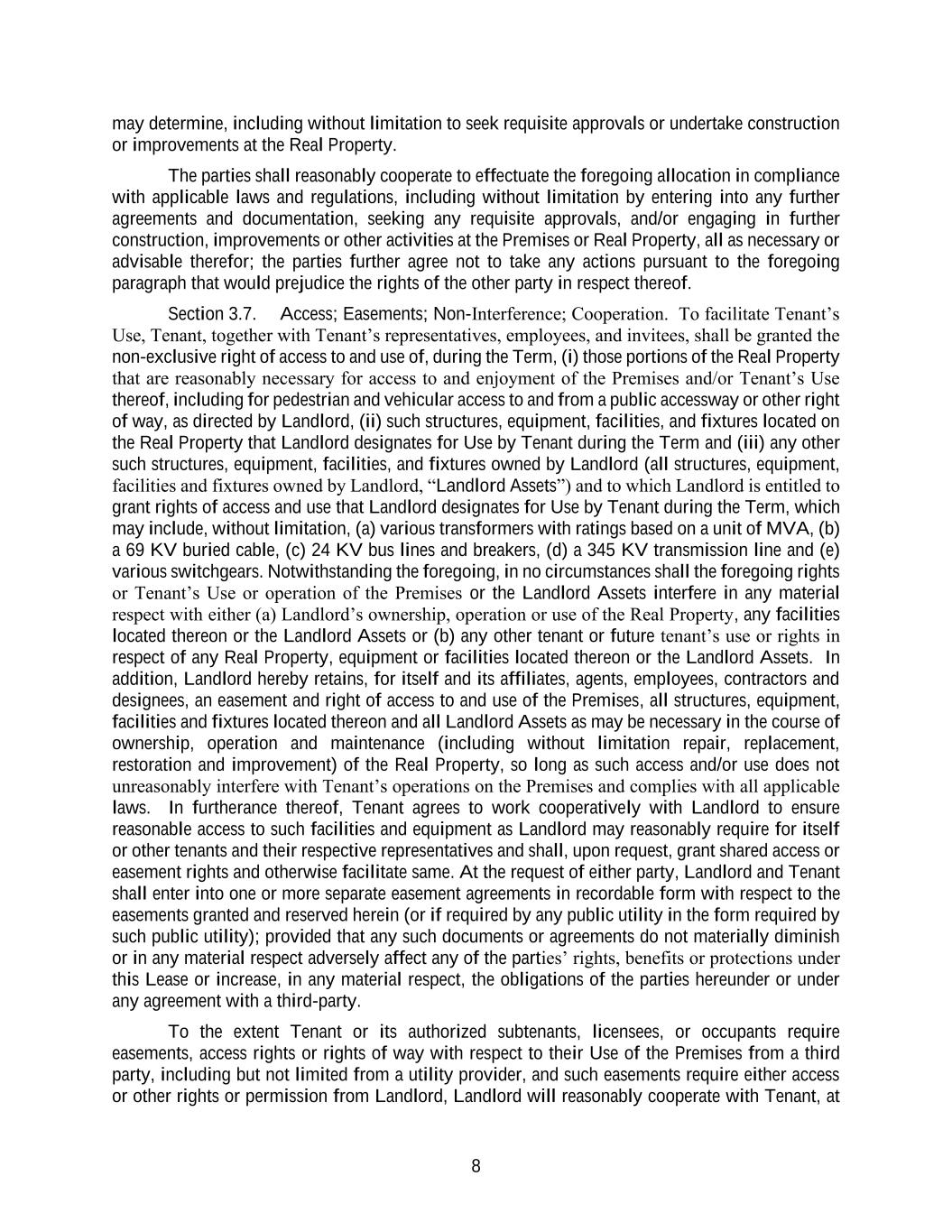 8 may determine, including without limitation to seek requisite approvals or undertake construction or improvements at the Real Property. The parties shall reasonably cooperate to effectuate the foregoing allocation in compliance with applicable laws and regulations, including without limitation by entering into any further agreements and documentation, seeking any requisite approvals, and/or engaging in further construction, improvements or other activities at the Premises or Real Property, all as necessary or advisable therefor; the parties further agree not to take any actions pursuant to the foregoing paragraph that would prejudice the rights of the other party in respect thereof. Section 3.7. Access; Easements; Non-Interference; Cooperation. To facilitate Tenant’s Use, Tenant, together with Tenant’s representatives, employees, and invitees, shall be granted the non-exclusive right of access to and use of, during the Term, (i) those portions of the Real Property that are reasonably necessary for access to and enjoyment of the Premises and/or Tenant’s Use thereof, including for pedestrian and vehicular access to and from a public accessway or other right of way, as directed by Landlord, (ii) such structures, equipment, facilities, and fixtures located on the Real Property that Landlord designates for Use by Tenant during the Term and (iii) any other such structures, equipment, facilities, and fixtures owned by Landlord (all structures, equipment, facilities and fixtures owned by Landlord, “Landlord Assets”) and to which Landlord is entitled to grant rights of access and use that Landlord designates for Use by Tenant during the Term, which may include, without limitation, (a) various transformers with ratings based on a unit of MVA, (b) a 69 KV buried cable, (c) 24 KV bus lines and breakers, (d) a 345 KV transmission line and (e) various switchgears. Notwithstanding the foregoing, in no circumstances shall the foregoing rights or Tenant’s Use or operation of the Premises or the Landlord Assets interfere in any material respect with either (a) Landlord’s ownership, operation or use of the Real Property, any facilities located thereon or the Landlord Assets or (b) any other tenant or future tenant’s use or rights in respect of any Real Property, equipment or facilities located thereon or the Landlord Assets. In addition, Landlord hereby retains, for itself and its affiliates, agents, employees, contractors and designees, an easement and right of access to and use of the Premises, all structures, equipment, facilities and fixtures located thereon and all Landlord Assets as may be necessary in the course of ownership, operation and maintenance (including without limitation repair, replacement, restoration and improvement) of the Real Property, so long as such access and/or use does not unreasonably interfere with Tenant’s operations on the Premises and complies with all applicable laws. In furtherance thereof, Tenant agrees to work cooperatively with Landlord to ensure reasonable access to such facilities and equipment as Landlord may reasonably require for itself or other tenants and their respective representatives and shall, upon request, grant shared access or easement rights and otherwise facilitate same. At the request of either party, Landlord and Tenant shall enter into one or more separate easement agreements in recordable form with respect to the easements granted and reserved herein (or if required by any public utility in the form required by such public utility); provided that any such documents or agreements do not materially diminish or in any material respect adversely affect any of the parties’ rights, benefits or protections under this Lease or increase, in any material respect, the obligations of the parties hereunder or under any agreement with a third-party. To the extent Tenant or its authorized subtenants, licensees, or occupants require easements, access rights or rights of way with respect to their Use of the Premises from a third party, including but not limited from a utility provider, and such easements require either access or other rights or permission from Landlord, Landlord will reasonably cooperate with Tenant, at