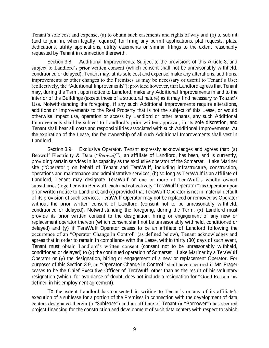 9 Tenant’s sole cost and expense, (a) to obtain such easements and rights of way and (b) to submit (and to join in, when legally required) for filing any permit applications, plat requests, plats, dedications, utility applications, utility easements or similar filings to the extent reasonably requested by Tenant in connection therewith. Section 3.8. Additional Improvements. Subject to the provisions of this Article 3, and subject to Landlord’s prior written consent (which consent shall not be unreasonably withheld, conditioned or delayed), Tenant may, at its sole cost and expense, make any alterations, additions, improvements or other changes to the Premises as may be necessary or useful to Tenant’s Use; (collectively, the “Additional Improvements”); provided however, that Landlord agrees that Tenant may, during the Term, upon notice to Landlord, make any Additional Improvements in and to the interior of the Buildings (except those of a structural nature) as it may find necessary to Tenant’s Use. Notwithstanding the foregoing, if any such Additional Improvements require alterations, additions or improvements to the Real Property that is not the subject of this Lease, or would otherwise impact use, operation or access by Landlord or other tenants, any such Additional Improvements shall be subject to Landlord’s prior written approval, in its sole discretion, and Tenant shall bear all costs and responsibilities associated with such Additional Improvements. At the expiration of the Lease, the fee ownership of all such Additional Improvements shall vest in Landlord. Section 3.9. Exclusive Operator. Tenant expressly acknowledges and agrees that: (a) Beowulf Electricity & Data (“Beowulf”), an affiliate of Landlord, has been, and is currently, providing certain services in its capacity as the exclusive operator of the Somerset – Lake Mariner site (“Operator”) on behalf of Tenant and TeraWulf, including infrastructure, construction, operations and maintenance and administrative services, (b) so long as TeraWulf is an affiliate of Landlord, Tenant may designate TeraWulf or one or more of TeraWulf’s wholly owned subsidiaries (together with Beowulf, each and collectively “TeraWulf Operator”) as Operator upon prior written notice to Landlord; and (c) provided that TeraWulf Operator is not in material default of its provision of such services, TeraWulf Operator may not be replaced or removed as Operator without the prior written consent of Landlord (consent not to be unreasonably withheld, conditioned or delayed). Notwithstanding the foregoing, during the Term, (x) Landlord must provide its prior written consent to the designation, hiring or engagement of any new or replacement operator thereon (which consent shall not be unreasonably withheld, conditioned or delayed) and (y) if TeraWulf Operator ceases to be an affiliate of Landlord following the occurrence of an “Operator Change in Control” (as defined below), Tenant acknowledges and agrees that in order to remain in compliance with the Lease, within thirty (30) days of such event, Tenant must obtain Landlord’s written consent (consent not to be unreasonably withheld, conditioned or delayed) to (x) the continued operation of Somerset – Lake Mariner by a TeraWulf Operator or (y) the designation, hiring or engagement of a new or replacement Operator. For purposes of this Section 3.9, an “Operator Change in Control” shall have occurred if Mr. Prager ceases to be the Chief Executive Officer of TeraWulf, other than as the result of his voluntary resignation (which, for avoidance of doubt, does not include a resignation for “Good Reason” as defined in his employment agreement). To the extent Landlord has consented in writing to Tenant’s or any of its affiliate’s execution of a sublease for a portion of the Premises in connection with the development of data centers designated therein (a “Sublease”) and an affiliate of Tenant (a “Borrower”) has secured project financing for the construction and development of such data centers with respect to which