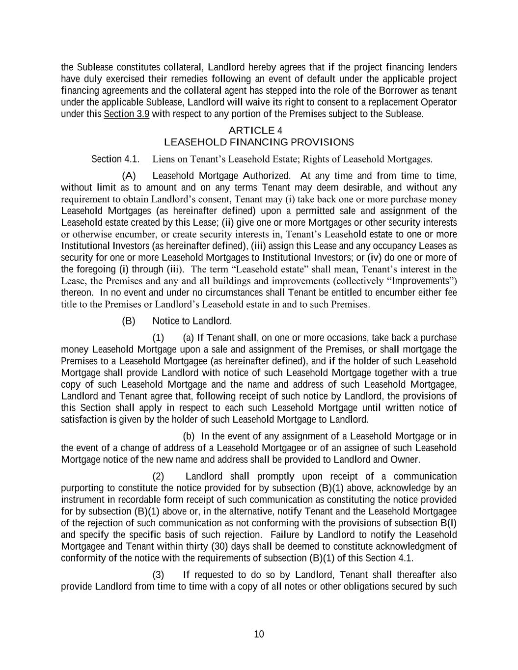 10 the Sublease constitutes collateral, Landlord hereby agrees that if the project financing lenders have duly exercised their remedies following an event of default under the applicable project financing agreements and the collateral agent has stepped into the role of the Borrower as tenant under the applicable Sublease, Landlord will waive its right to consent to a replacement Operator under this Section 3.9 with respect to any portion of the Premises subject to the Sublease. ARTICLE 4 LEASEHOLD FINANCING PROVISIONS Section 4.1. Liens on Tenant’s Leasehold Estate; Rights of Leasehold Mortgages. (A) Leasehold Mortgage Authorized. At any time and from time to time, without limit as to amount and on any terms Tenant may deem desirable, and without any requirement to obtain Landlord’s consent, Tenant may (i) take back one or more purchase money Leasehold Mortgages (as hereinafter defined) upon a permitted sale and assignment of the Leasehold estate created by this Lease; (ii) give one or more Mortgages or other security interests or otherwise encumber, or create security interests in, Tenant’s Leasehold estate to one or more Institutional Investors (as hereinafter defined), (iii) assign this Lease and any occupancy Leases as security for one or more Leasehold Mortgages to Institutional Investors; or (iv) do one or more of the foregoing (i) through (iii). The term “Leasehold estate” shall mean, Tenant’s interest in the Lease, the Premises and any and all buildings and improvements (collectively “Improvements”) thereon. In no event and under no circumstances shall Tenant be entitled to encumber either fee title to the Premises or Landlord’s Leasehold estate in and to such Premises. (B) Notice to Landlord. (1) (a) If Tenant shall, on one or more occasions, take back a purchase money Leasehold Mortgage upon a sale and assignment of the Premises, or shall mortgage the Premises to a Leasehold Mortgagee (as hereinafter defined), and if the holder of such Leasehold Mortgage shall provide Landlord with notice of such Leasehold Mortgage together with a true copy of such Leasehold Mortgage and the name and address of such Leasehold Mortgagee, Landlord and Tenant agree that, following receipt of such notice by Landlord, the provisions of this Section shall apply in respect to each such Leasehold Mortgage until written notice of satisfaction is given by the holder of such Leasehold Mortgage to Landlord. (b) In the event of any assignment of a Leasehold Mortgage or in the event of a change of address of a Leasehold Mortgagee or of an assignee of such Leasehold Mortgage notice of the new name and address shall be provided to Landlord and Owner. (2) Landlord shall promptly upon receipt of a communication purporting to constitute the notice provided for by subsection (B)(1) above, acknowledge by an instrument in recordable form receipt of such communication as constituting the notice provided for by subsection (B)(1) above or, in the alternative, notify Tenant and the Leasehold Mortgagee of the rejection of such communication as not conforming with the provisions of subsection B(l) and specify the specific basis of such rejection. Failure by Landlord to notify the Leasehold Mortgagee and Tenant within thirty (30) days shall be deemed to constitute acknowledgment of conformity of the notice with the requirements of subsection (B)(1) of this Section 4.1. (3) If requested to do so by Landlord, Tenant shall thereafter also provide Landlord from time to time with a copy of all notes or other obligations secured by such