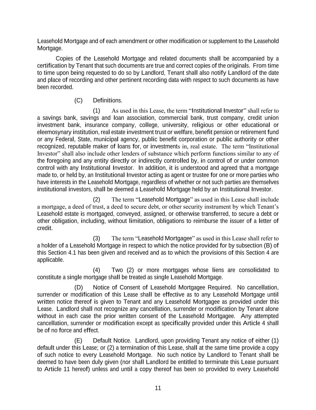 11 Leasehold Mortgage and of each amendment or other modification or supplement to the Leasehold Mortgage. Copies of the Leasehold Mortgage and related documents shall be accompanied by a certification by Tenant that such documents are true and correct copies of the originals. From time to time upon being requested to do so by Landlord, Tenant shall also notify Landlord of the date and place of recording and other pertinent recording data with respect to such documents as have been recorded. (C) Definitions. (1) As used in this Lease, the term “Institutional Investor” shall refer to a savings bank, savings and loan association, commercial bank, trust company, credit union investment bank, insurance company, college, university, religious or other educational or eleemosynary institution, real estate investment trust or welfare, benefit pension or retirement fund or any Federal, State, municipal agency, public benefit corporation or public authority or other recognized, reputable maker of loans for, or investments in, real estate. The term “Institutional Investor” shall also include other lenders of substance which perform functions similar to any of the foregoing and any entity directly or indirectly controlled by, in control of or under common control with any Institutional Investor. In addition, it is understood and agreed that a mortgage made to, or held by, an Institutional Investor acting as agent or trustee for one or more parties who have interests in the Leasehold Mortgage, regardless of whether or not such parties are themselves institutional investors, shall be deemed a Leasehold Mortgage held by an Institutional Investor. (2) The term “Leasehold Mortgage” as used in this Lease shall include a mortgage, a deed of trust, a deed to secure debt, or other security instrument by which Tenant’s Leasehold estate is mortgaged, conveyed, assigned, or otherwise transferred, to secure a debt or other obligation, including, without limitation, obligations to reimburse the issuer of a letter of credit. (3) The term “Leasehold Mortgagee” as used in this Lease shall refer to a holder of a Leasehold Mortgage in respect to which the notice provided for by subsection (B) of this Section 4.1 has been given and received and as to which the provisions of this Section 4 are applicable. (4) Two (2) or more mortgages whose liens are consolidated to constitute a single mortgage shall be treated as single Leasehold Mortgage. (D) Notice of Consent of Leasehold Mortgagee Required. No cancellation, surrender or modification of this Lease shall be effective as to any Leasehold Mortgage until written notice thereof is given to Tenant and any Leasehold Mortgagee as provided under this Lease. Landlord shall not recognize any cancellation, surrender or modification by Tenant alone without in each case the prior written consent of the Leasehold Mortgagee. Any attempted cancellation, surrender or modification except as specifically provided under this Article 4 shall be of no force and effect. (E) Default Notice. Landlord, upon providing Tenant any notice of either (1) default under this Lease; or (2) a termination of this Lease, shall at the same time provide a copy of such notice to every Leasehold Mortgage. No such notice by Landlord to Tenant shall be deemed to have been duly given (nor shall Landlord be entitled to terminate this Lease pursuant to Article 11 hereof) unless and until a copy thereof has been so provided to every Leasehold