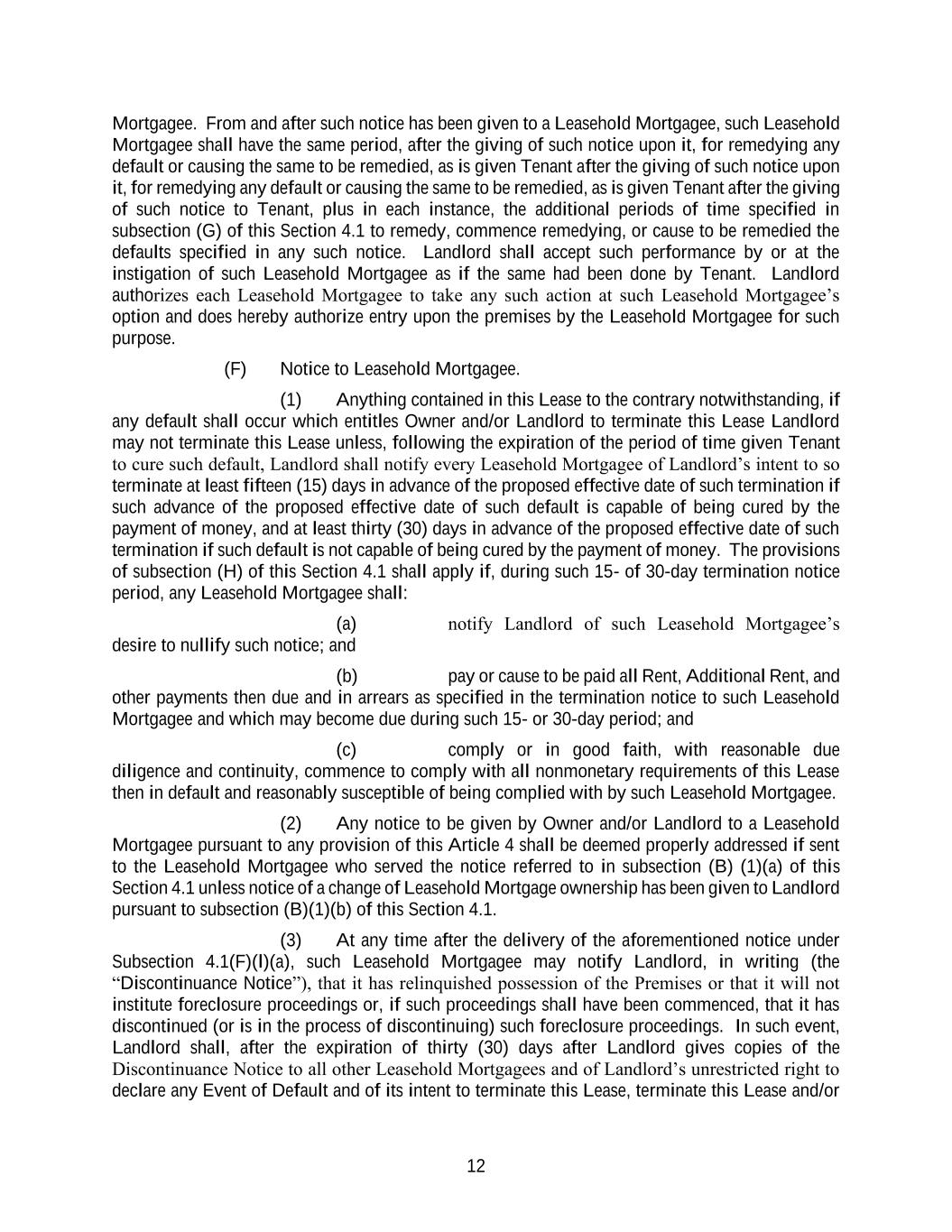 12 Mortgagee. From and after such notice has been given to a Leasehold Mortgagee, such Leasehold Mortgagee shall have the same period, after the giving of such notice upon it, for remedying any default or causing the same to be remedied, as is given Tenant after the giving of such notice upon it, for remedying any default or causing the same to be remedied, as is given Tenant after the giving of such notice to Tenant, plus in each instance, the additional periods of time specified in subsection (G) of this Section 4.1 to remedy, commence remedying, or cause to be remedied the defaults specified in any such notice. Landlord shall accept such performance by or at the instigation of such Leasehold Mortgagee as if the same had been done by Tenant. Landlord authorizes each Leasehold Mortgagee to take any such action at such Leasehold Mortgagee’s option and does hereby authorize entry upon the premises by the Leasehold Mortgagee for such purpose. (F) Notice to Leasehold Mortgagee. (1) Anything contained in this Lease to the contrary notwithstanding, if any default shall occur which entitles Owner and/or Landlord to terminate this Lease Landlord may not terminate this Lease unless, following the expiration of the period of time given Tenant to cure such default, Landlord shall notify every Leasehold Mortgagee of Landlord’s intent to so terminate at least fifteen (15) days in advance of the proposed effective date of such termination if such advance of the proposed effective date of such default is capable of being cured by the payment of money, and at least thirty (30) days in advance of the proposed effective date of such termination if such default is not capable of being cured by the payment of money. The provisions of subsection (H) of this Section 4.1 shall apply if, during such 15- of 30-day termination notice period, any Leasehold Mortgagee shall: (a) notify Landlord of such Leasehold Mortgagee’s desire to nullify such notice; and (b) pay or cause to be paid all Rent, Additional Rent, and other payments then due and in arrears as specified in the termination notice to such Leasehold Mortgagee and which may become due during such 15- or 30-day period; and (c) comply or in good faith, with reasonable due diligence and continuity, commence to comply with all nonmonetary requirements of this Lease then in default and reasonably susceptible of being complied with by such Leasehold Mortgagee. (2) Any notice to be given by Owner and/or Landlord to a Leasehold Mortgagee pursuant to any provision of this Article 4 shall be deemed properly addressed if sent to the Leasehold Mortgagee who served the notice referred to in subsection (B) (1)(a) of this Section 4.1 unless notice of a change of Leasehold Mortgage ownership has been given to Landlord pursuant to subsection (B)(1)(b) of this Section 4.1. (3) At any time after the delivery of the aforementioned notice under Subsection 4.1(F)(l)(a), such Leasehold Mortgagee may notify Landlord, in writing (the “Discontinuance Notice”), that it has relinquished possession of the Premises or that it will not institute foreclosure proceedings or, if such proceedings shall have been commenced, that it has discontinued (or is in the process of discontinuing) such foreclosure proceedings. In such event, Landlord shall, after the expiration of thirty (30) days after Landlord gives copies of the Discontinuance Notice to all other Leasehold Mortgagees and of Landlord’s unrestricted right to declare any Event of Default and of its intent to terminate this Lease, terminate this Lease and/or
