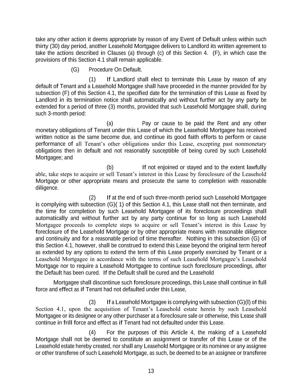 13 take any other action it deems appropriate by reason of any Event of Default unless within such thirty (30) day period, another Leasehold Mortgagee delivers to Landlord its written agreement to take the actions described in Clauses (a) through (c) of this Section 4. (F), in which case the provisions of this Section 4.1 shall remain applicable. (G) Procedure On Default. (1) If Landlord shall elect to terminate this Lease by reason of any default of Tenant and a Leasehold Mortgagee shall have proceeded in the manner provided for by subsection (F) of this Section 4.1, the specified date for the termination of this Lease as fixed by Landlord in its termination notice shall automatically and without further act by any party be extended for a period of three (3) months, provided that such Leasehold Mortgagee shall, during such 3-month period: (a) Pay or cause to be paid the Rent and any other monetary obligations of Tenant under this Lease of which the Leasehold Mortgagee has received written notice as the same become due, and continue its good faith efforts to perform or cause performance of all Tenant’s other obligations under this Lease, excepting past nonmonetary obligations then in default and not reasonably susceptible of being cured by such Leasehold Mortgagee; and (b) If not enjoined or stayed and to the extent lawfully able, take steps to acquire or sell Tenant’s interest in this Lease by foreclosure of the Leasehold Mortgage or other appropriate means and prosecute the same to completion with reasonable diligence. (2) If at the end of such three-month period such Leasehold Mortgagee is complying with subsection (G)( 1) of this Section 4.1, this Lease shall not then terminate, and the time for completion by such Leasehold Mortgagee of its foreclosure proceedings shall automatically and without further act by any party continue for so long as such Leasehold Mortgagee proceeds to complete steps to acquire or sell Tenant’s interest in this Lease by foreclosure of the Leasehold Mortgage or by other appropriate means with reasonable diligence and continuity and for a reasonable period of time thereafter. Nothing in this subsection (G) of this Section 4.1, however, shall be construed to extend this Lease beyond the original term hereof as extended by any options to extend the term of this Lease properly exercised by Tenant or a Leasehold Mortgagee in accordance with the terms of such Leasehold Mortgagee’s Leasehold Mortgage nor to require a Leasehold Mortgagee to continue such foreclosure proceedings, after the Default has been cured. If the Default shall be cured and the Leasehold Mortgagee shall discontinue such foreclosure proceedings, this Lease shall continue in full force and effect as if Tenant had not defaulted under this Lease, (3) If a Leasehold Mortgagee is complying with subsection (G)(l) of this Section 4.1, upon the acquisition of Tenant’s Leasehold estate herein by such Leasehold Mortgagee or its designee or any other purchaser at a foreclosure sale or otherwise, this Lease shall continue in frill force and effect as if Tenant had not defaulted under this Lease. (4) For the purposes of this Article 4, the making of a Leasehold Mortgage shall not be deemed to constitute an assignment or transfer of this Lease or of the Leasehold estate hereby created, nor shall any Leasehold Mortgagee or its nominee or any assignee or other transferee of such Leasehold Mortgage, as such, be deemed to be an assignee or transferee
