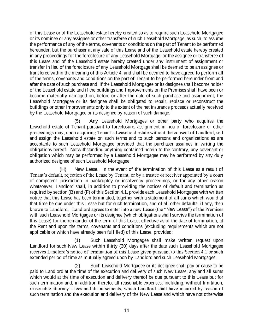 14 of this Lease or of the Leasehold estate hereby created so as to require such Leasehold Mortgagee or its nominee or any assignee or other transferee of such Leasehold Mortgage, as such, to assume the performance of any of the terms, covenants or conditions on the part of Tenant to be performed hereunder, but the purchaser at any sale of this Lease and of the Leasehold estate hereby created in any proceedings for the foreclosure of any Leasehold Mortgage, or the assignee or transferee of this Lease and of the Leasehold estate hereby created under any instrument of assignment or transfer in lieu of the foreclosure of any Leasehold Mortgage shall be deemed to be an assignee or transferee within the meaning of this Article 4, and shall be deemed to have agreed to perform all of the terms, covenants and conditions on the part of Tenant to be performed hereunder from and after the date of such purchase and If the Leasehold Mortgagee or its designee shall become holder of the Leasehold estate and if the buildings and Improvements on the Premises shall have been or become materially damaged on, before or after the date of such purchase and assignment, the Leasehold Mortgagee or its designee shall be obligated to repair, replace or reconstruct the buildings or other Improvements only to the extent of the net insurance proceeds actually received by the Leasehold Mortgagee or its designee by reason of such damage. (5) Any Leasehold Mortgagee or other party who acquires the Leasehold estate of Tenant pursuant to foreclosure, assignment in lieu of foreclosure or other proceedings may, upon acquiring Tenant’s Leasehold estate without the consent of Landlord, sell and assign the Leasehold estate on such terms and to such persons and organizations as are acceptable to such Leasehold Mortgagee provided that the purchaser assumes in writing the obligations hereof. Notwithstanding anything contained herein to the contrary, any covenant or obligation which may be performed by a Leasehold Mortgagee may be performed by any duly authorized designee of such Leasehold Mortgagee. (H) New Lease. In the event of the termination of this Lease as a result of Tenant’s default, rejection of the Lease by Tenant, or by a trustee or receiver appointed by a court of competent jurisdiction in bankruptcy or insolvency proceedings, or for any other reason whatsoever, Landlord shall, in addition to providing the notices of default and termination as required by section (B) and (F) of this Section 4.1, provide each Leasehold Mortgagee with written notice that this Lease has been terminated, together with a statement of all sums which would at that time be due under this Lease but for such termination, and of all other defaults, if any, then known to Landlord. Landlord agrees to enter into a new Lease (the “New Lease”) of the Premises with such Leasehold Mortgagee or its designee (which obligations shall survive the termination of this Lease) for the remainder of the term of this Lease, effective as of the date of termination, at the Rent and upon the terms, covenants and conditions (excluding requirements which are not applicable or which have already been fulfilled) of this Lease, provided: (1) Such Leasehold Mortgagee shall make written request upon Landlord for such New Lease within thirty (30) days after the date such Leasehold Mortgagee receives Landlord’s notice of termination of this Lease given pursuant to this Section 4.1 or such extended period of time as mutually agreed upon by Landlord and such Leasehold Mortgagee. (2) Such Leasehold Mortgagee or its designee shall pay or cause to be paid to Landlord at the time of the execution and delivery of such New Lease, any and all sums which would at the time of execution and delivery thereof be due pursuant to this Lease but for such termination and, in addition thereto, all reasonable expenses, including, without limitation, reasonable attorney’s fees and disbursements, which Landlord shall have incurred by reason of such termination and the execution and delivery of the New Lease and which have not otherwise