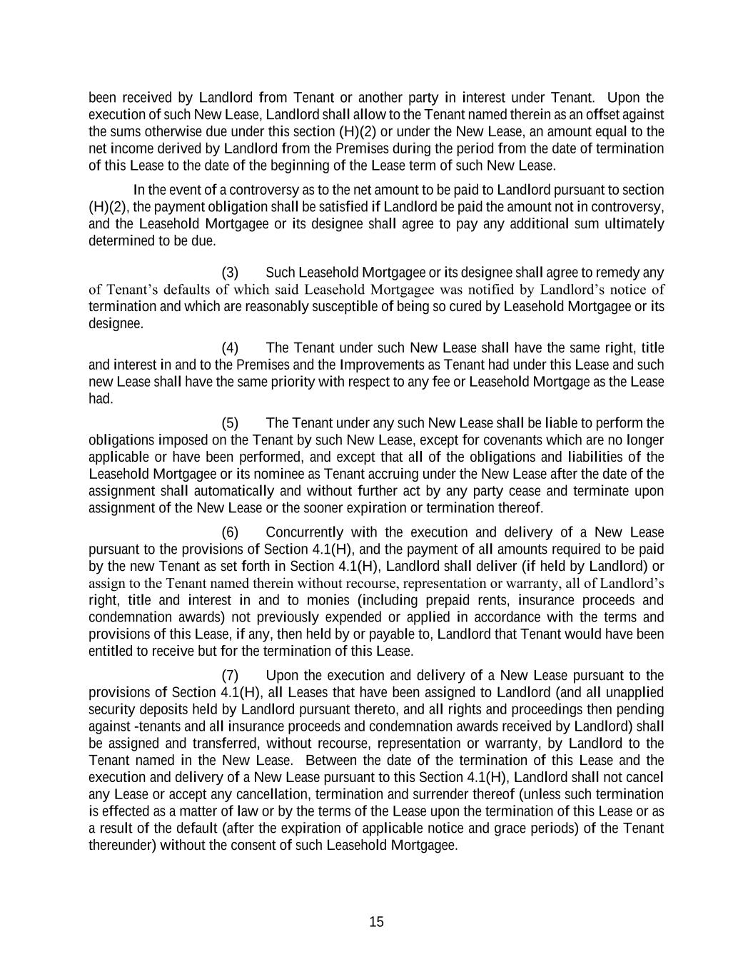 15 been received by Landlord from Tenant or another party in interest under Tenant. Upon the execution of such New Lease, Landlord shall allow to the Tenant named therein as an offset against the sums otherwise due under this section (H)(2) or under the New Lease, an amount equal to the net income derived by Landlord from the Premises during the period from the date of termination of this Lease to the date of the beginning of the Lease term of such New Lease. In the event of a controversy as to the net amount to be paid to Landlord pursuant to section (H)(2), the payment obligation shall be satisfied if Landlord be paid the amount not in controversy, and the Leasehold Mortgagee or its designee shall agree to pay any additional sum ultimately determined to be due. (3) Such Leasehold Mortgagee or its designee shall agree to remedy any of Tenant’s defaults of which said Leasehold Mortgagee was notified by Landlord’s notice of termination and which are reasonably susceptible of being so cured by Leasehold Mortgagee or its designee. (4) The Tenant under such New Lease shall have the same right, title and interest in and to the Premises and the Improvements as Tenant had under this Lease and such new Lease shall have the same priority with respect to any fee or Leasehold Mortgage as the Lease had. (5) The Tenant under any such New Lease shall be liable to perform the obligations imposed on the Tenant by such New Lease, except for covenants which are no longer applicable or have been performed, and except that all of the obligations and liabilities of the Leasehold Mortgagee or its nominee as Tenant accruing under the New Lease after the date of the assignment shall automatically and without further act by any party cease and terminate upon assignment of the New Lease or the sooner expiration or termination thereof. (6) Concurrently with the execution and delivery of a New Lease pursuant to the provisions of Section 4.1(H), and the payment of all amounts required to be paid by the new Tenant as set forth in Section 4.1(H), Landlord shall deliver (if held by Landlord) or assign to the Tenant named therein without recourse, representation or warranty, all of Landlord’s right, title and interest in and to monies (including prepaid rents, insurance proceeds and condemnation awards) not previously expended or applied in accordance with the terms and provisions of this Lease, if any, then held by or payable to, Landlord that Tenant would have been entitled to receive but for the termination of this Lease. (7) Upon the execution and delivery of a New Lease pursuant to the provisions of Section 4.1(H), all Leases that have been assigned to Landlord (and all unapplied security deposits held by Landlord pursuant thereto, and all rights and proceedings then pending against -tenants and all insurance proceeds and condemnation awards received by Landlord) shall be assigned and transferred, without recourse, representation or warranty, by Landlord to the Tenant named in the New Lease. Between the date of the termination of this Lease and the execution and delivery of a New Lease pursuant to this Section 4.1(H), Landlord shall not cancel any Lease or accept any cancellation, termination and surrender thereof (unless such termination is effected as a matter of law or by the terms of the Lease upon the termination of this Lease or as a result of the default (after the expiration of applicable notice and grace periods) of the Tenant thereunder) without the consent of such Leasehold Mortgagee.