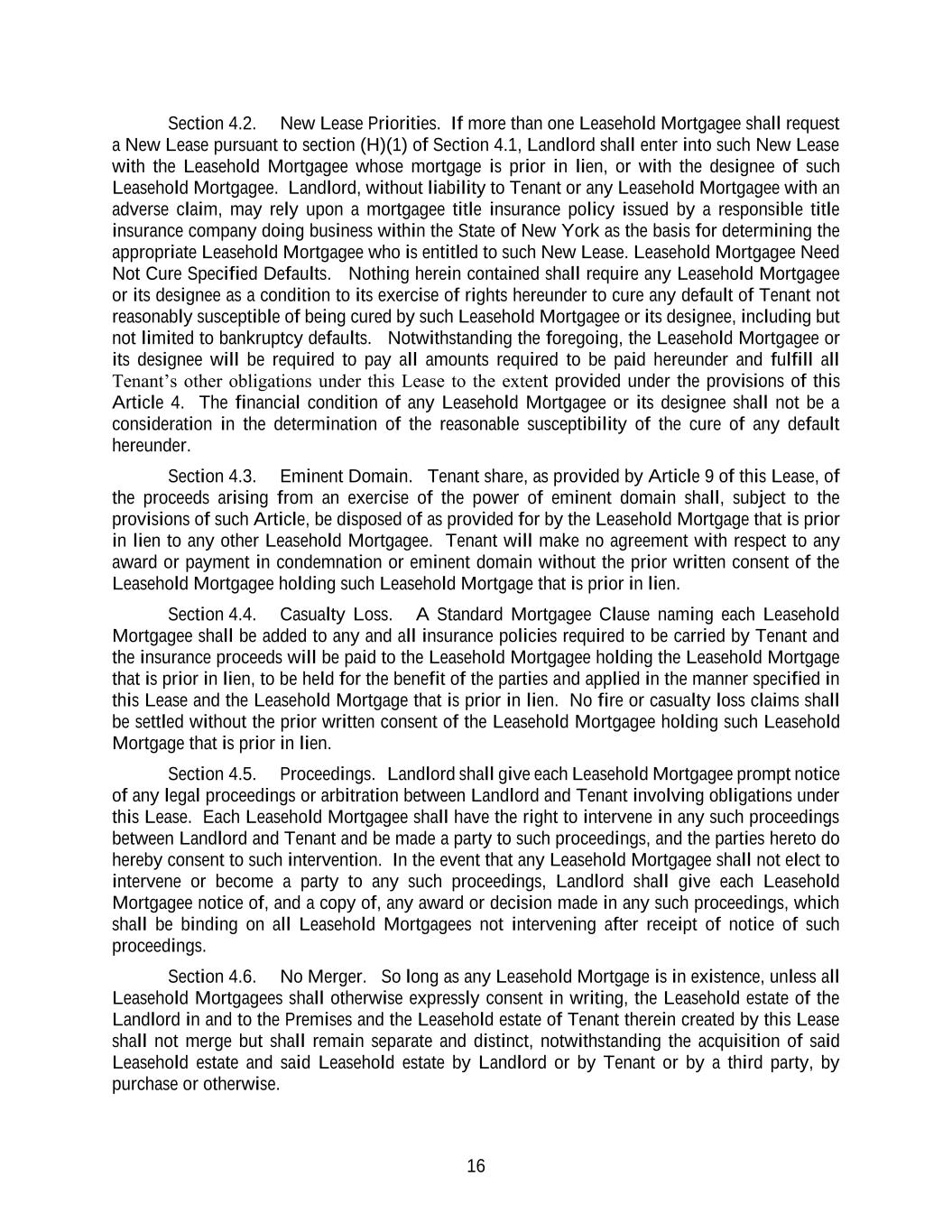 16 Section 4.2. New Lease Priorities. If more than one Leasehold Mortgagee shall request a New Lease pursuant to section (H)(1) of Section 4.1, Landlord shall enter into such New Lease with the Leasehold Mortgagee whose mortgage is prior in lien, or with the designee of such Leasehold Mortgagee. Landlord, without liability to Tenant or any Leasehold Mortgagee with an adverse claim, may rely upon a mortgagee title insurance policy issued by a responsible title insurance company doing business within the State of New York as the basis for determining the appropriate Leasehold Mortgagee who is entitled to such New Lease. Leasehold Mortgagee Need Not Cure Specified Defaults. Nothing herein contained shall require any Leasehold Mortgagee or its designee as a condition to its exercise of rights hereunder to cure any default of Tenant not reasonably susceptible of being cured by such Leasehold Mortgagee or its designee, including but not limited to bankruptcy defaults. Notwithstanding the foregoing, the Leasehold Mortgagee or its designee will be required to pay all amounts required to be paid hereunder and fulfill all Tenant’s other obligations under this Lease to the extent provided under the provisions of this Article 4. The financial condition of any Leasehold Mortgagee or its designee shall not be a consideration in the determination of the reasonable susceptibility of the cure of any default hereunder. Section 4.3. Eminent Domain. Tenant share, as provided by Article 9 of this Lease, of the proceeds arising from an exercise of the power of eminent domain shall, subject to the provisions of such Article, be disposed of as provided for by the Leasehold Mortgage that is prior in lien to any other Leasehold Mortgagee. Tenant will make no agreement with respect to any award or payment in condemnation or eminent domain without the prior written consent of the Leasehold Mortgagee holding such Leasehold Mortgage that is prior in lien. Section 4.4. Casualty Loss. A Standard Mortgagee Clause naming each Leasehold Mortgagee shall be added to any and all insurance policies required to be carried by Tenant and the insurance proceeds will be paid to the Leasehold Mortgagee holding the Leasehold Mortgage that is prior in lien, to be held for the benefit of the parties and applied in the manner specified in this Lease and the Leasehold Mortgage that is prior in lien. No fire or casualty loss claims shall be settled without the prior written consent of the Leasehold Mortgagee holding such Leasehold Mortgage that is prior in lien. Section 4.5. Proceedings. Landlord shall give each Leasehold Mortgagee prompt notice of any legal proceedings or arbitration between Landlord and Tenant involving obligations under this Lease. Each Leasehold Mortgagee shall have the right to intervene in any such proceedings between Landlord and Tenant and be made a party to such proceedings, and the parties hereto do hereby consent to such intervention. In the event that any Leasehold Mortgagee shall not elect to intervene or become a party to any such proceedings, Landlord shall give each Leasehold Mortgagee notice of, and a copy of, any award or decision made in any such proceedings, which shall be binding on all Leasehold Mortgagees not intervening after receipt of notice of such proceedings. Section 4.6. No Merger. So long as any Leasehold Mortgage is in existence, unless all Leasehold Mortgagees shall otherwise expressly consent in writing, the Leasehold estate of the Landlord in and to the Premises and the Leasehold estate of Tenant therein created by this Lease shall not merge but shall remain separate and distinct, notwithstanding the acquisition of said Leasehold estate and said Leasehold estate by Landlord or by Tenant or by a third party, by purchase or otherwise.