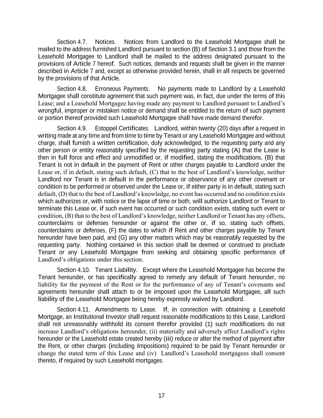 17 Section 4.7. Notices. Notices from Landlord to the Leasehold Mortgagee shall be mailed to the address furnished Landlord pursuant to section (B) of Section 3.1 and those from the Leasehold Mortgagee to Landlord shall be mailed to the address designated pursuant to the provisions of Article 7 hereof. Such notices, demands and requests shall be given in the manner described in Article 7 and, except as otherwise provided herein, shall in all respects be governed by the provisions of that Article. Section 4.8. Erroneous Payments. No payments made to Landlord by a Leasehold Mortgagee shall constitute agreement that such payment was, in fact, due under the terms of this Lease; and a Leasehold Mortgagee having made any payment to Landlord pursuant to Landlord’s wrongful, improper or mistaken notice or demand shall be entitled to the return of such payment or portion thereof provided such Leasehold Mortgagee shall have made demand therefor. Section 4.9. Estoppel Certificates. Landlord, within twenty (20) days after a request in writing made at any time and from time to time by Tenant or any Leasehold Mortgagee and without charge, shall furnish a written certification, duly acknowledged, to the requesting party and any other person or entity reasonably specified by the requesting party stating (A) that the Lease is then in full force and effect and unmodified or, if modified, stating the modifications, (B) that Tenant is not in default in the payment of Rent or other charges payable to Landlord under the Lease or, if in default, stating such default, (C) that to the best of Landlord’s knowledge, neither Landlord nor Tenant is in default in the performance or observance of any other covenant or condition to be performed or observed under the Lease or, if either party is in default, stating such default, (D) that to the best of Landlord’s knowledge, no event has occurred and no condition exists which authorizes or, with notice or the lapse of time or both, will authorize Landlord or Tenant to terminate this Lease or, if such event has occurred or such condition exists, stating such event or condition, (B) that to the best of Landlord’s knowledge, neither Landlord or Tenant has any offsets, counterclaims or defenses hereunder or against the other or, if so, stating such offsets, counterclaims or defenses, (F) the dates to which if Rent and other charges payable by Tenant hereunder have been paid, and (G) any other matters which may be reasonably requested by the requesting party. Nothing contained in this section shall be deemed or construed to preclude Tenant or any Leasehold Mortgagee from seeking and obtaining specific performance of Landlord’s obligations under this section. Section 4.10. Tenant Liability. Except where the Leasehold Mortgagee has become the Tenant hereunder, or has specifically agreed to remedy any default of Tenant hereunder, no liability for the payment of the Rent or for the performance of any of Tenant’s covenants and agreements hereunder shall attach to or be imposed upon the Leasehold Mortgagee, all such liability of the Leasehold Mortgagee being hereby expressly waived by Landlord. Section 4.11. Amendments to Lease. If, in connection with obtaining a Leasehold Mortgage, an Institutional Investor shall request reasonable modifications to this Lease, Landlord shall not unreasonably withhold its consent therefor provided (1) such modifications do not increase Landlord’s obligations hereunder, (ii) materially and adversely affect Landlord’s rights hereunder or the Leasehold estate created hereby (iii) reduce or alter the method of payment after the Rent, or other charges (including Impositions) required to be paid by Tenant hereunder or change the stated term of this Lease and (iv) Landlord’s Leasehold mortgagees shall consent thereto, if required by such Leasehold mortgages.