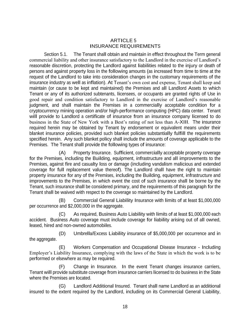 18 ARTICLE 5 INSURANCE REQUIREMENTS Section 5.1. The Tenant shall obtain and maintain in effect throughout the Term general commercial liability and other insurance satisfactory to the Landlord in the exercise of Landlord’s reasonable discretion, protecting the Landlord against liabilities related to the injury or death of persons and against property loss in the following amounts (as increased from time to time at the request of the Landlord to take into consideration changes in the customary requirements of the insurance industry as well as inflation). At Tenant’s own cost and expense, Tenant shall keep and maintain (or cause to be kept and maintained) the Premises and all Landlord Assets to which Tenant or any of its authorized subtenants, licensees, or occupants are granted rights of Use in good repair and condition satisfactory to Landlord in the exercise of Landlord’s reasonable judgment, and shall maintain the Premises in a commercially acceptable condition for a cryptocurrency mining operation and/or high-performance computing (HPC) data center. Tenant will provide to Landlord a certificate of insurance from an insurance company licensed to do business in the State of New York with a Best’s rating of not less than A-XIII. The insurance required herein may be obtained by Tenant by endorsement or equivalent means under their blanket insurance policies, provided such blanket policies substantially fulfill the requirements specified herein. Any such blanket policy shall include the amounts of coverage applicable to the Premises. The Tenant shall provide the following types of insurance: (A) Property Insurance. Sufficient, commercially acceptable property coverage for the Premises, including the Building, equipment, infrastructure and all improvements to the Premises, against fire and casualty loss or damage (including vandalism malicious and extended coverage for full replacement value thereof). The Landlord shall have the right to maintain property insurance for any of the Premises, including the Building, equipment, infrastructure and improvements to the Premises, in which event the cost of such insurance shall be borne by the Tenant, such insurance shall be considered primary, and the requirements of this paragraph for the Tenant shall be waived with respect to the coverage so maintained by the Landlord. (B) Commercial General Liability Insurance with limits of at least $1,000,000 per occurrence and $2,000,000 in the aggregate. (C) As required, Business Auto Liability with limits of at least $1,000,000 each accident. Business Auto coverage must include coverage for liability arising out of all owned, leased, hired and non-owned automobiles. (D) Umbrella/Excess Liability insurance of $5,000,000 per occurrence and in the aggregate. (E) Workers Compensation and Occupational Disease Insurance - Including Employer’s Liability Insurance, complying with the laws of the State in which the work is to be performed or elsewhere as may be required. (F) Change in Insurance. In the event Tenant changes insurance carriers, Tenant will provide substitute coverage from insurance carriers licensed to do business in the State where the Premises are located. (G) Landlord Additional Insured. Tenant shall name Landlord as an additional insured to the extent required by the Landlord, including on its Commercial General Liability,
