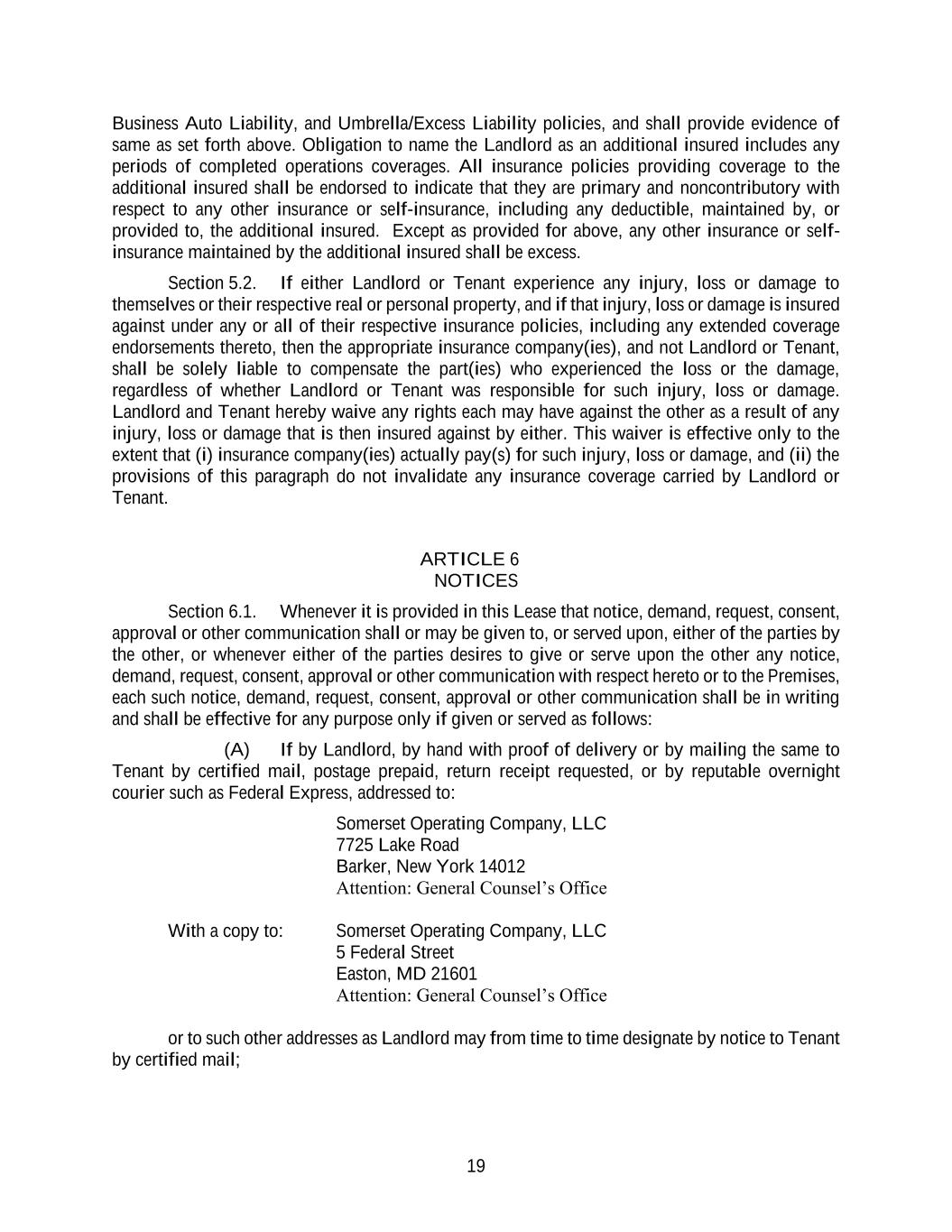 19 Business Auto Liability, and Umbrella/Excess Liability policies, and shall provide evidence of same as set forth above. Obligation to name the Landlord as an additional insured includes any periods of completed operations coverages. All insurance policies providing coverage to the additional insured shall be endorsed to indicate that they are primary and noncontributory with respect to any other insurance or self-insurance, including any deductible, maintained by, or provided to, the additional insured. Except as provided for above, any other insurance or self- insurance maintained by the additional insured shall be excess. Section 5.2. If either Landlord or Tenant experience any injury, loss or damage to themselves or their respective real or personal property, and if that injury, loss or damage is insured against under any or all of their respective insurance policies, including any extended coverage endorsements thereto, then the appropriate insurance company(ies), and not Landlord or Tenant, shall be solely liable to compensate the part(ies) who experienced the loss or the damage, regardless of whether Landlord or Tenant was responsible for such injury, loss or damage. Landlord and Tenant hereby waive any rights each may have against the other as a result of any injury, loss or damage that is then insured against by either. This waiver is effective only to the extent that (i) insurance company(ies) actually pay(s) for such injury, loss or damage, and (ii) the provisions of this paragraph do not invalidate any insurance coverage carried by Landlord or Tenant. ARTICLE 6 NOTICES Section 6.1. Whenever it is provided in this Lease that notice, demand, request, consent, approval or other communication shall or may be given to, or served upon, either of the parties by the other, or whenever either of the parties desires to give or serve upon the other any notice, demand, request, consent, approval or other communication with respect hereto or to the Premises, each such notice, demand, request, consent, approval or other communication shall be in writing and shall be effective for any purpose only if given or served as follows: (A) If by Landlord, by hand with proof of delivery or by mailing the same to Tenant by certified mail, postage prepaid, return receipt requested, or by reputable overnight courier such as Federal Express, addressed to: Somerset Operating Company, LLC 7725 Lake Road Barker, New York 14012 Attention: General Counsel’s Office With a copy to: Somerset Operating Company, LLC 5 Federal Street Easton, MD 21601 Attention: General Counsel’s Office or to such other addresses as Landlord may from time to time designate by notice to Tenant by certified mail;