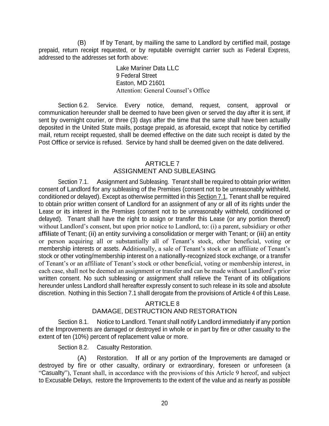 20 (B) If by Tenant, by mailing the same to Landlord by certified mail, postage prepaid, return receipt requested, or by reputable overnight carrier such as Federal Express, addressed to the addresses set forth above: Lake Mariner Data LLC 9 Federal Street Easton, MD 21601 Attention: General Counsel’s Office Section 6.2. Service. Every notice, demand, request, consent, approval or communication hereunder shall be deemed to have been given or served the day after it is sent, if sent by overnight courier, or three (3) days after the time that the same shall have been actually deposited in the United State mails, postage prepaid, as aforesaid, except that notice by certified mail, return receipt requested, shall be deemed effective on the date such receipt is dated by the Post Office or service is refused. Service by hand shall be deemed given on the date delivered. ARTICLE 7 ASSIGNMENT AND SUBLEASING Section 7.1. Assignment and Subleasing. Tenant shall be required to obtain prior written consent of Landlord for any subleasing of the Premises (consent not to be unreasonably withheld, conditioned or delayed). Except as otherwise permitted in this Section 7.1, Tenant shall be required to obtain prior written consent of Landlord for an assignment of any or all of its rights under the Lease or its interest in the Premises (consent not to be unreasonably withheld, conditioned or delayed). Tenant shall have the right to assign or transfer this Lease (or any portion thereof) without Landlord’s consent, but upon prior notice to Landlord, to: (i) a parent, subsidiary or other affiliate of Tenant; (ii) an entity surviving a consolidation or merger with Tenant; or (iii) an entity or person acquiring all or substantially all of Tenant’s stock, other beneficial, voting or membership interests or assets. Additionally, a sale of Tenant’s stock or an affiliate of Tenant’s stock or other voting/membership interest on a nationally-recognized stock exchange, or a transfer of Tenant’s or an affiliate of Tenant’s stock or other beneficial, voting or membership interest, in each case, shall not be deemed an assignment or transfer and can be made without Landlord’s prior written consent. No such subleasing or assignment shall relieve the Tenant of its obligations hereunder unless Landlord shall hereafter expressly consent to such release in its sole and absolute discretion. Nothing in this Section 7.1 shall derogate from the provisions of Article 4 of this Lease. ARTICLE 8 DAMAGE, DESTRUCTION AND RESTORATION Section 8.1. Notice to Landlord. Tenant shall notify Landlord immediately if any portion of the Improvements are damaged or destroyed in whole or in part by fire or other casualty to the extent of ten (10%) percent of replacement value or more. Section 8.2. Casualty Restoration. (A) Restoration. If all or any portion of the Improvements are damaged or destroyed by fire or other casualty, ordinary or extraordinary, foreseen or unforeseen (a “Casualty”), Tenant shall, in accordance with the provisions of this Article 9 hereof, and subject to Excusable Delays, restore the Improvements to the extent of the value and as nearly as possible