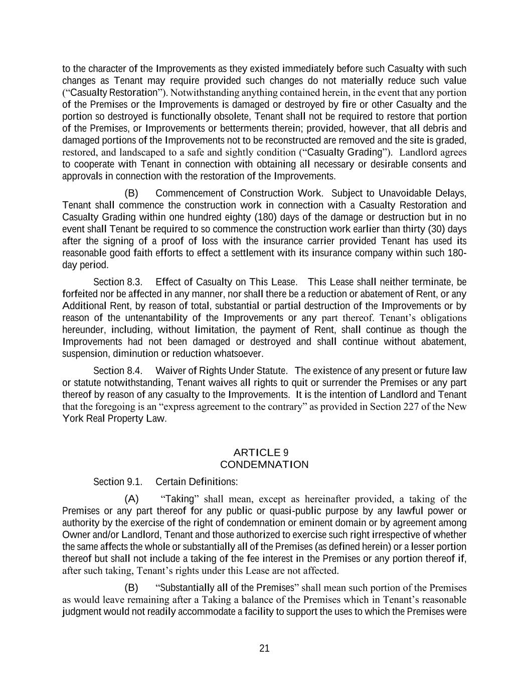 21 to the character of the Improvements as they existed immediately before such Casualty with such changes as Tenant may require provided such changes do not materially reduce such value (“Casualty Restoration”). Notwithstanding anything contained herein, in the event that any portion of the Premises or the Improvements is damaged or destroyed by fire or other Casualty and the portion so destroyed is functionally obsolete, Tenant shall not be required to restore that portion of the Premises, or Improvements or betterments therein; provided, however, that all debris and damaged portions of the Improvements not to be reconstructed are removed and the site is graded, restored, and landscaped to a safe and sightly condition (“Casualty Grading”). Landlord agrees to cooperate with Tenant in connection with obtaining all necessary or desirable consents and approvals in connection with the restoration of the Improvements. (B) Commencement of Construction Work. Subject to Unavoidable Delays, Tenant shall commence the construction work in connection with a Casualty Restoration and Casualty Grading within one hundred eighty (180) days of the damage or destruction but in no event shall Tenant be required to so commence the construction work earlier than thirty (30) days after the signing of a proof of loss with the insurance carrier provided Tenant has used its reasonable good faith efforts to effect a settlement with its insurance company within such 180- day period. Section 8.3. Effect of Casualty on This Lease. This Lease shall neither terminate, be forfeited nor be affected in any manner, nor shall there be a reduction or abatement of Rent, or any Additional Rent, by reason of total, substantial or partial destruction of the Improvements or by reason of the untenantability of the Improvements or any part thereof. Tenant’s obligations hereunder, including, without limitation, the payment of Rent, shall continue as though the Improvements had not been damaged or destroyed and shall continue without abatement, suspension, diminution or reduction whatsoever. Section 8.4. Waiver of Rights Under Statute. The existence of any present or future law or statute notwithstanding, Tenant waives all rights to quit or surrender the Premises or any part thereof by reason of any casualty to the Improvements. It is the intention of Landlord and Tenant that the foregoing is an “express agreement to the contrary” as provided in Section 227 of the New York Real Property Law. ARTICLE 9 CONDEMNATION Section 9.1. Certain Definitions: (A) “Taking” shall mean, except as hereinafter provided, a taking of the Premises or any part thereof for any public or quasi-public purpose by any lawful power or authority by the exercise of the right of condemnation or eminent domain or by agreement among Owner and/or Landlord, Tenant and those authorized to exercise such right irrespective of whether the same affects the whole or substantially all of the Premises (as defined herein) or a lesser portion thereof but shall not include a taking of the fee interest in the Premises or any portion thereof if, after such taking, Tenant’s rights under this Lease are not affected. (B) “Substantially all of the Premises” shall mean such portion of the Premises as would leave remaining after a Taking a balance of the Premises which in Tenant’s reasonable judgment would not readily accommodate a facility to support the uses to which the Premises were