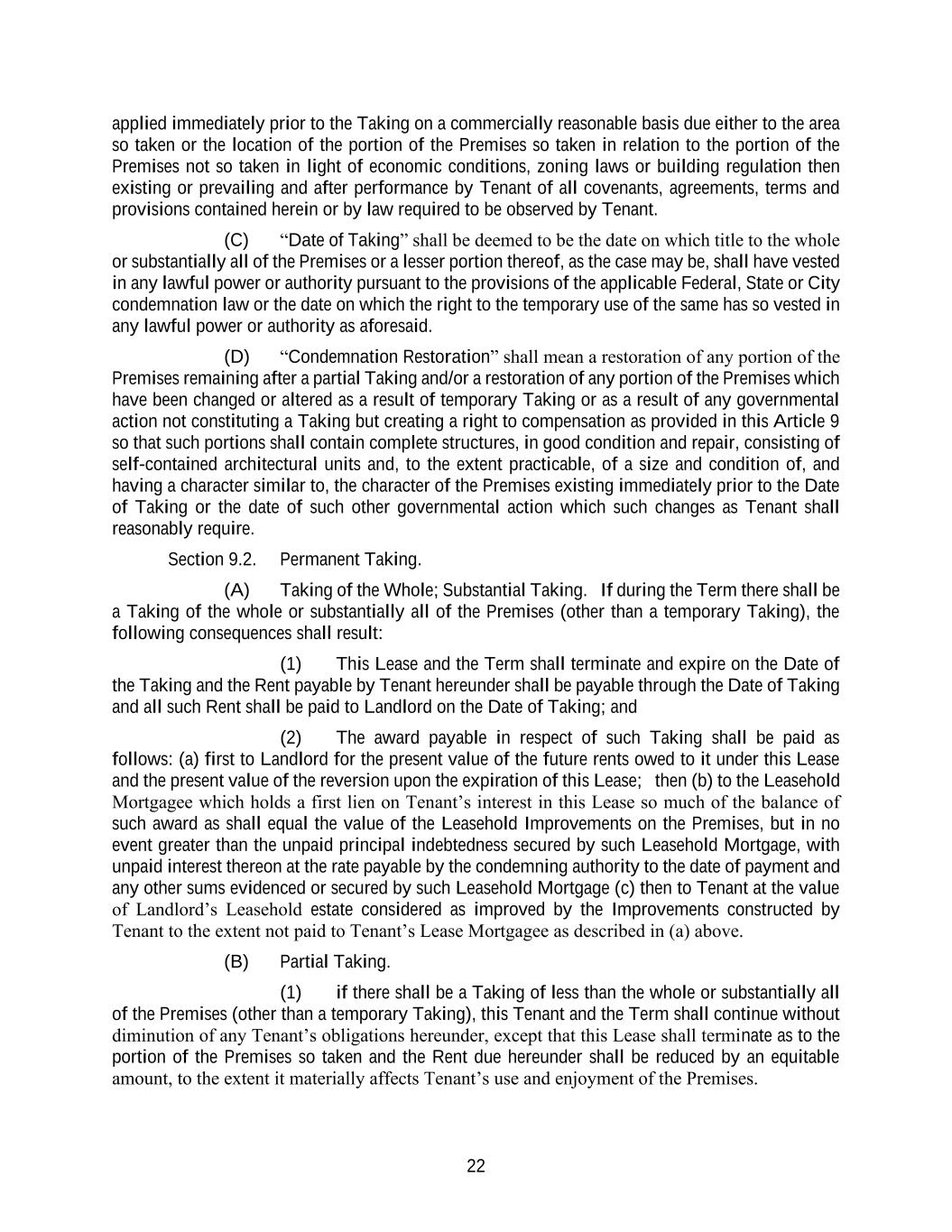 22 applied immediately prior to the Taking on a commercially reasonable basis due either to the area so taken or the location of the portion of the Premises so taken in relation to the portion of the Premises not so taken in light of economic conditions, zoning laws or building regulation then existing or prevailing and after performance by Tenant of all covenants, agreements, terms and provisions contained herein or by law required to be observed by Tenant. (C) “Date of Taking” shall be deemed to be the date on which title to the whole or substantially all of the Premises or a lesser portion thereof, as the case may be, shall have vested in any lawful power or authority pursuant to the provisions of the applicable Federal, State or City condemnation law or the date on which the right to the temporary use of the same has so vested in any lawful power or authority as aforesaid. (D) “Condemnation Restoration” shall mean a restoration of any portion of the Premises remaining after a partial Taking and/or a restoration of any portion of the Premises which have been changed or altered as a result of temporary Taking or as a result of any governmental action not constituting a Taking but creating a right to compensation as provided in this Article 9 so that such portions shall contain complete structures, in good condition and repair, consisting of self-contained architectural units and, to the extent practicable, of a size and condition of, and having a character similar to, the character of the Premises existing immediately prior to the Date of Taking or the date of such other governmental action which such changes as Tenant shall reasonably require. Section 9.2. Permanent Taking. (A) Taking of the Whole; Substantial Taking. If during the Term there shall be a Taking of the whole or substantially all of the Premises (other than a temporary Taking), the following consequences shall result: (1) This Lease and the Term shall terminate and expire on the Date of the Taking and the Rent payable by Tenant hereunder shall be payable through the Date of Taking and all such Rent shall be paid to Landlord on the Date of Taking; and (2) The award payable in respect of such Taking shall be paid as follows: (a) first to Landlord for the present value of the future rents owed to it under this Lease and the present value of the reversion upon the expiration of this Lease; then (b) to the Leasehold Mortgagee which holds a first lien on Tenant’s interest in this Lease so much of the balance of such award as shall equal the value of the Leasehold Improvements on the Premises, but in no event greater than the unpaid principal indebtedness secured by such Leasehold Mortgage, with unpaid interest thereon at the rate payable by the condemning authority to the date of payment and any other sums evidenced or secured by such Leasehold Mortgage (c) then to Tenant at the value of Landlord’s Leasehold estate considered as improved by the Improvements constructed by Tenant to the extent not paid to Tenant’s Lease Mortgagee as described in (a) above. (B) Partial Taking. (1) if there shall be a Taking of less than the whole or substantially all of the Premises (other than a temporary Taking), this Tenant and the Term shall continue without diminution of any Tenant’s obligations hereunder, except that this Lease shall terminate as to the portion of the Premises so taken and the Rent due hereunder shall be reduced by an equitable amount, to the extent it materially affects Tenant’s use and enjoyment of the Premises.