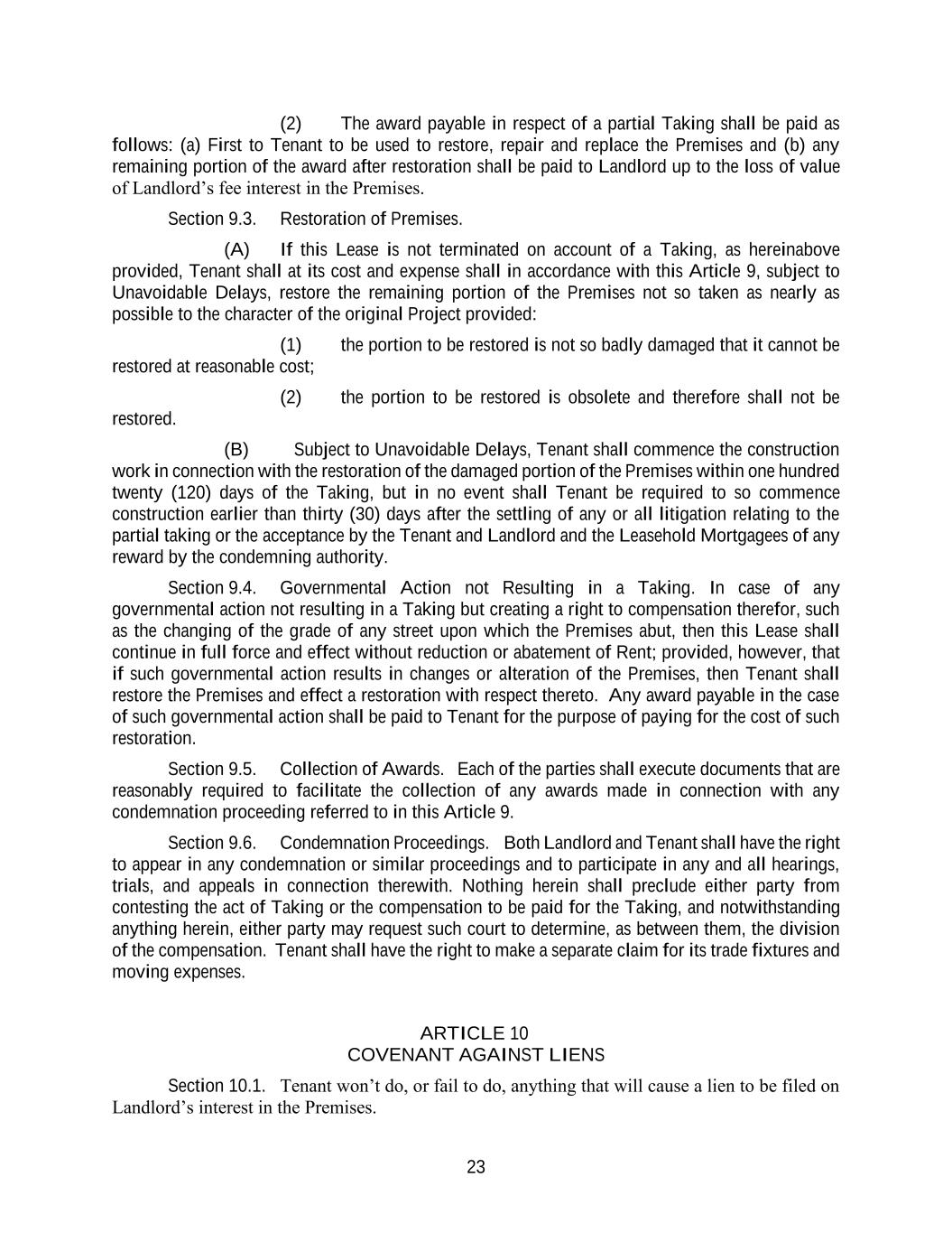 23 (2) The award payable in respect of a partial Taking shall be paid as follows: (a) First to Tenant to be used to restore, repair and replace the Premises and (b) any remaining portion of the award after restoration shall be paid to Landlord up to the loss of value of Landlord’s fee interest in the Premises. Section 9.3. Restoration of Premises. (A) If this Lease is not terminated on account of a Taking, as hereinabove provided, Tenant shall at its cost and expense shall in accordance with this Article 9, subject to Unavoidable Delays, restore the remaining portion of the Premises not so taken as nearly as possible to the character of the original Project provided: (1) the portion to be restored is not so badly damaged that it cannot be restored at reasonable cost; (2) the portion to be restored is obsolete and therefore shall not be restored. (B) Subject to Unavoidable Delays, Tenant shall commence the construction work in connection with the restoration of the damaged portion of the Premises within one hundred twenty (120) days of the Taking, but in no event shall Tenant be required to so commence construction earlier than thirty (30) days after the settling of any or all litigation relating to the partial taking or the acceptance by the Tenant and Landlord and the Leasehold Mortgagees of any reward by the condemning authority. Section 9.4. Governmental Action not Resulting in a Taking. In case of any governmental action not resulting in a Taking but creating a right to compensation therefor, such as the changing of the grade of any street upon which the Premises abut, then this Lease shall continue in full force and effect without reduction or abatement of Rent; provided, however, that if such governmental action results in changes or alteration of the Premises, then Tenant shall restore the Premises and effect a restoration with respect thereto. Any award payable in the case of such governmental action shall be paid to Tenant for the purpose of paying for the cost of such restoration. Section 9.5. Collection of Awards. Each of the parties shall execute documents that are reasonably required to facilitate the collection of any awards made in connection with any condemnation proceeding referred to in this Article 9. Section 9.6. Condemnation Proceedings. Both Landlord and Tenant shall have the right to appear in any condemnation or similar proceedings and to participate in any and all hearings, trials, and appeals in connection therewith. Nothing herein shall preclude either party from contesting the act of Taking or the compensation to be paid for the Taking, and notwithstanding anything herein, either party may request such court to determine, as between them, the division of the compensation. Tenant shall have the right to make a separate claim for its trade fixtures and moving expenses. ARTICLE 10 COVENANT AGAINST LIENS Section 10.1. Tenant won’t do, or fail to do, anything that will cause a lien to be filed on Landlord’s interest in the Premises.